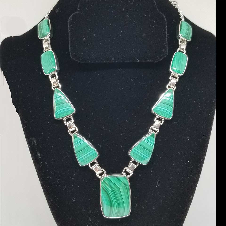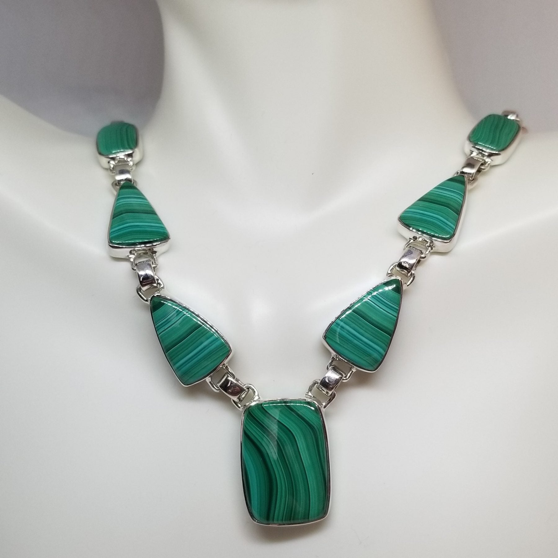 This is a one off. This Malachite Statement necklace is 20" (adjustable) with green and black running through the stones. This necklace has exceptional circles of green Malachite that look to almost have movement. Natural Malachite has flow and engery in its lines, circles, and designs resulting in a feeling of calm and welcoming.