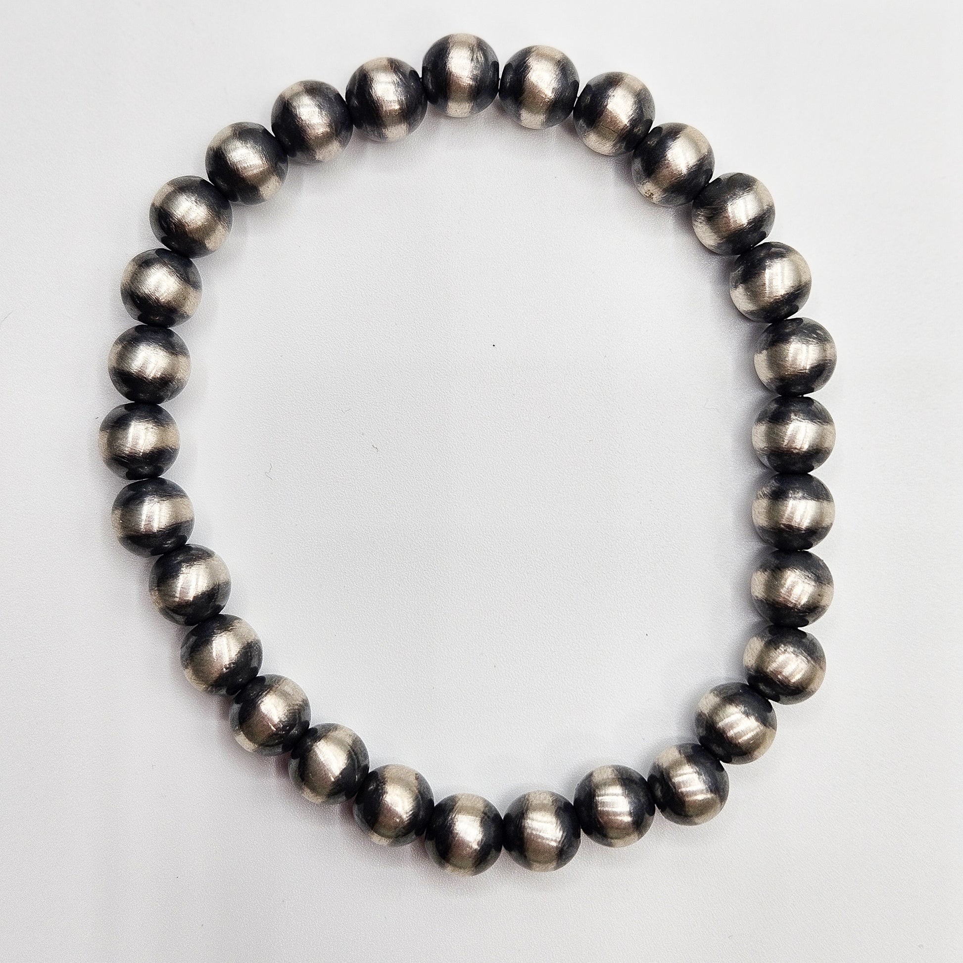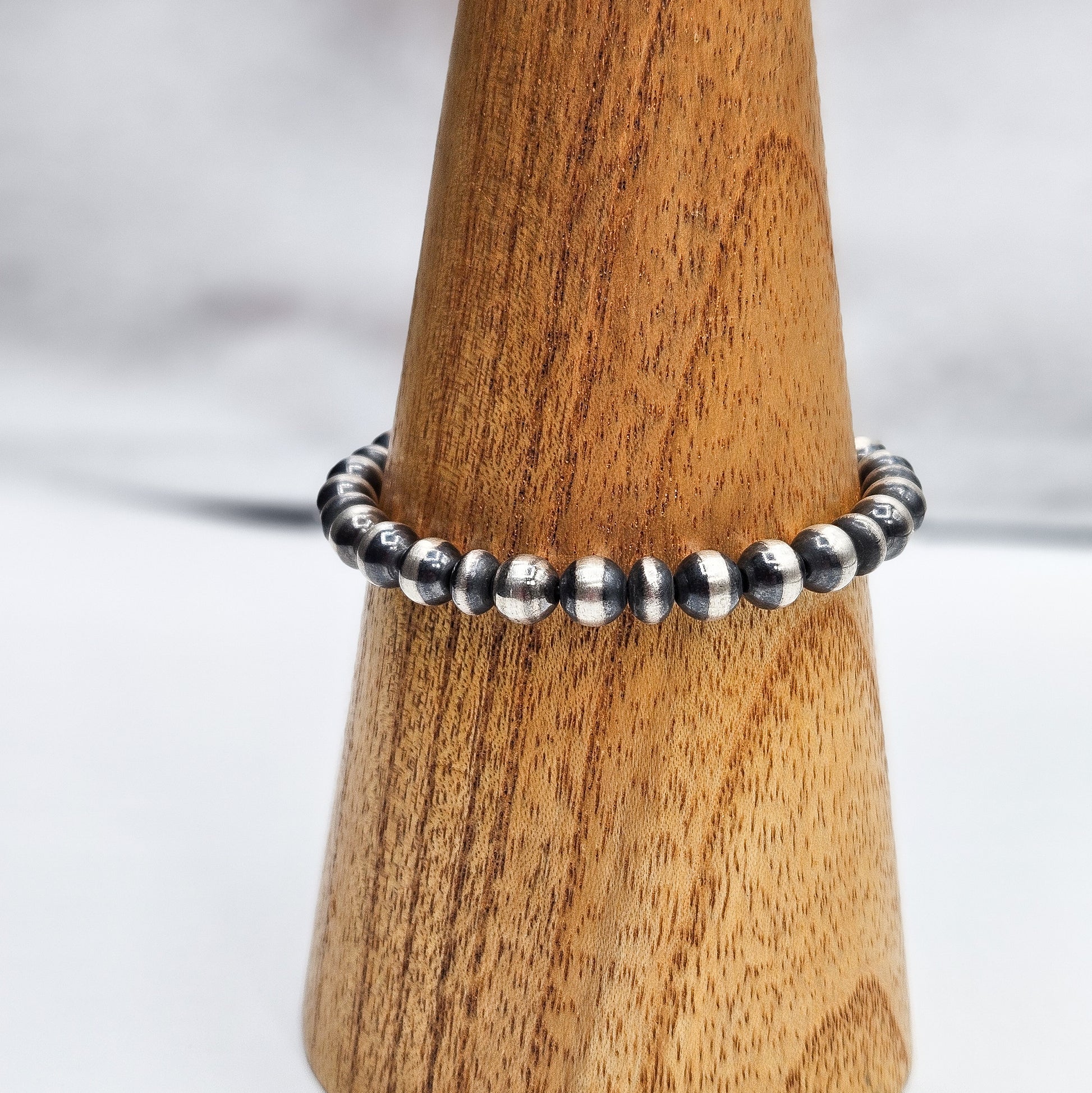 7" Navajo bead bracelet with 6mm silver beads . This bracelet is strung on elastic cord to make it adjustable to most wrist sizes. These bracelets are one of a kind with no two exactly the same and created by indigenous artists.