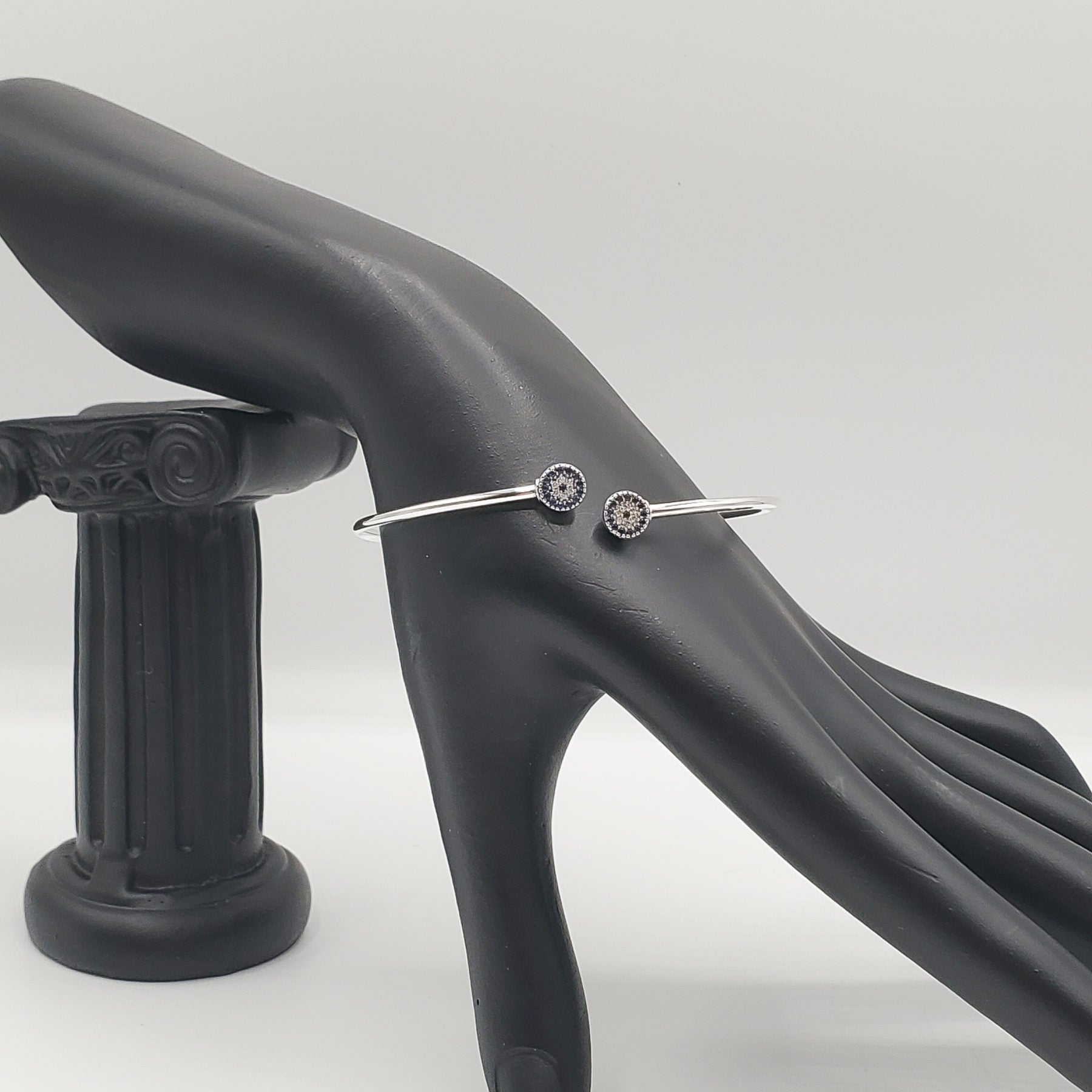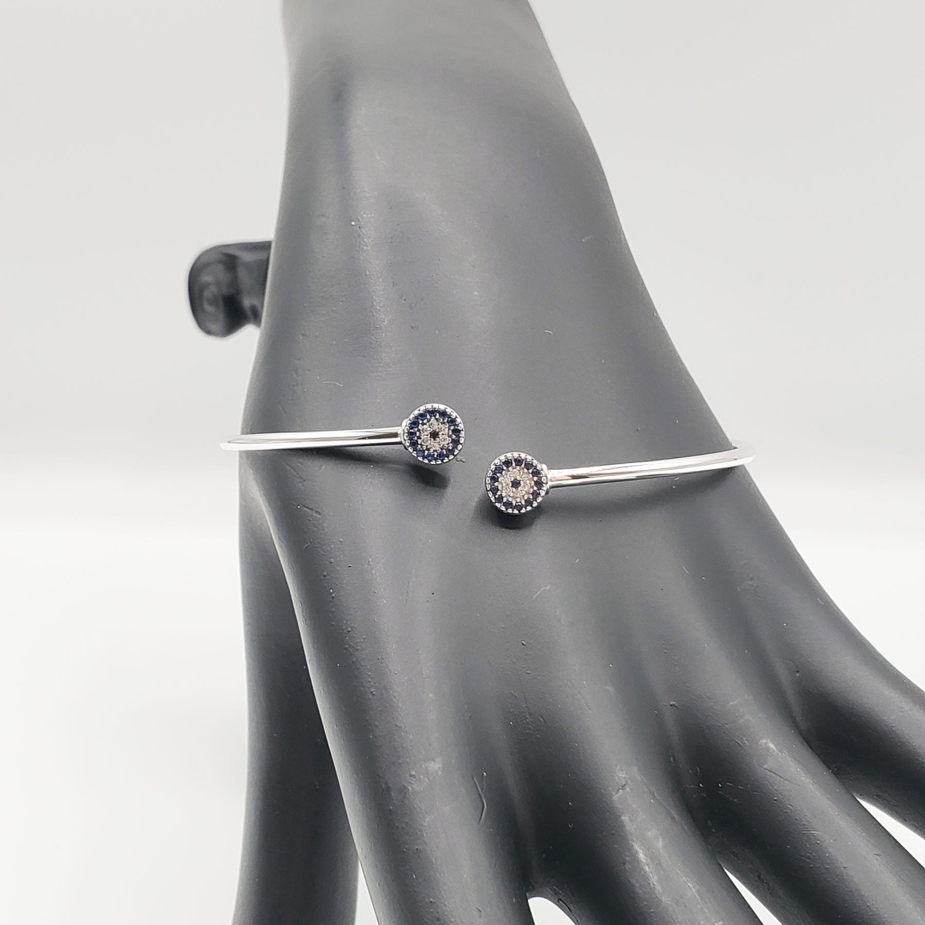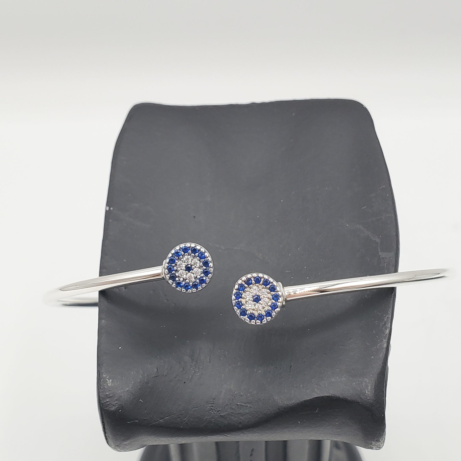 .925 Lucky Eye Open cuff bangle bracelet set with blue and white crystals. Adjustable to 8"