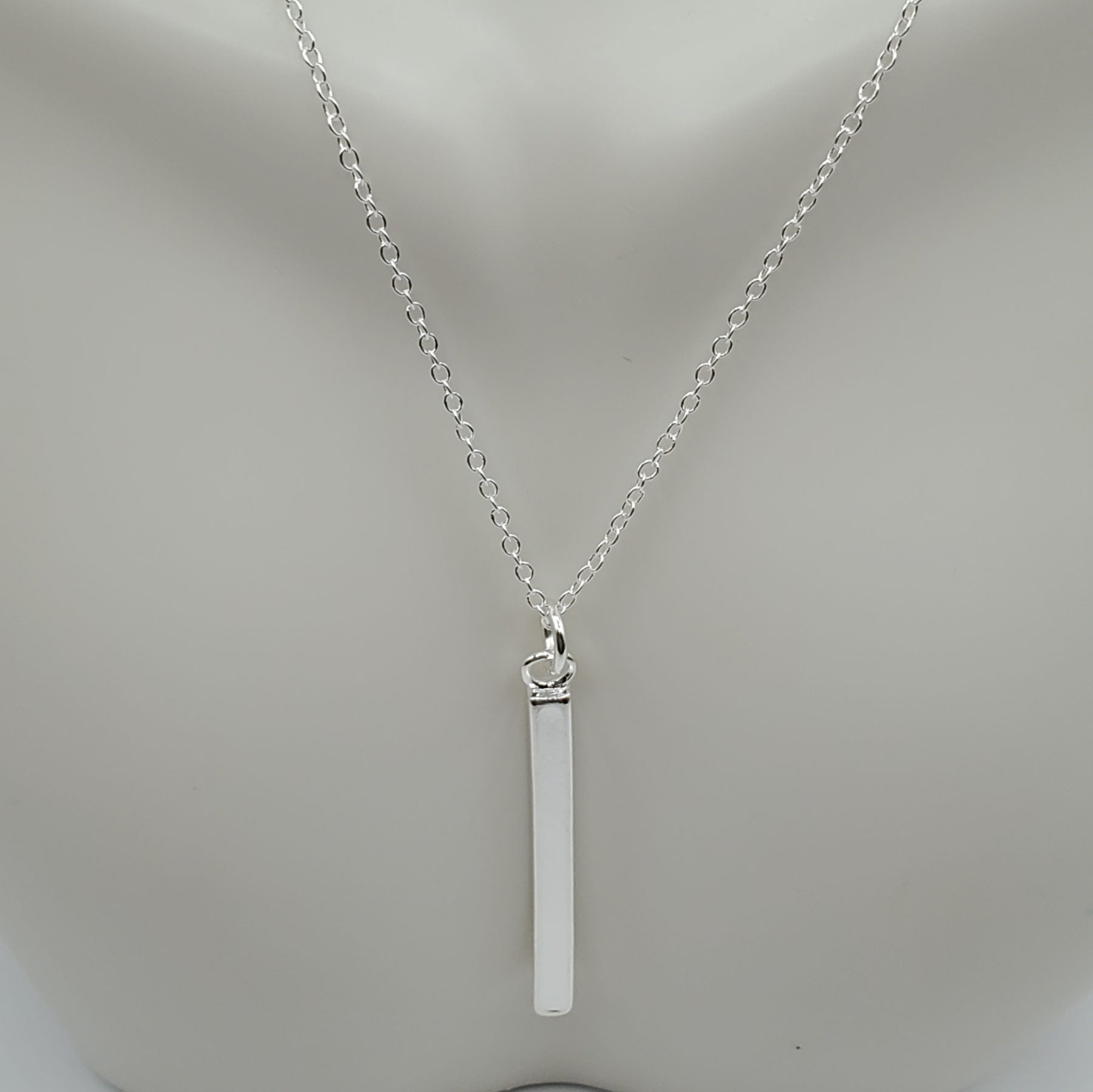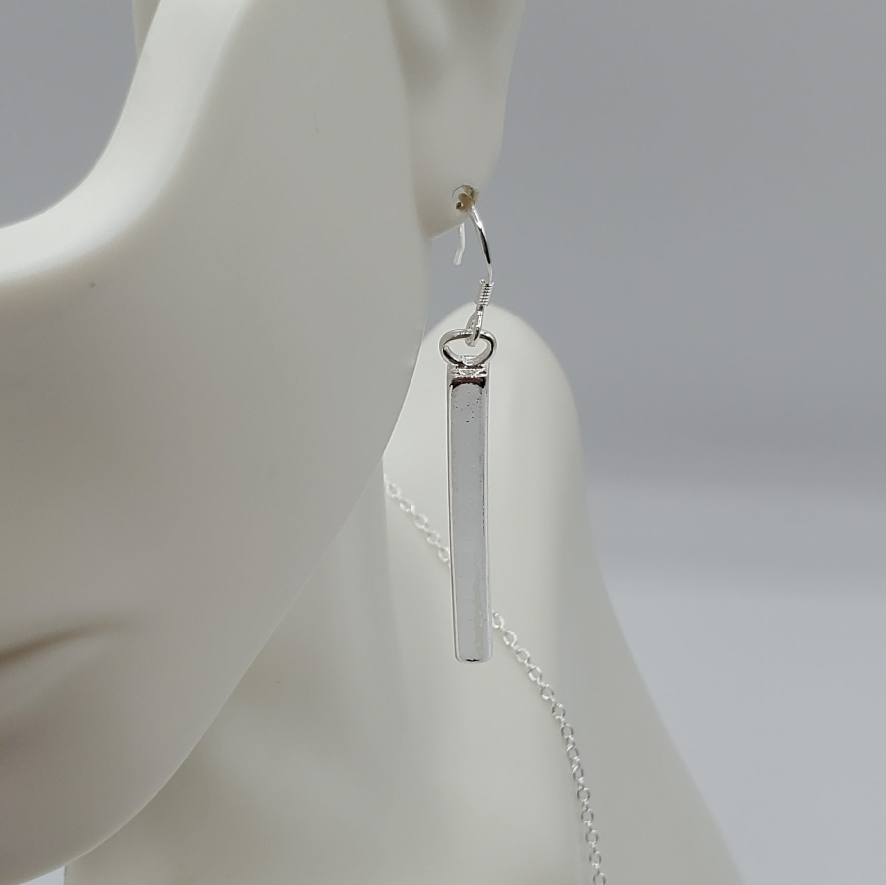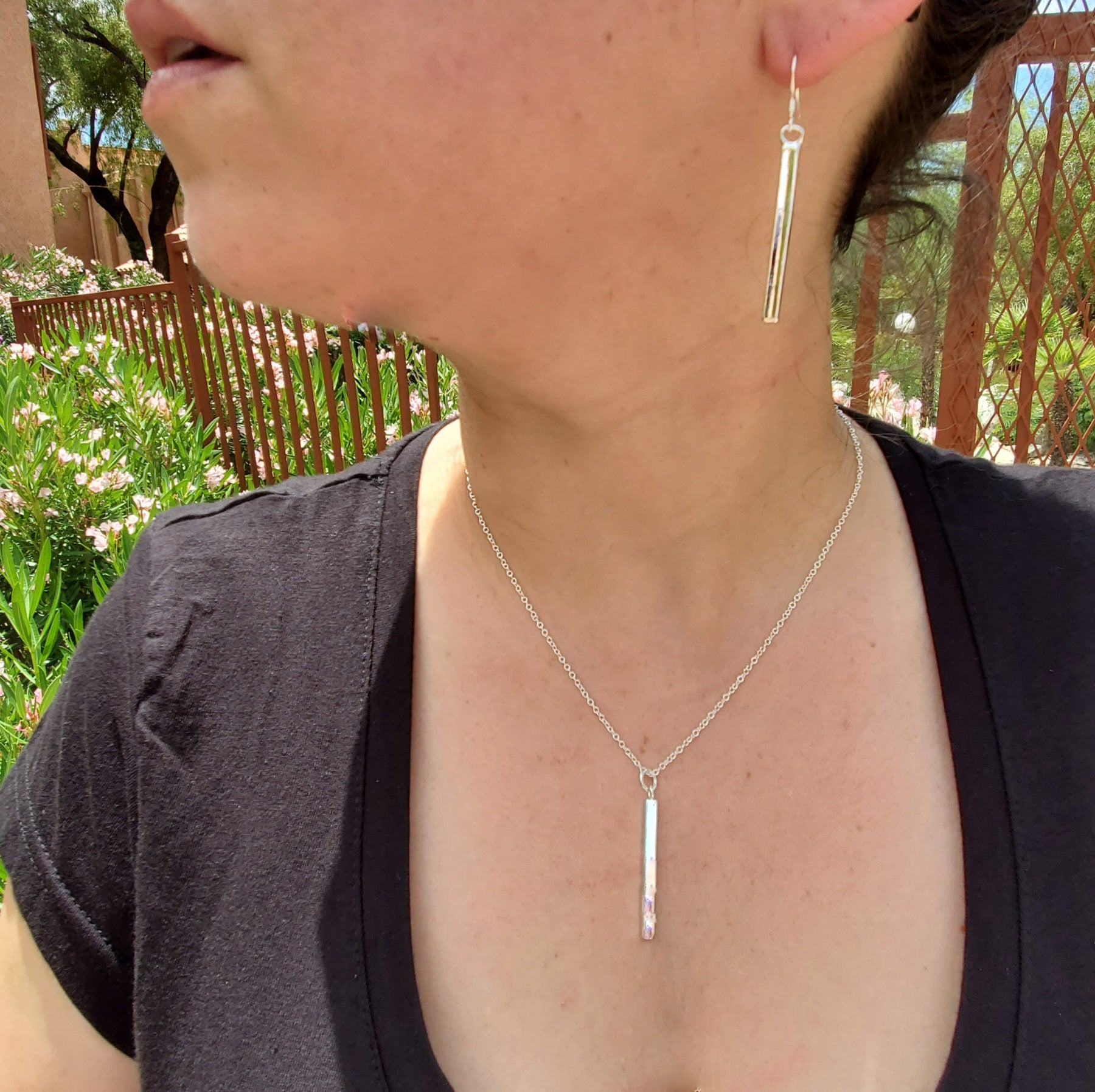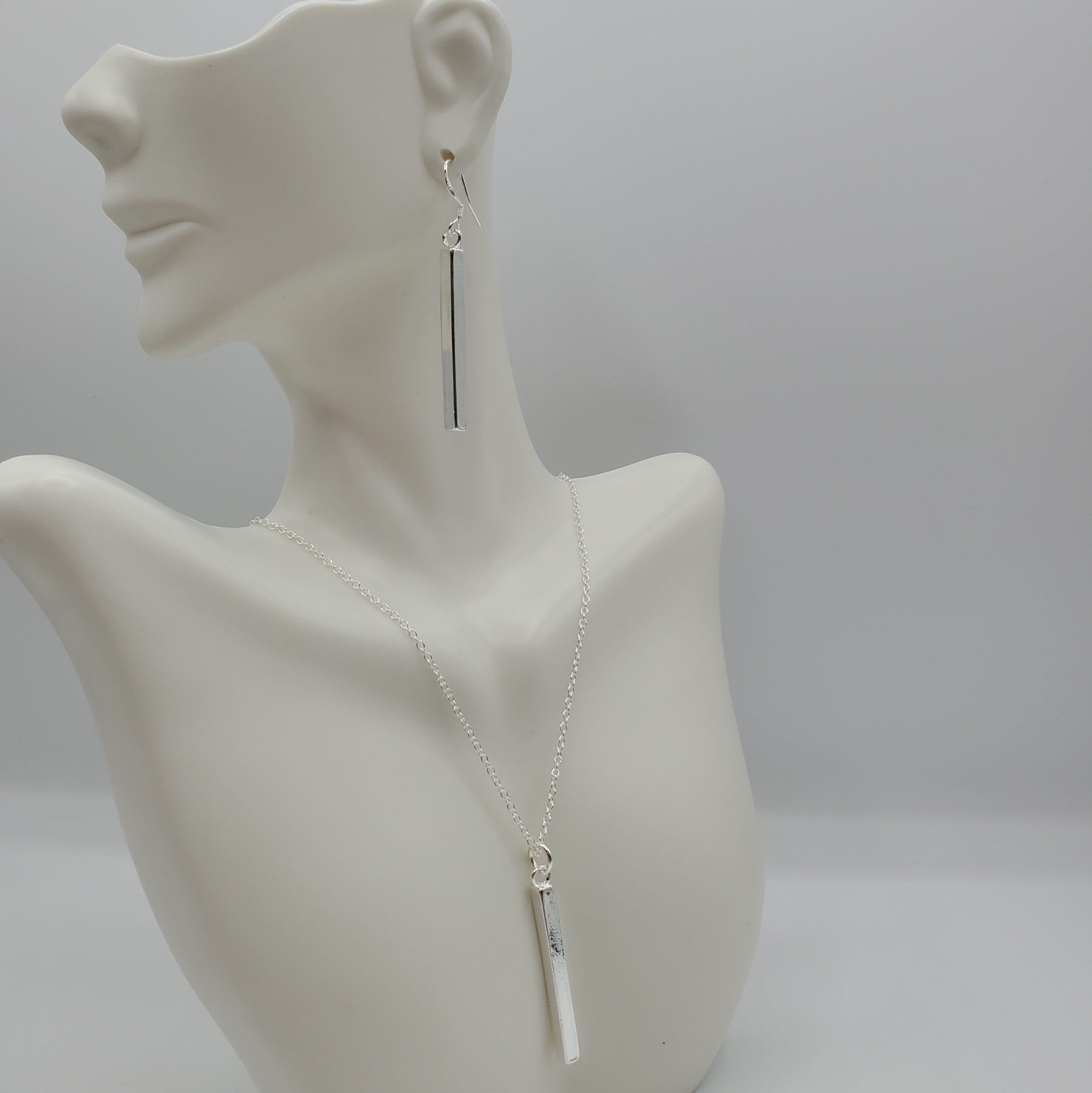 .925 Silver vertical column necklace with earrings set. Pendant and earring length is 8mm. Chain included is 18"