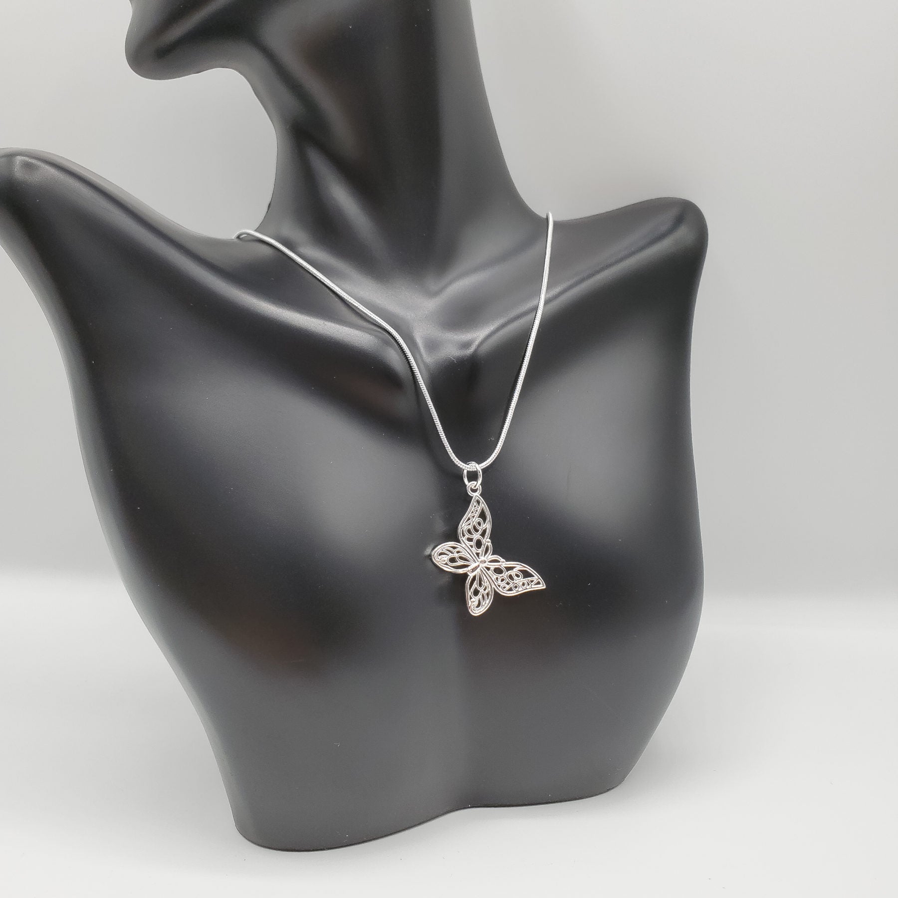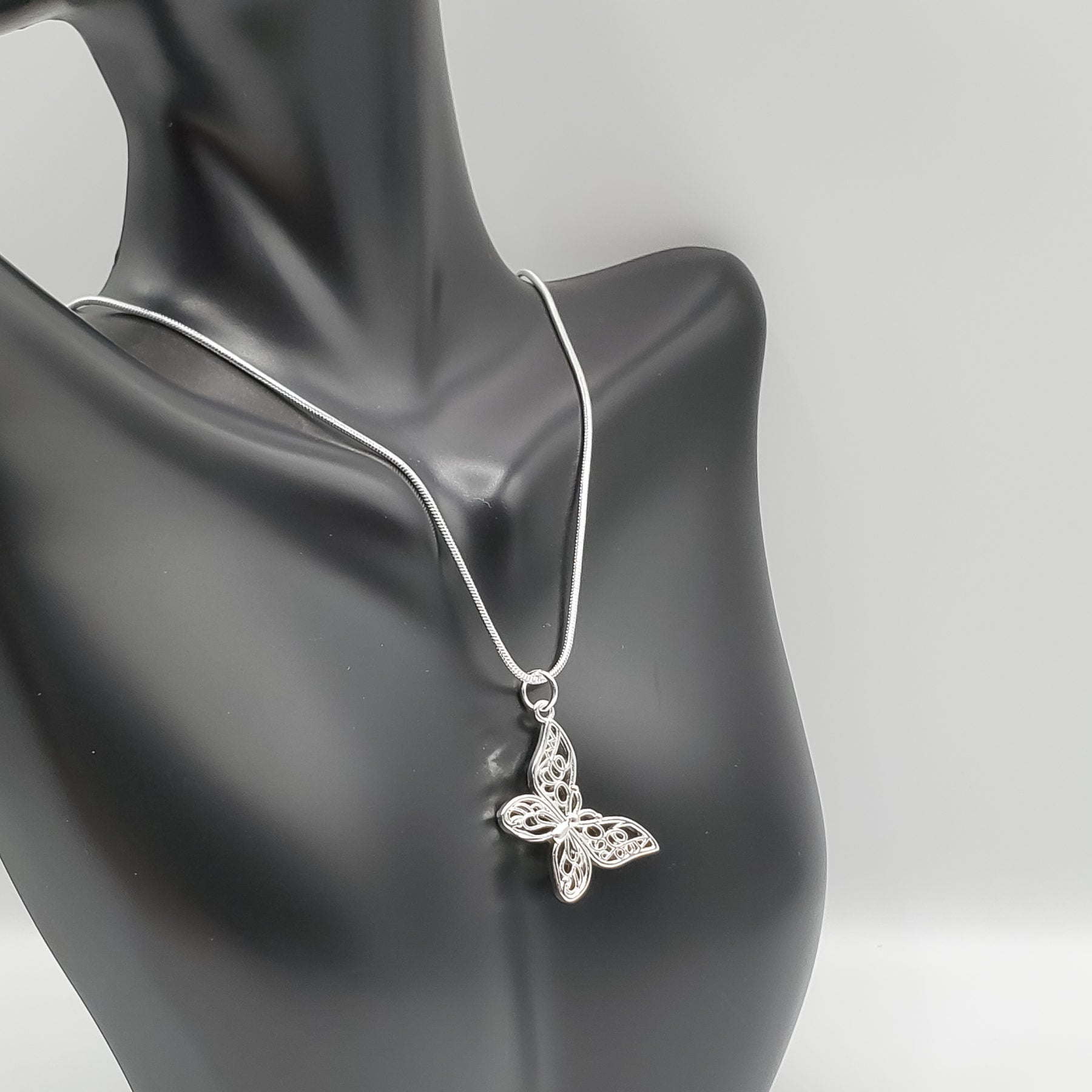 .925 Sterling Silver Butterfly necklace. Butterfly is 17mm wide and 24mm in length. Chain shown is sold with necklace.