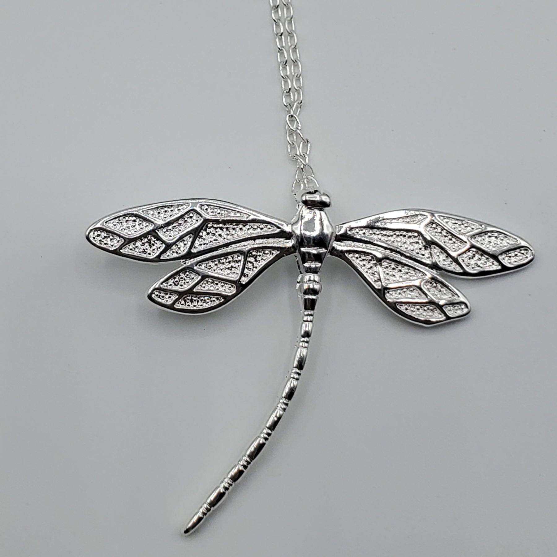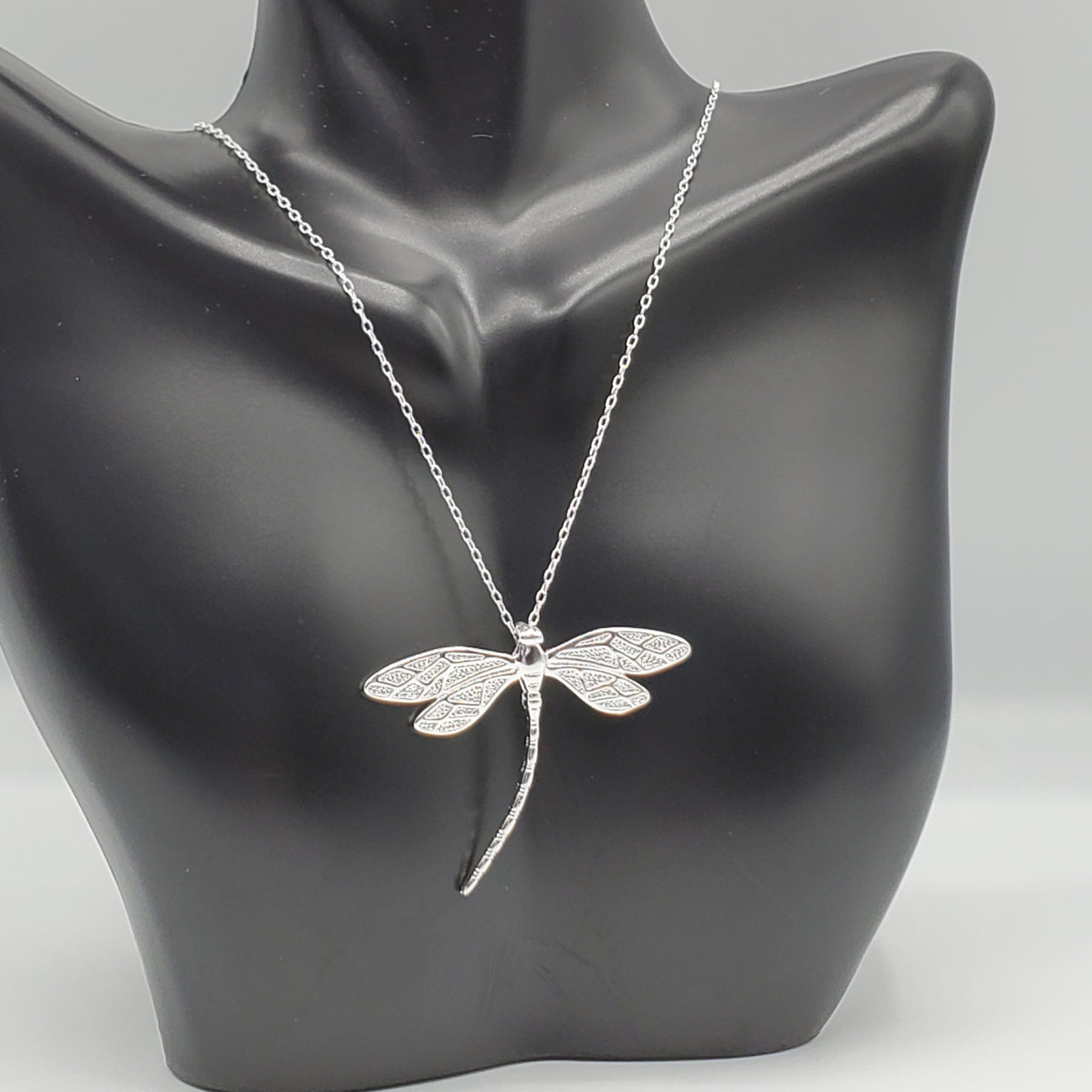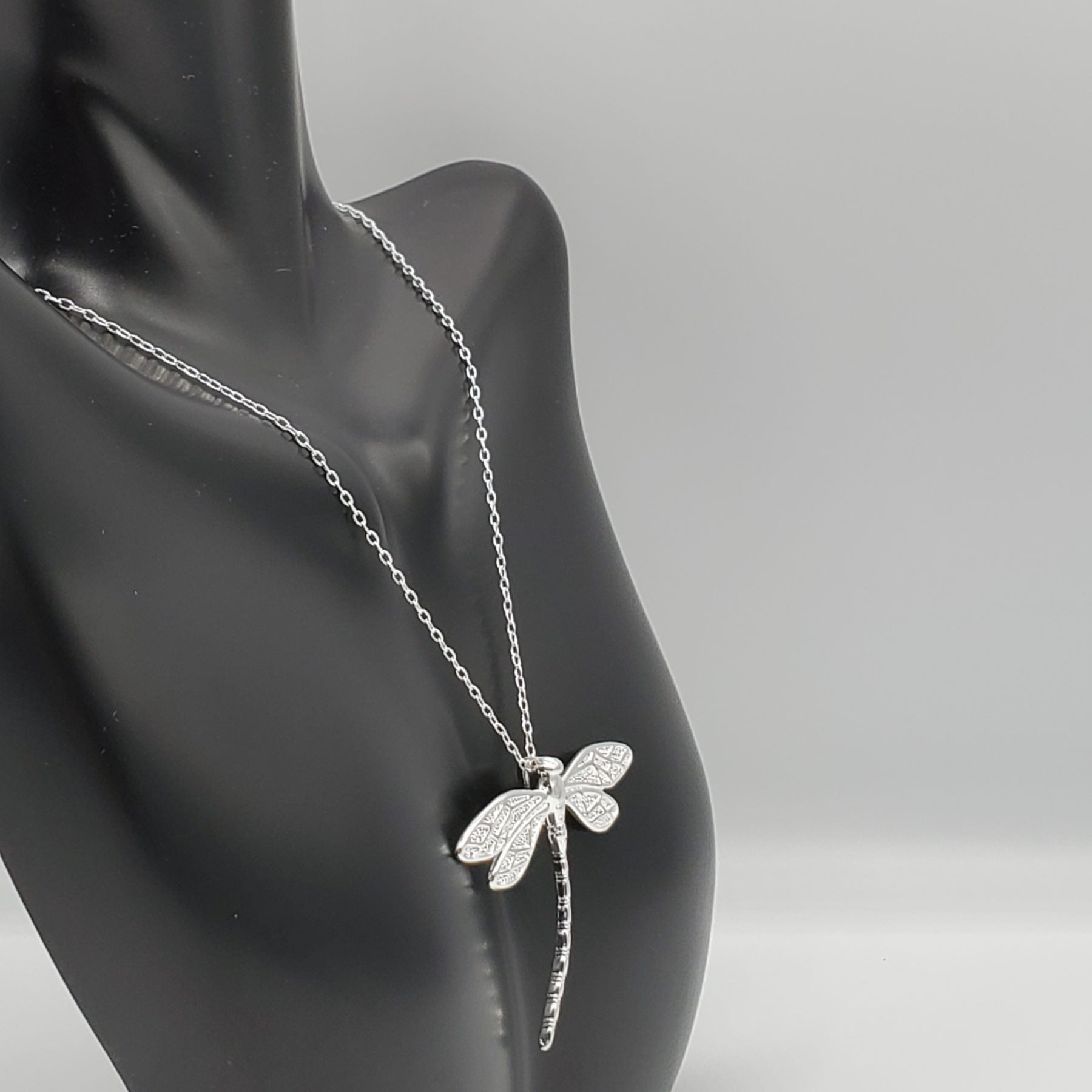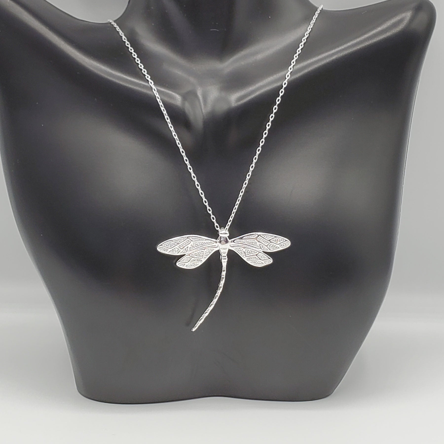 .925 Sterling Silver Dragonfly Pendant with 18" chain. The pendant is 37.5mm in length and 44mm in width.