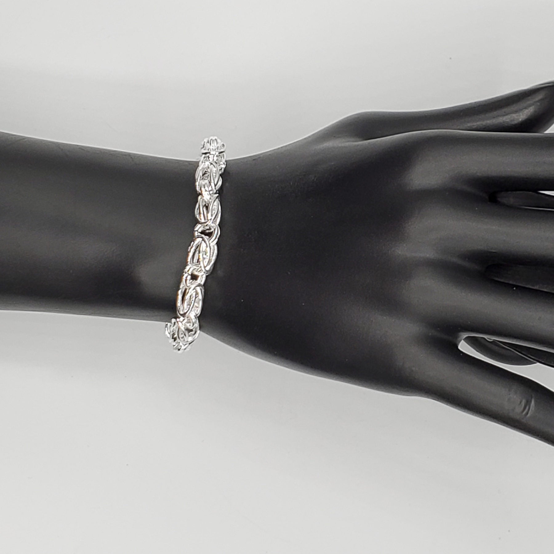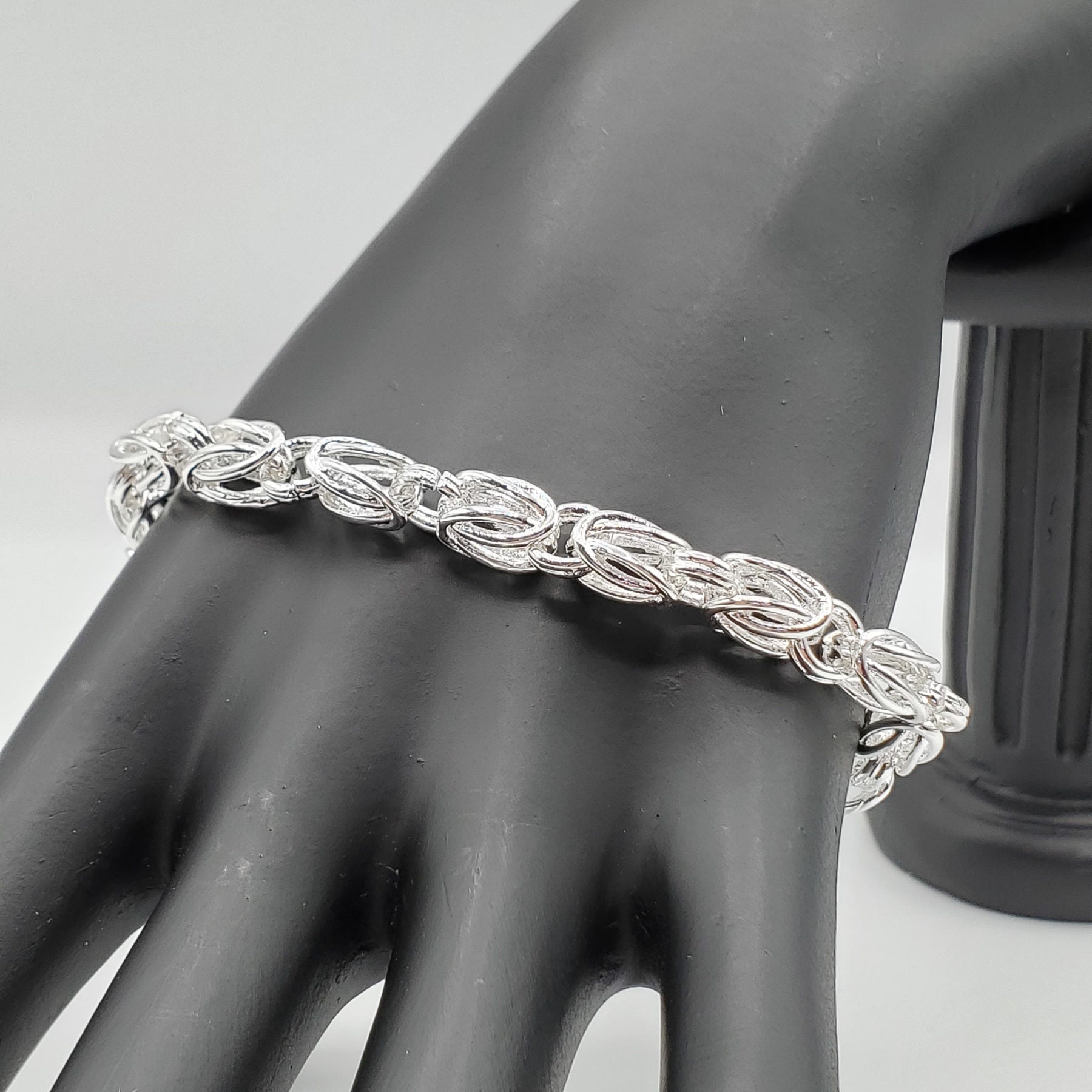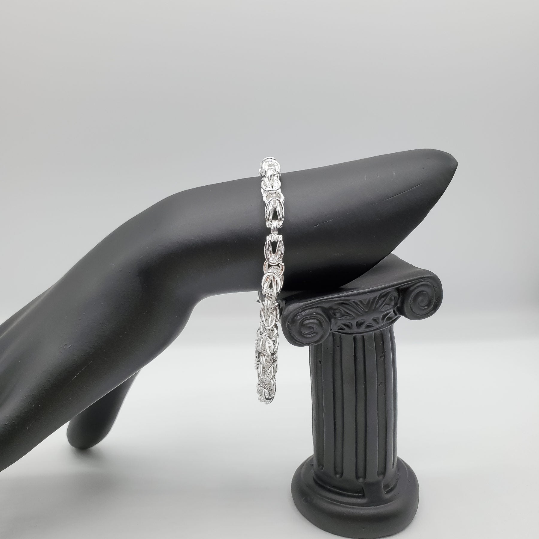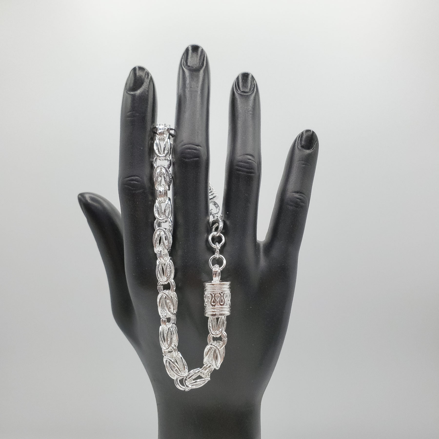 .925 Sterling Silver geometric chain link bracelet with lantern barrel beads on each end. The Bracelet is 7" adjustable to 8" with a lobster claw clasp and it does have some weight to it.
