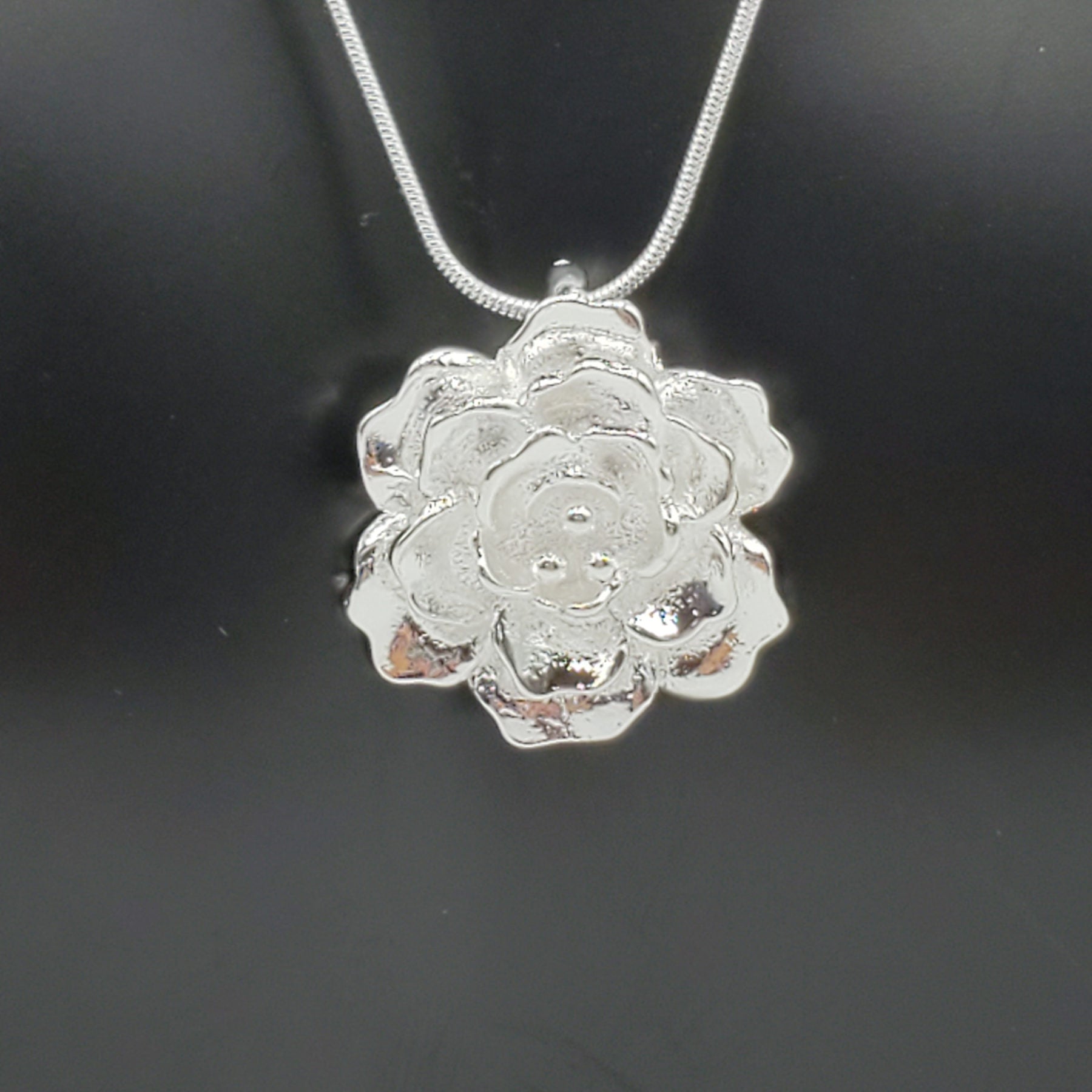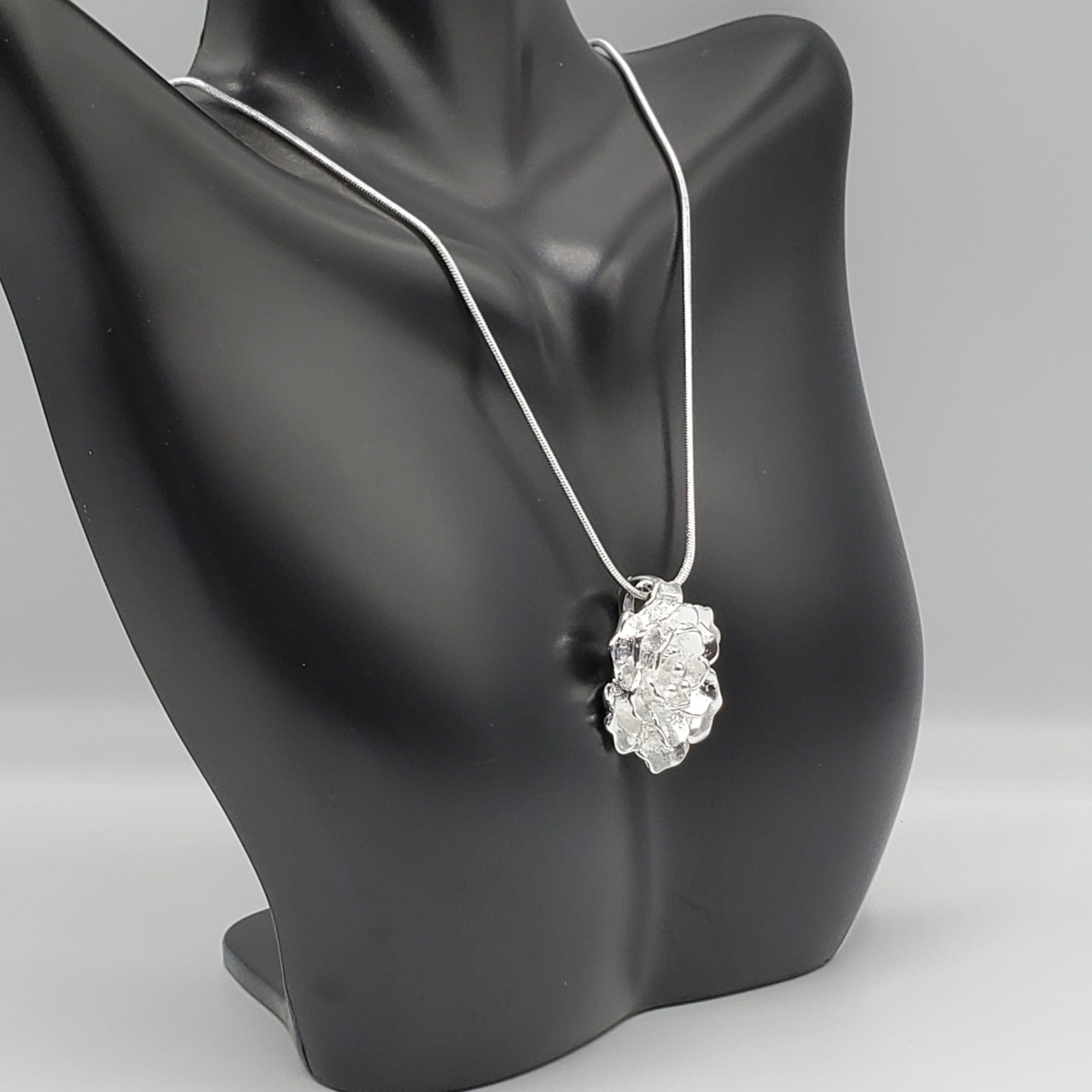 .925 sterling silver Hawaiian style Flower 18" necklace. Plumeria Flower is 26mm in length and 23mm wide Floating on a snake chain..