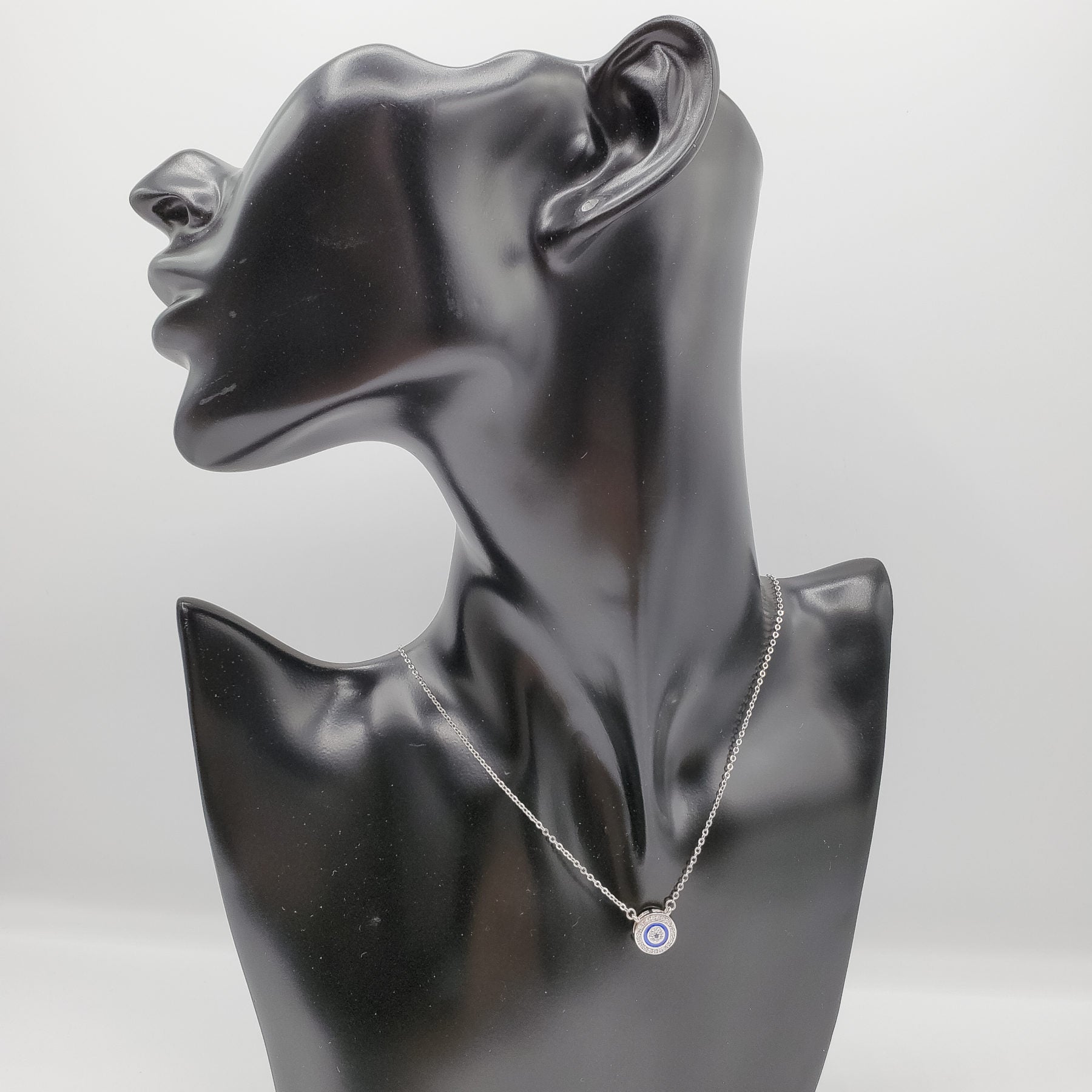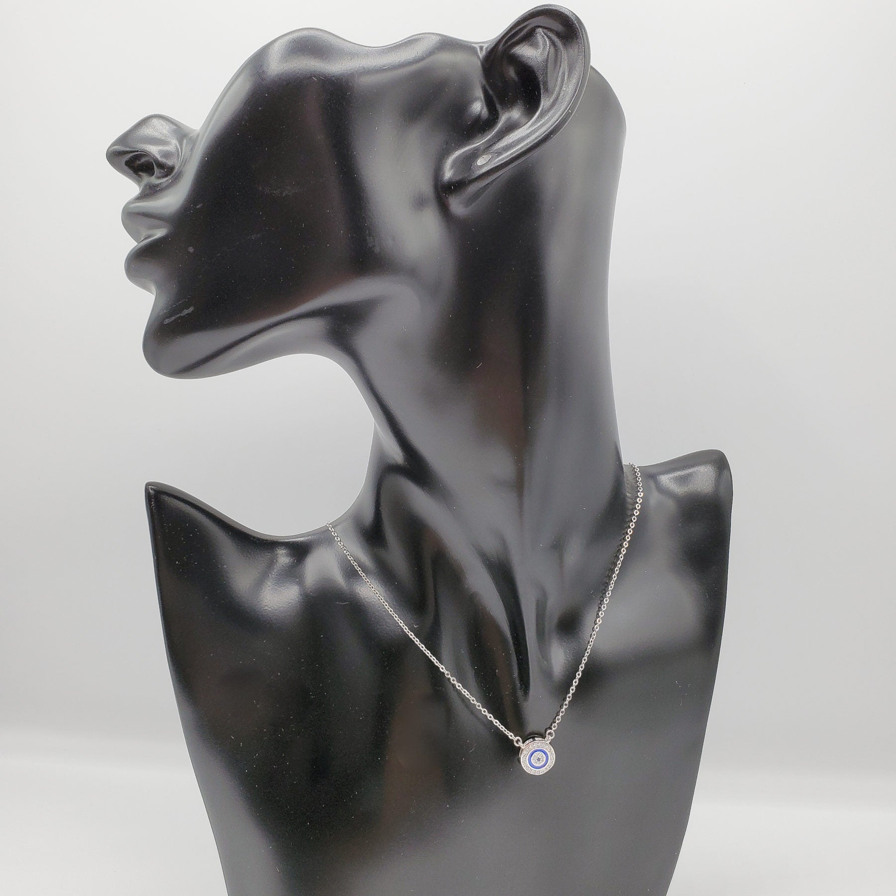 .925 Sterling Silver Lucky Eye necklace set with blue enamel and clear swarovski crystals. Pendant size is 10mm in diameter and chain is 18". It can stand on its own or it is perfect for layering with other necklaces.