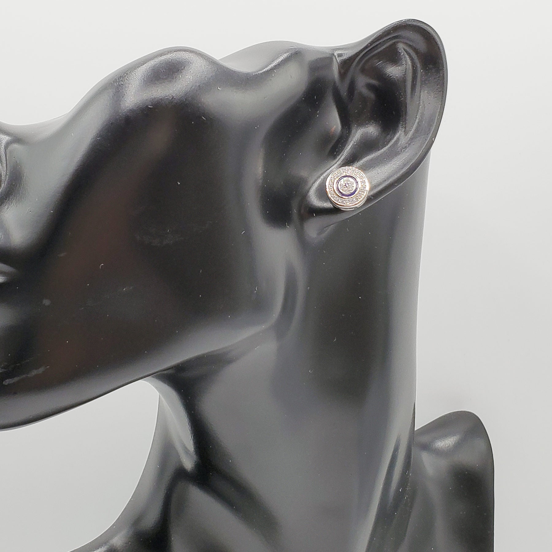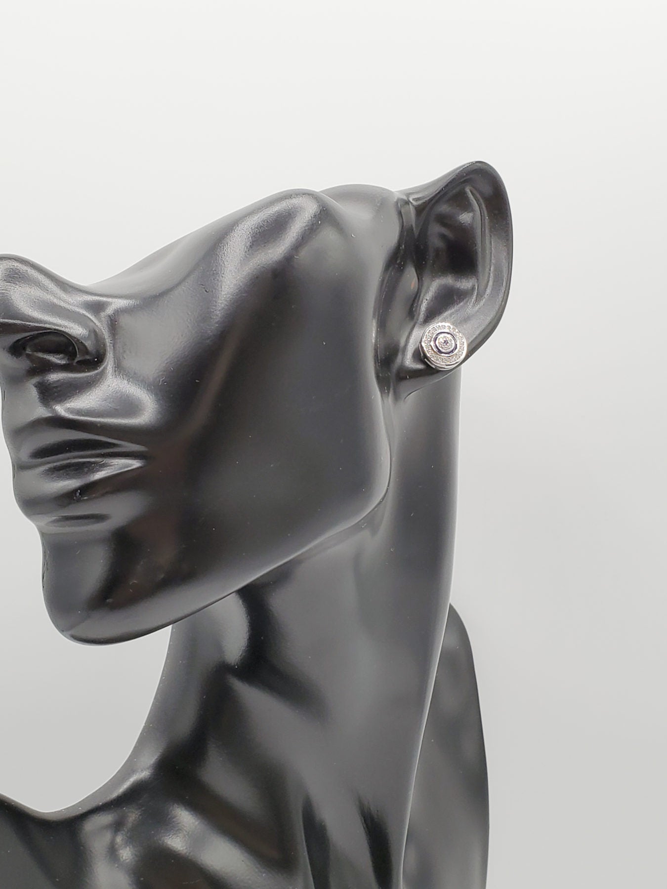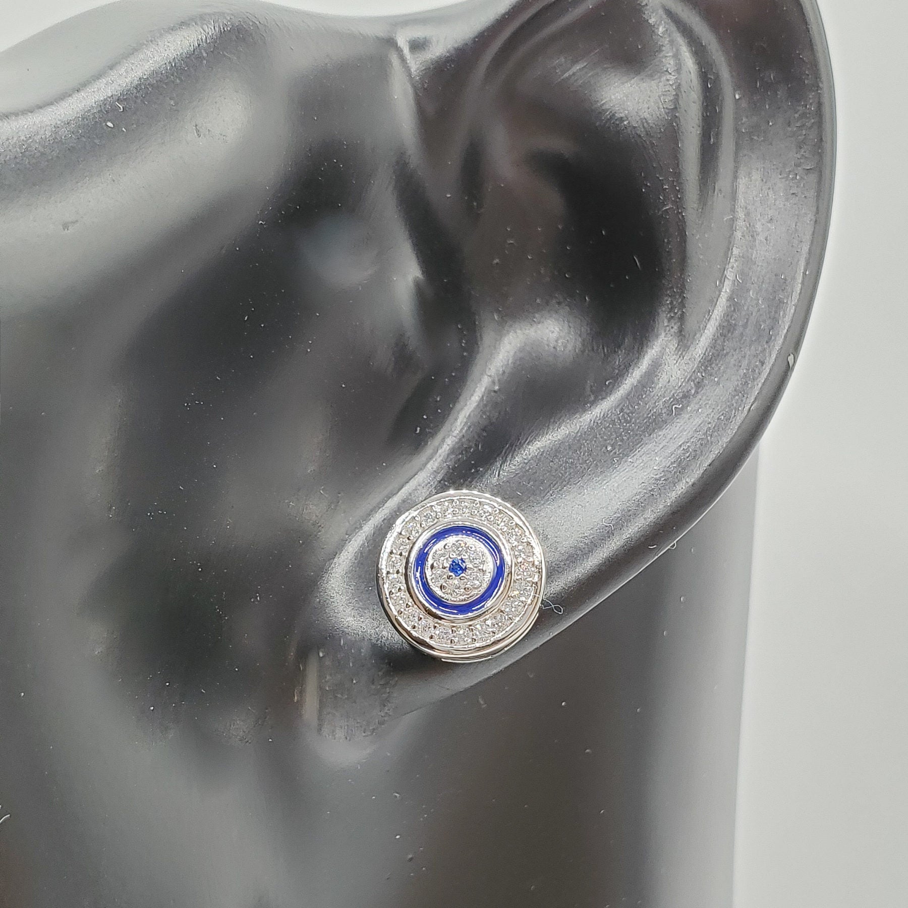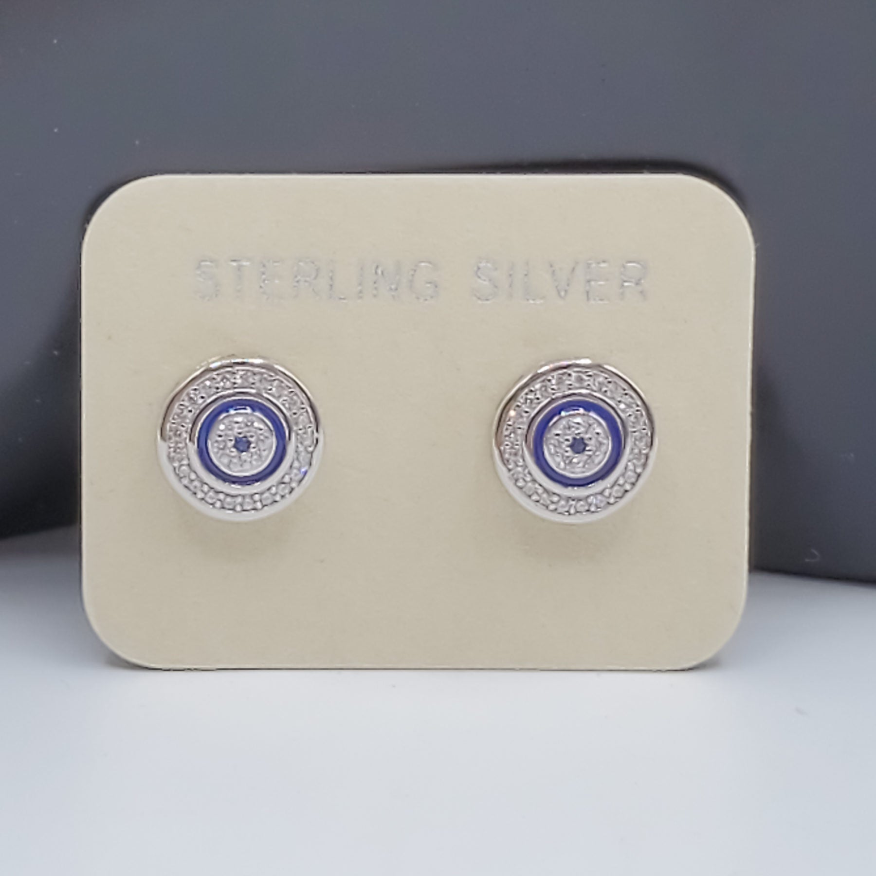 .925 Sterling silver lucky eye stud earrings. Stud is 10 mm in diameter with blue sapphire enamel and clear crystal accents. These earrings coordinate well with item #659 and 658 in this inventory.