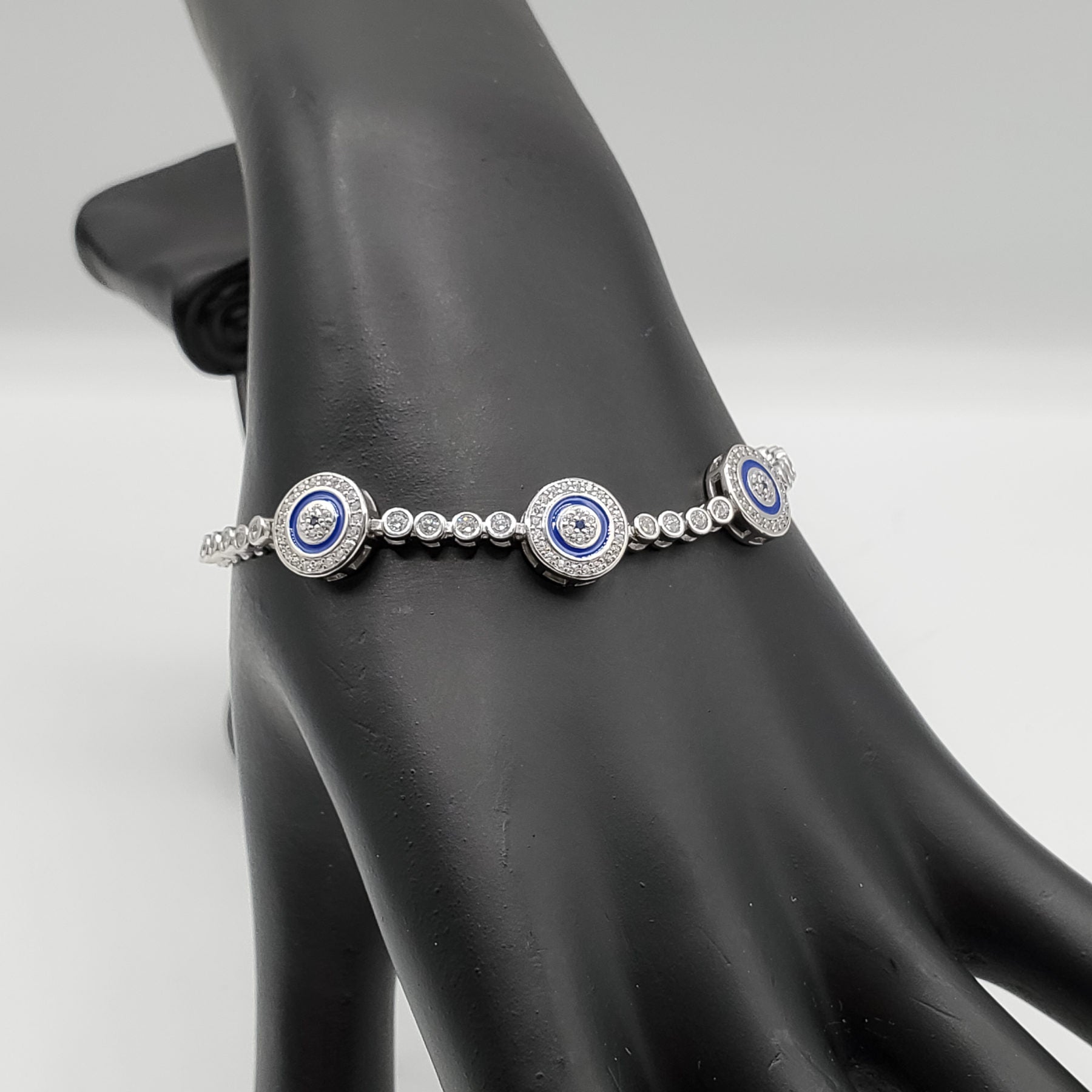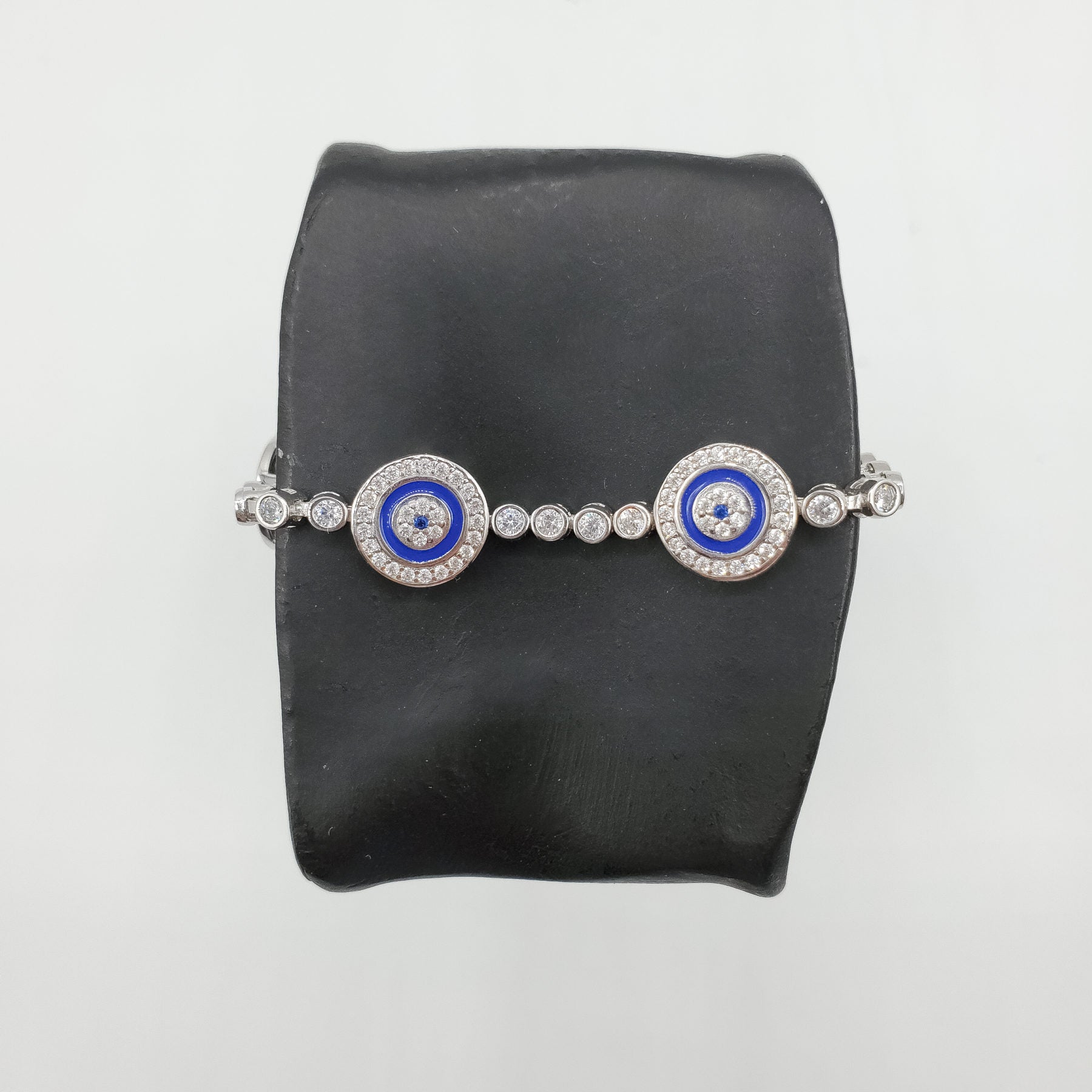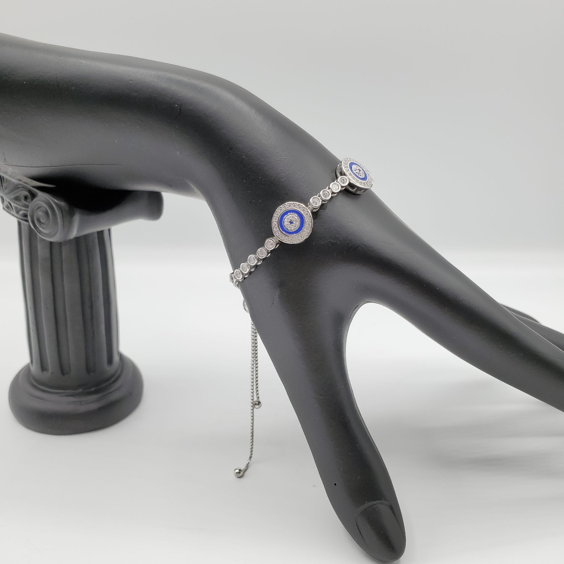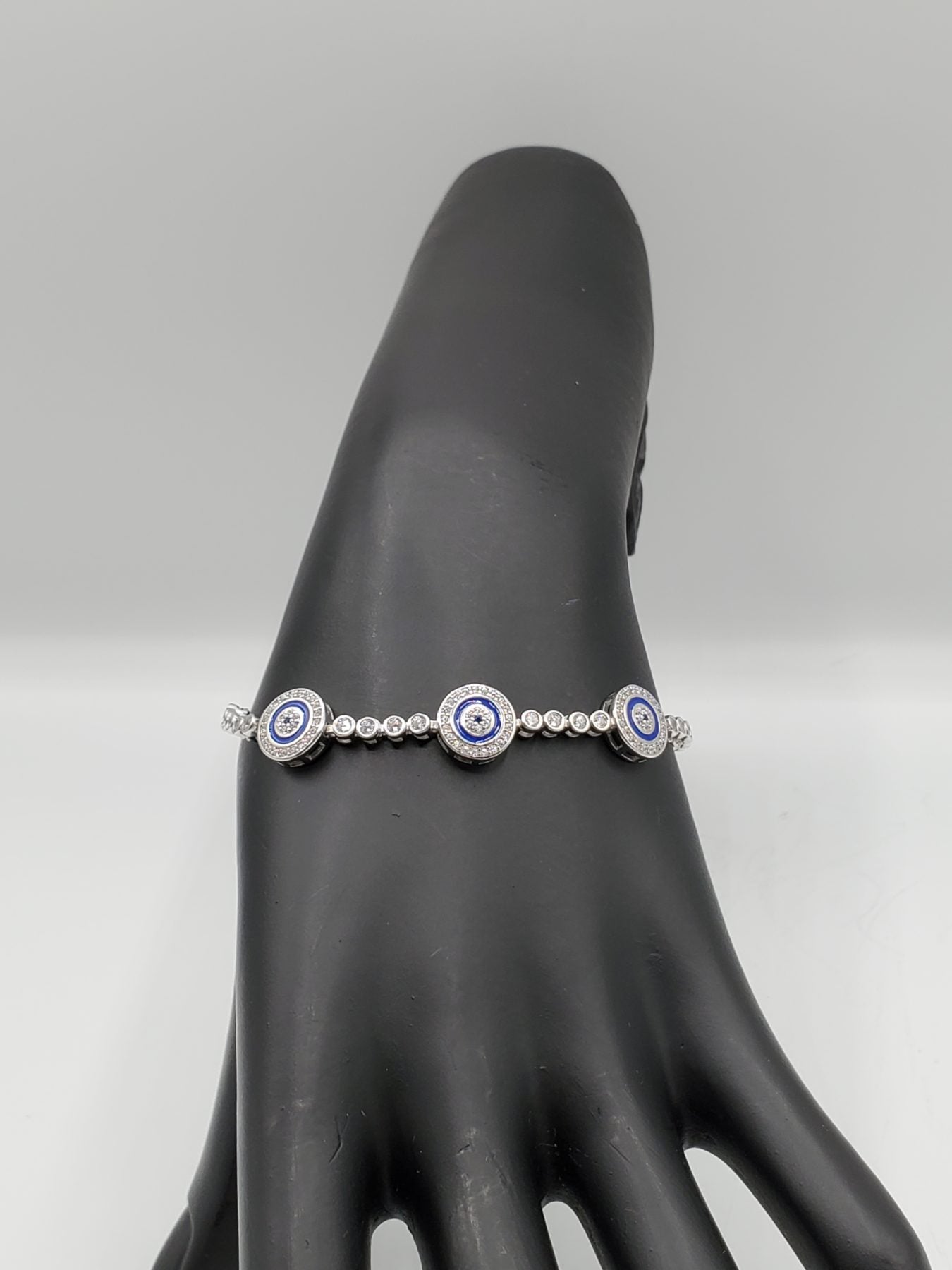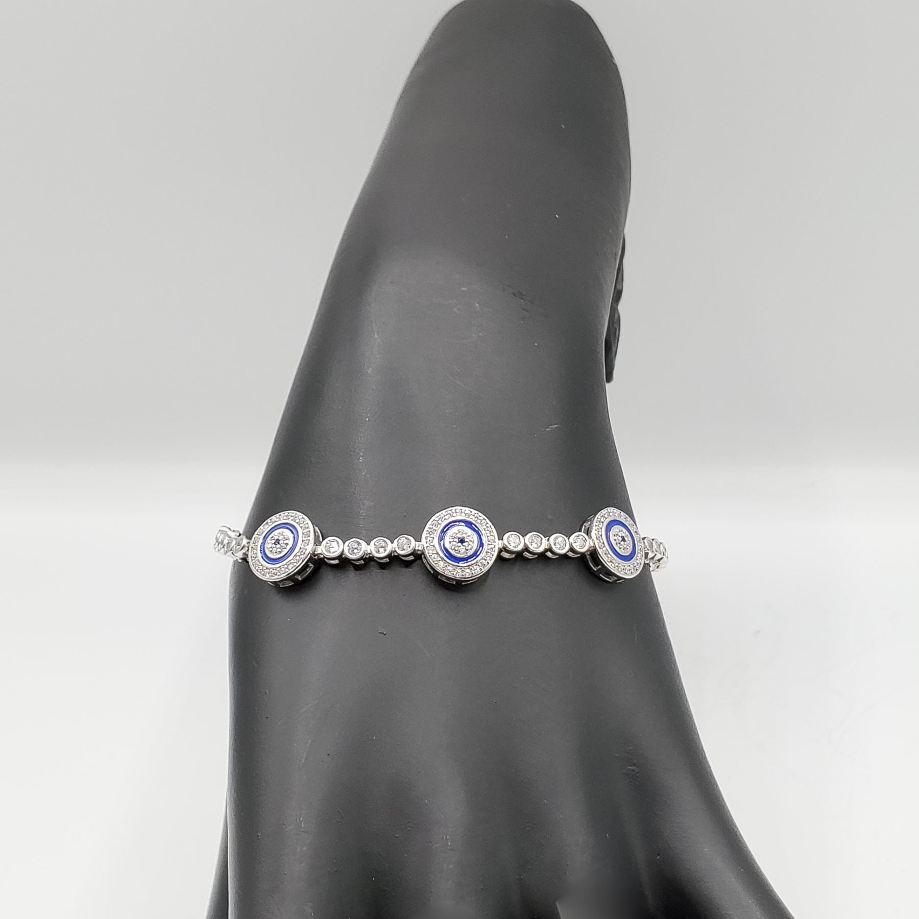 .925 Sterling silver lucky eye tennis bracelet with 3 10mm round eyes of blue enamel and clear crystals with a lariat clasp which makes this item adjustable to 8". You will be getting many compliments because of the understated elegance of this piece.