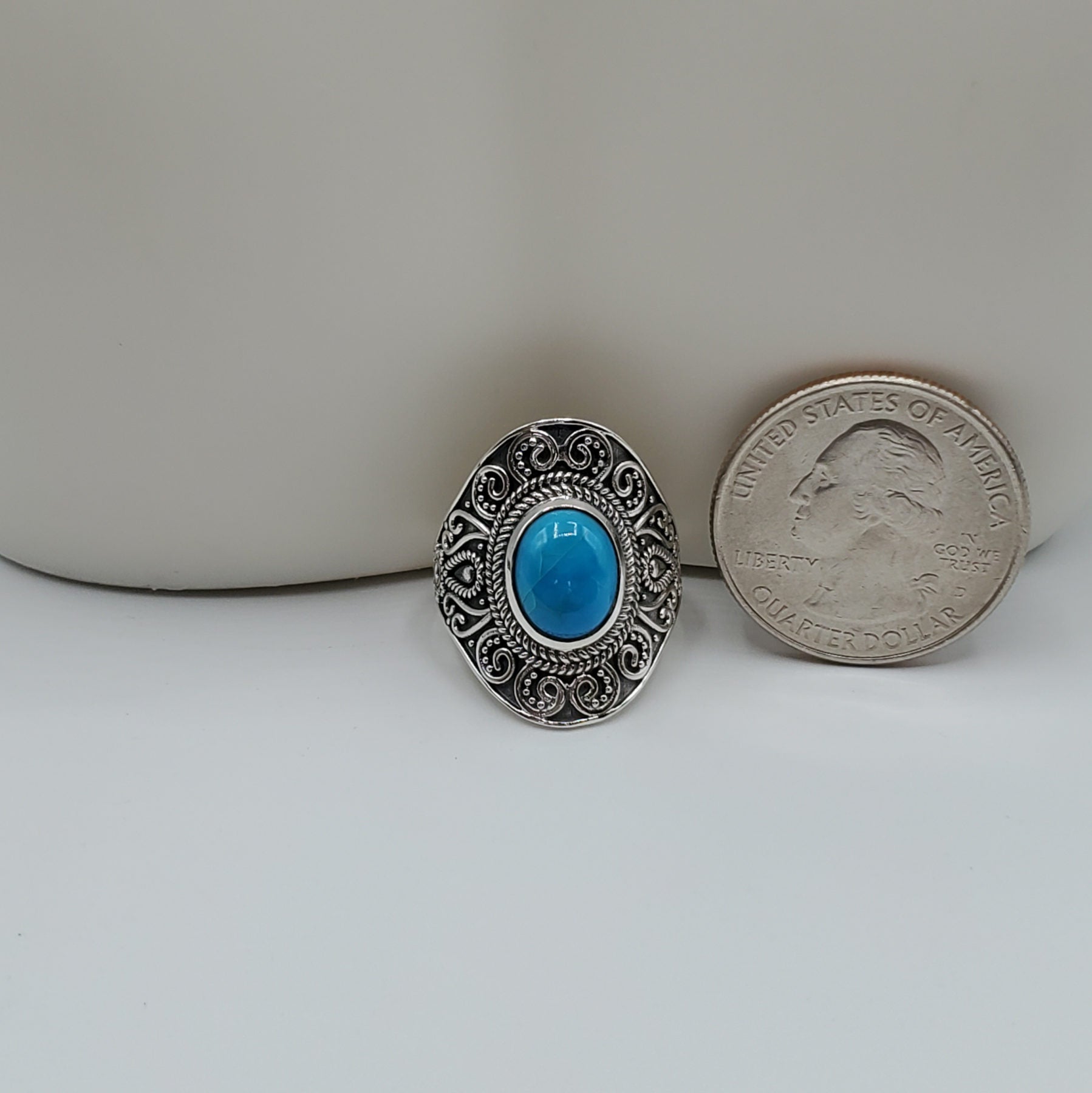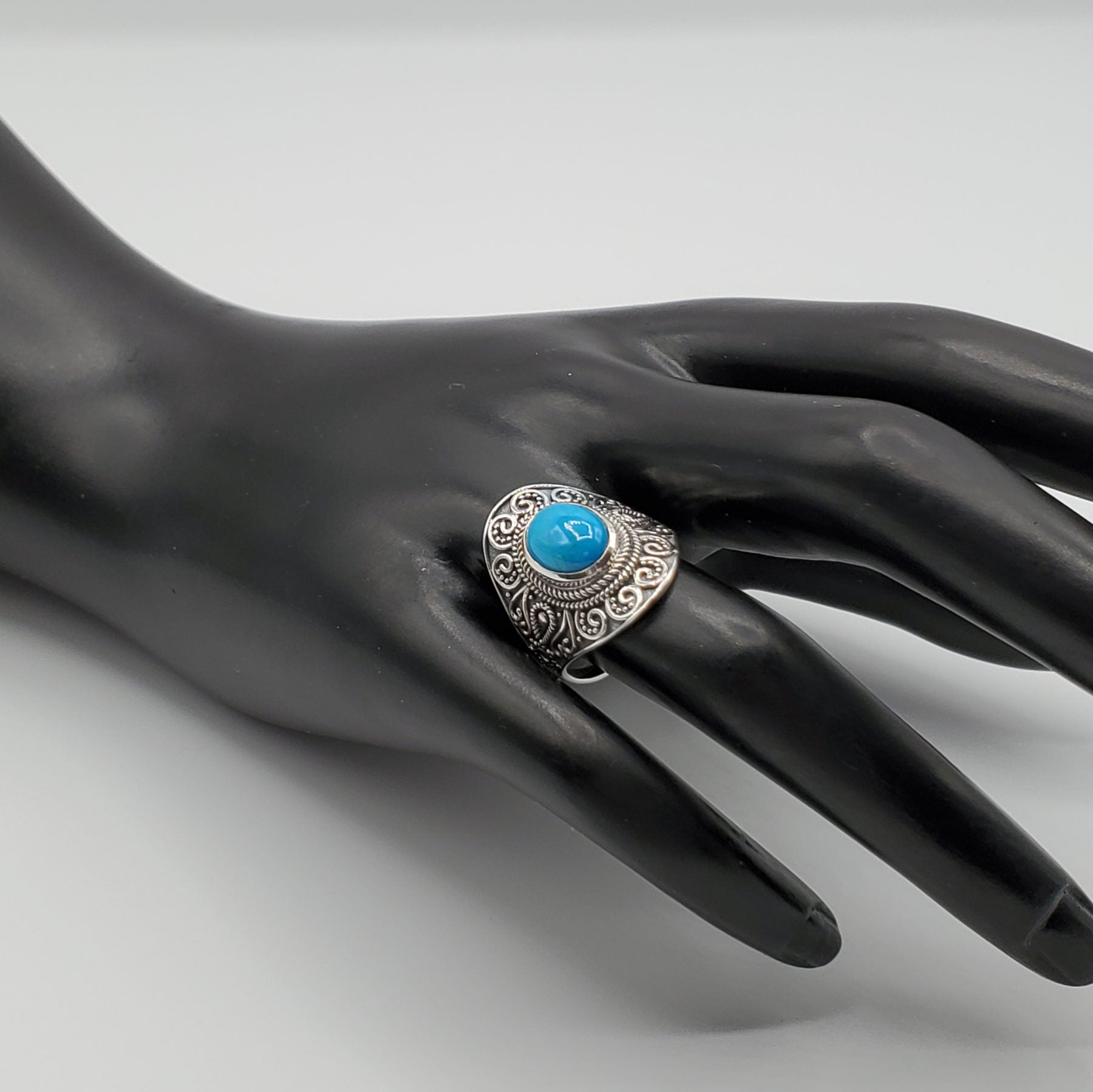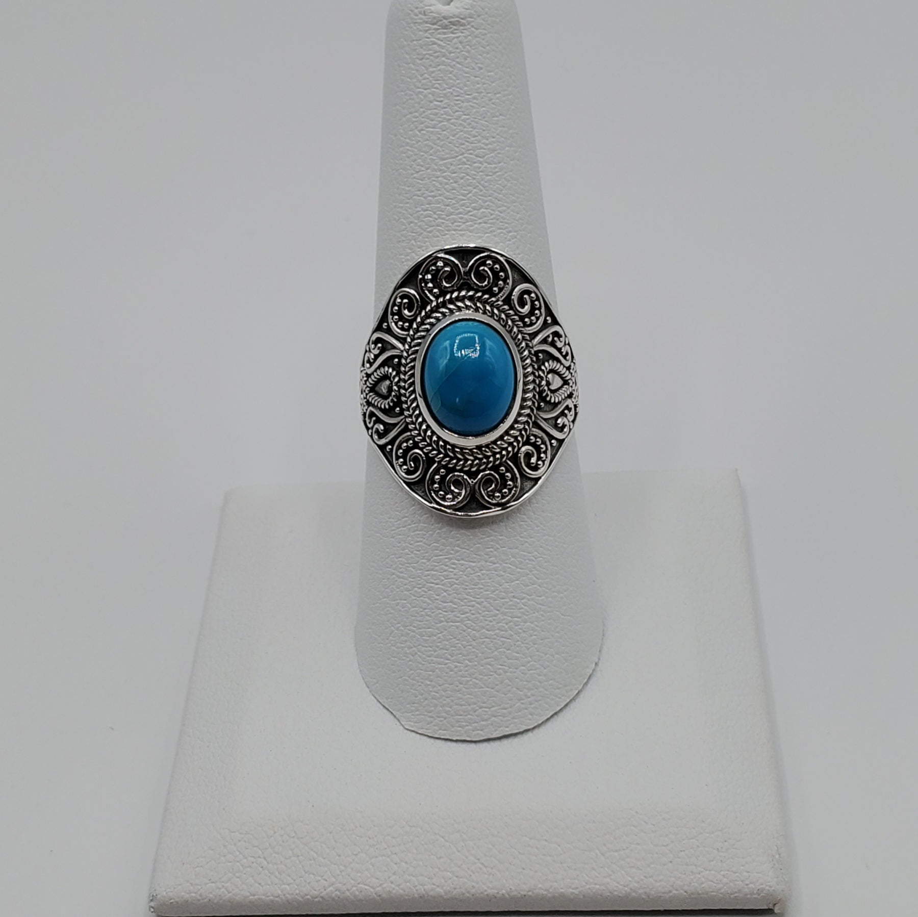 .925 Sterling Silver Ring with a .74" center stone of a Turquoise Cabochon resting within a silver setting with antique swirls. Entire ring design is 5mm in length. It is a must see.