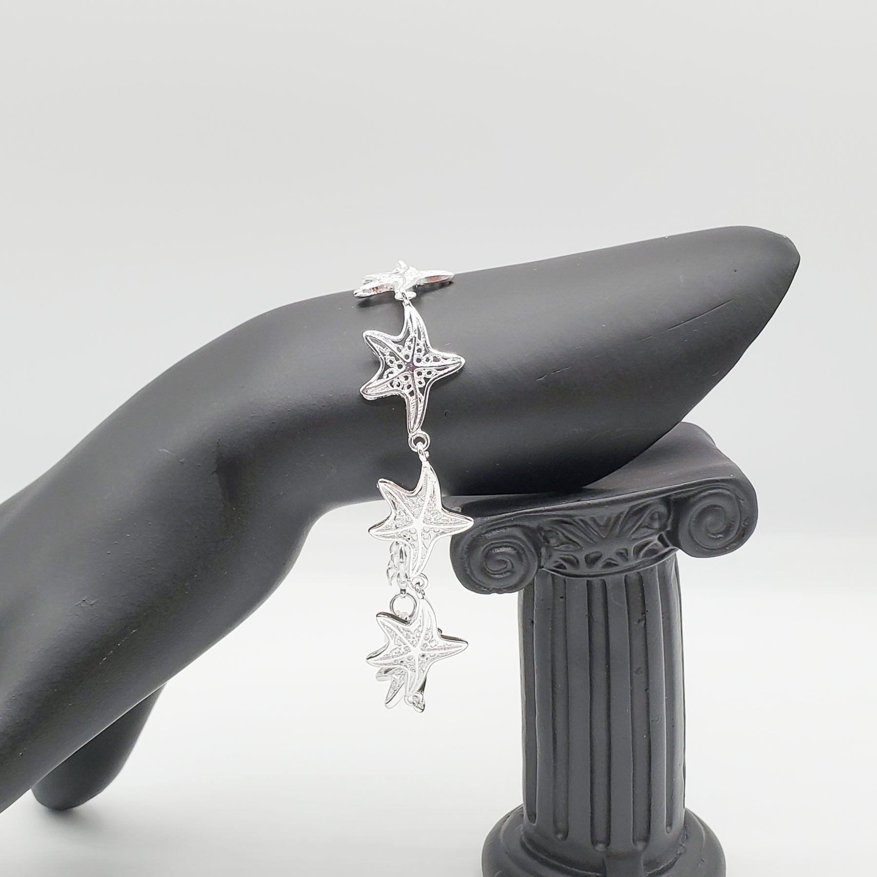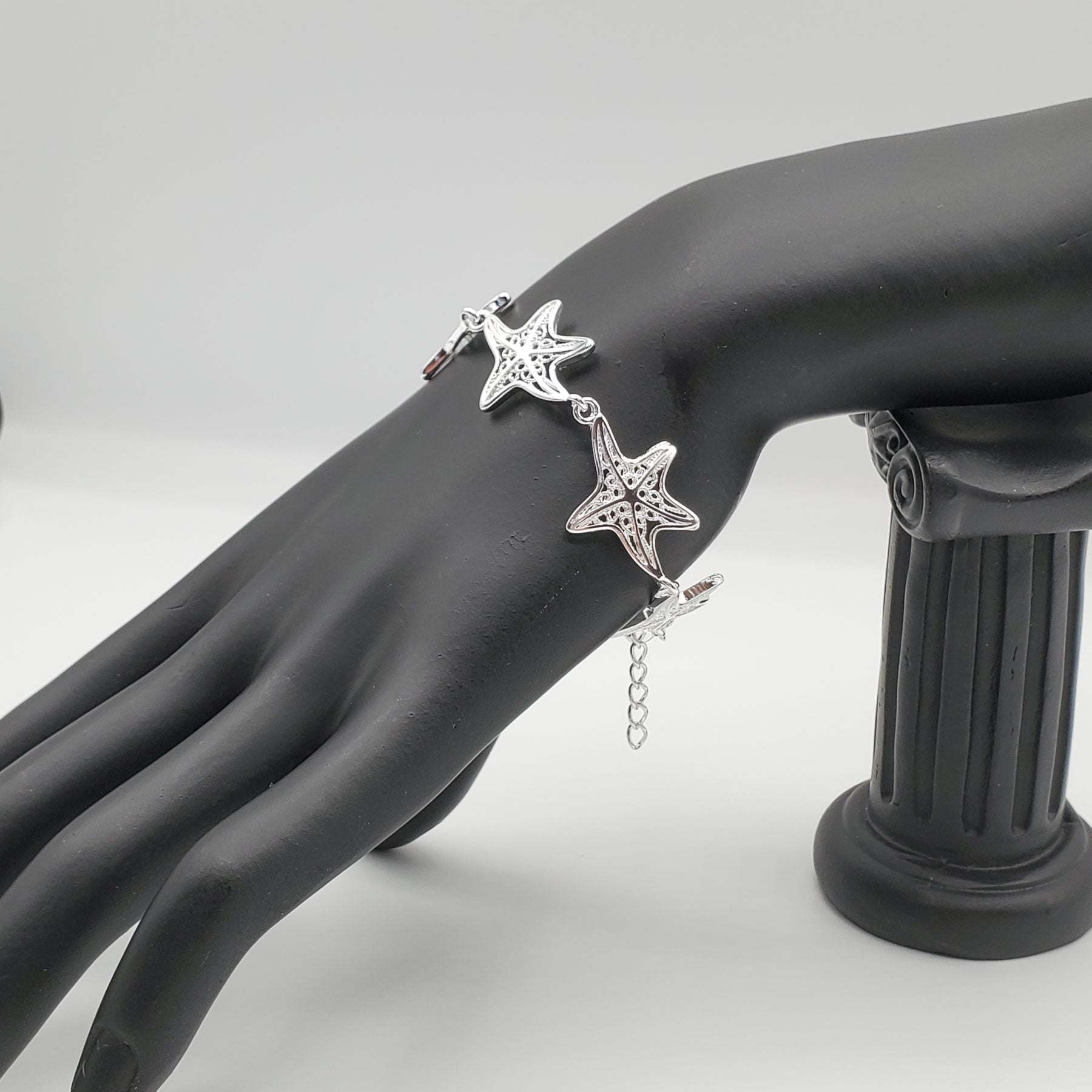 .925 Sterling Silver Starfish bracelet consisting of 6 16mm .925 sterling silver starfish with adjustable lobster claw hook.