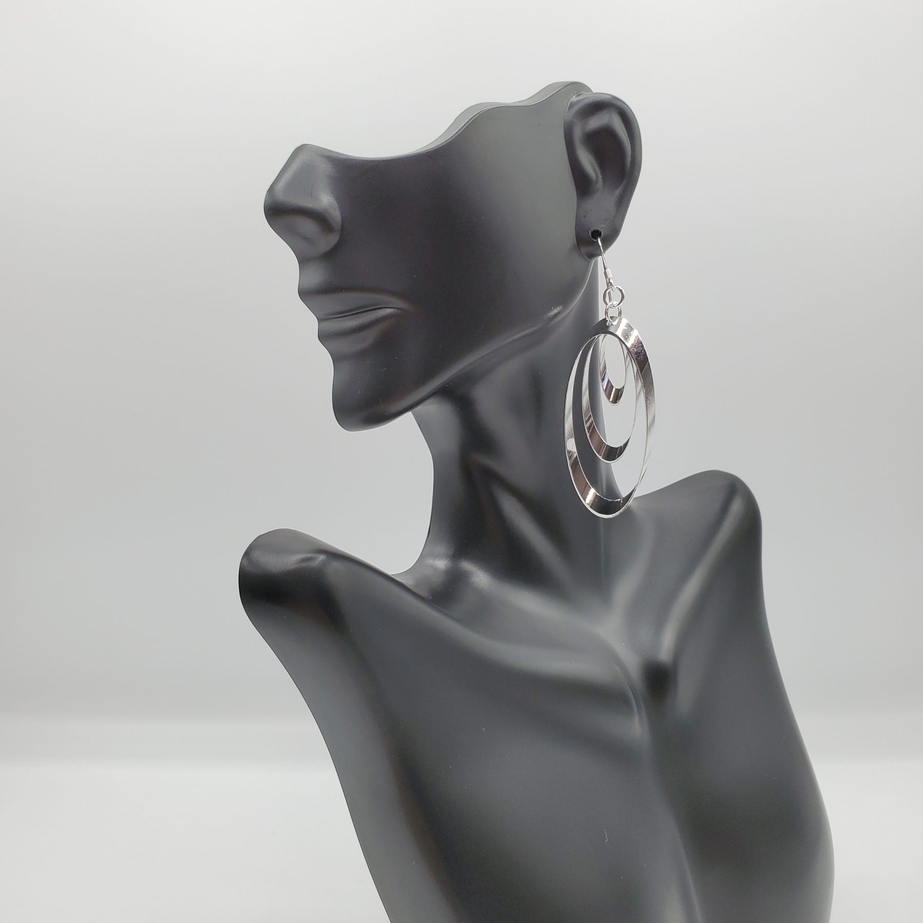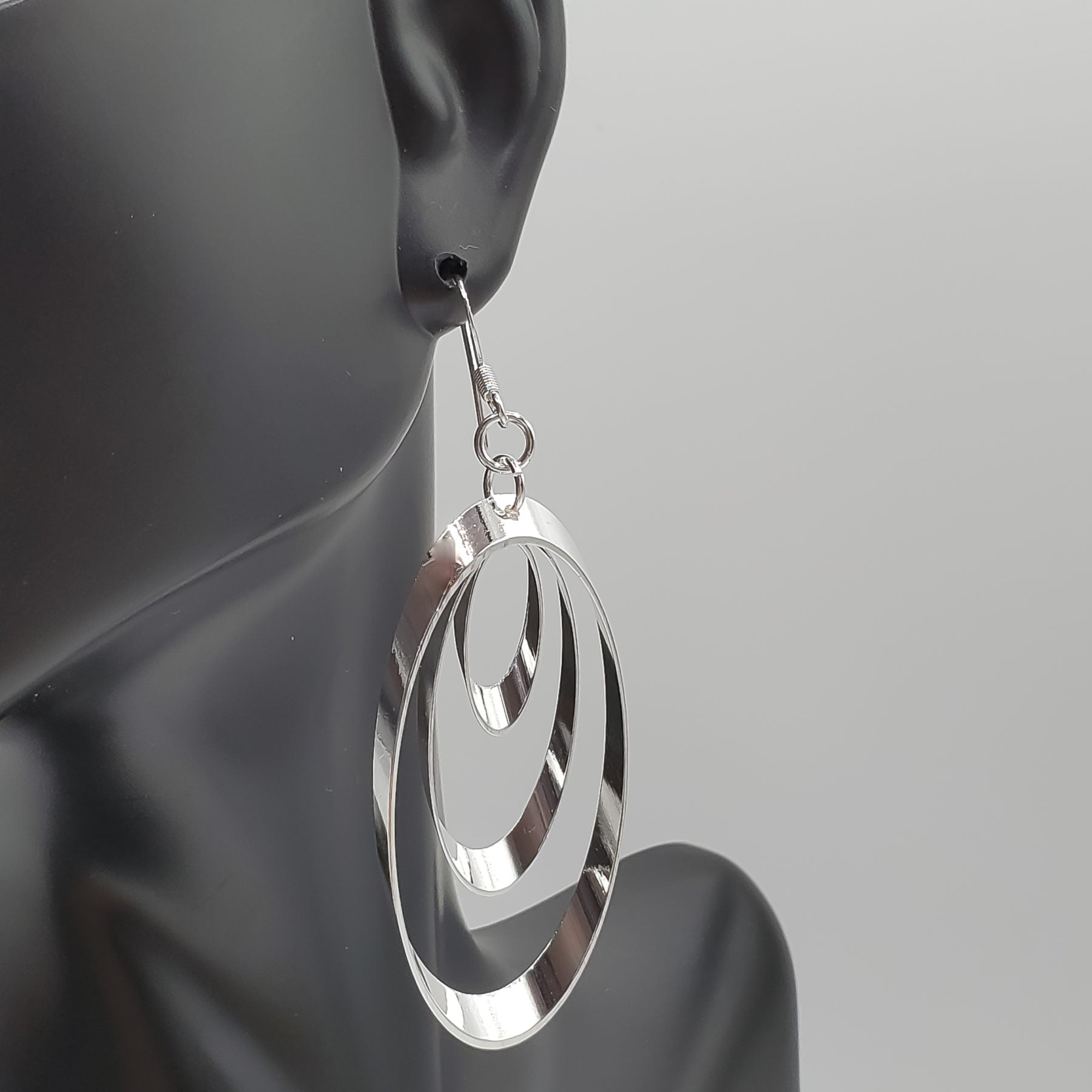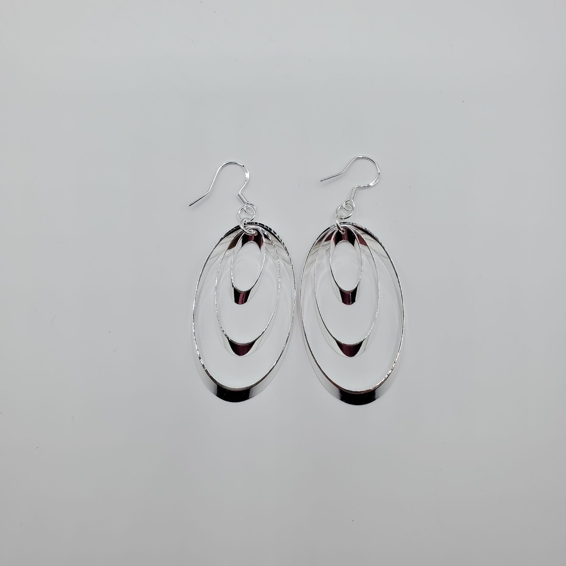 .925 Sterling Silver triple oval hoop earrings. The largest outside oval is 34mm, the next one is 31mm and final one is 18mm. This is a striking pair of statement earrings that flows from day to evening but would be great on you on the next zoom call.