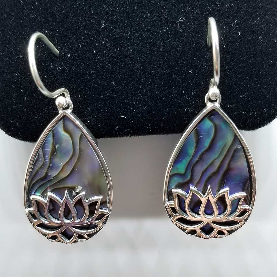 2.5 cm in length raindrop abalone with silver lotus blossom dangle, French back earrings set in .925 silver