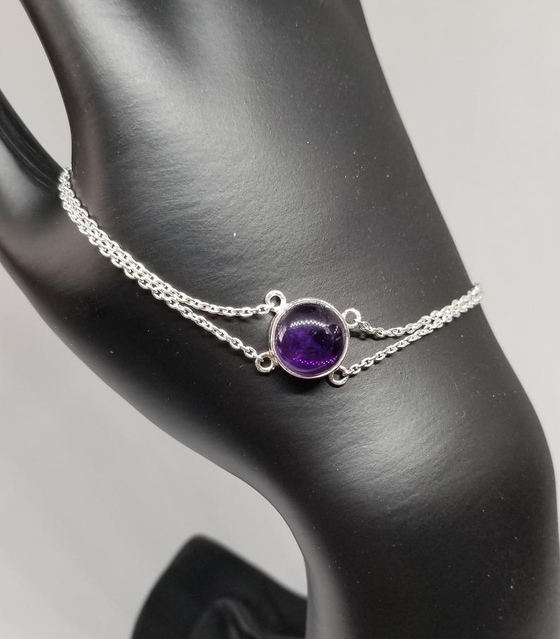 7" Adjustable Amethyst Cabochon bracelet in a .925 silver double chain link.