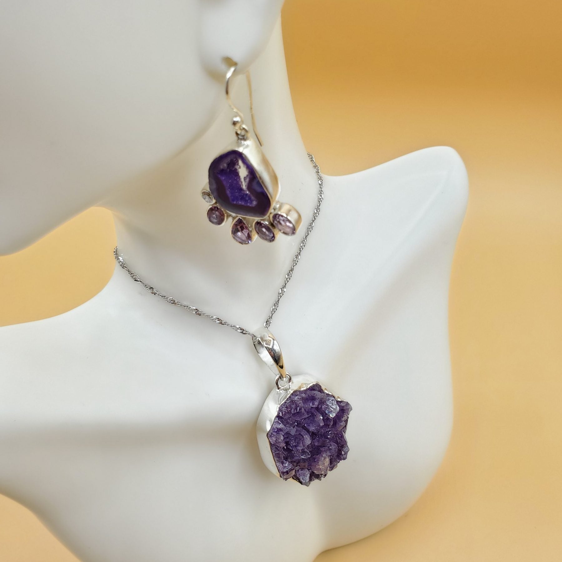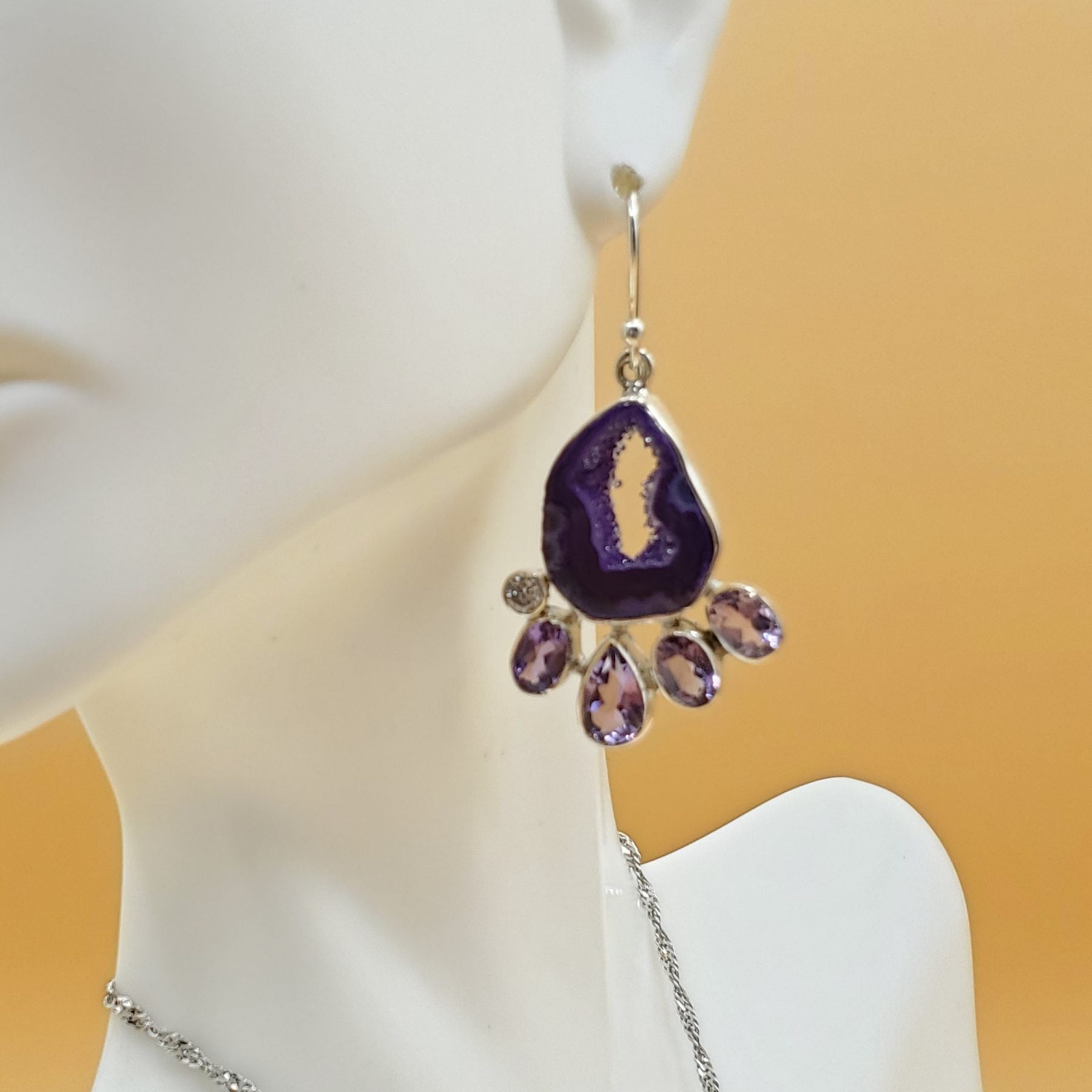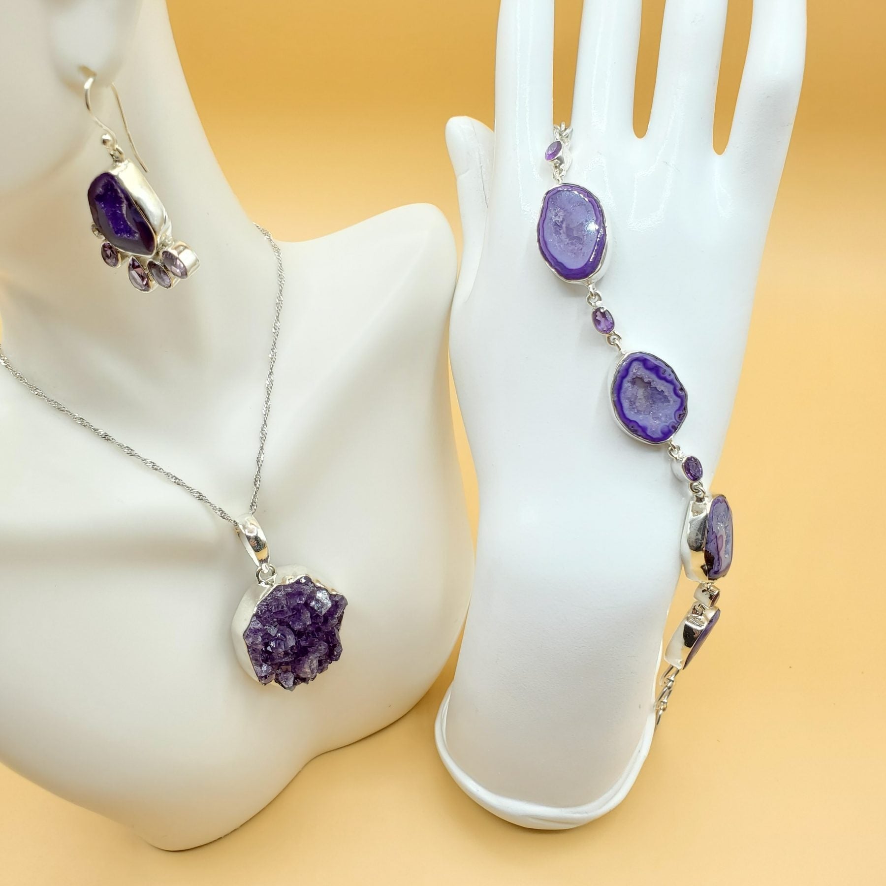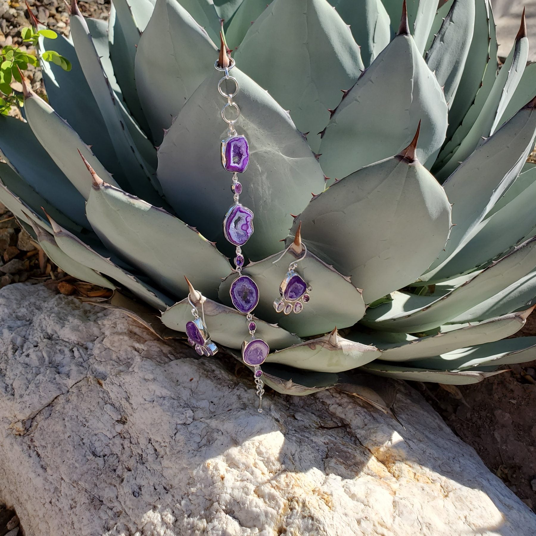 Amethyst Geo with Amethyst gemstone accents gift set . Pendant 46.6mm in length (chain shown is not sold with set but can be purchased separately as item# 334 in this inventory) , earrings 26.6mm in length and bracelet 21 mm in length with an adjustable toggle clasp set. This item is a One Off.