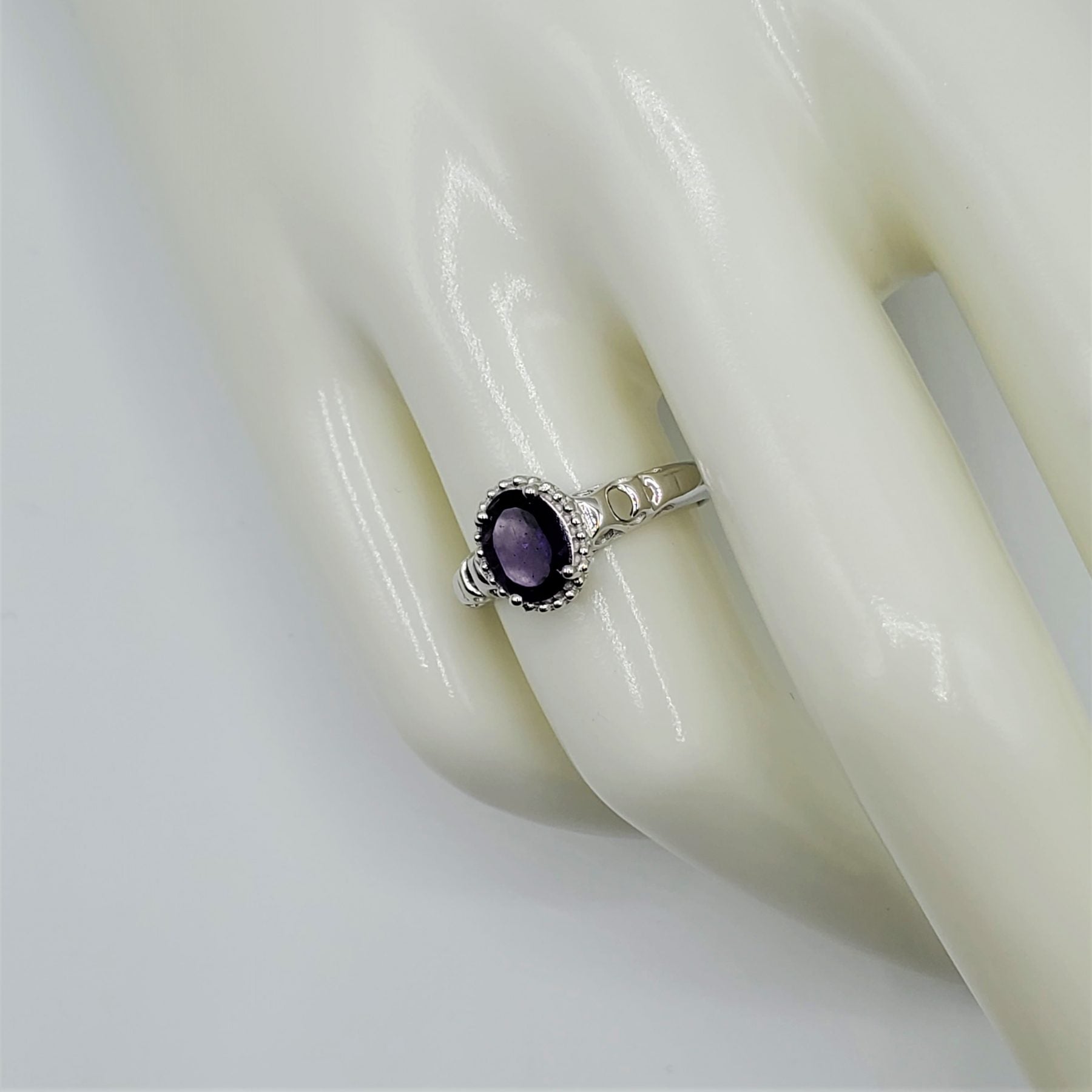 Amethyst Ring Size 7 with center of 6x8mm oval cut Amethyst in .925 sterling silver Art Deco style band.