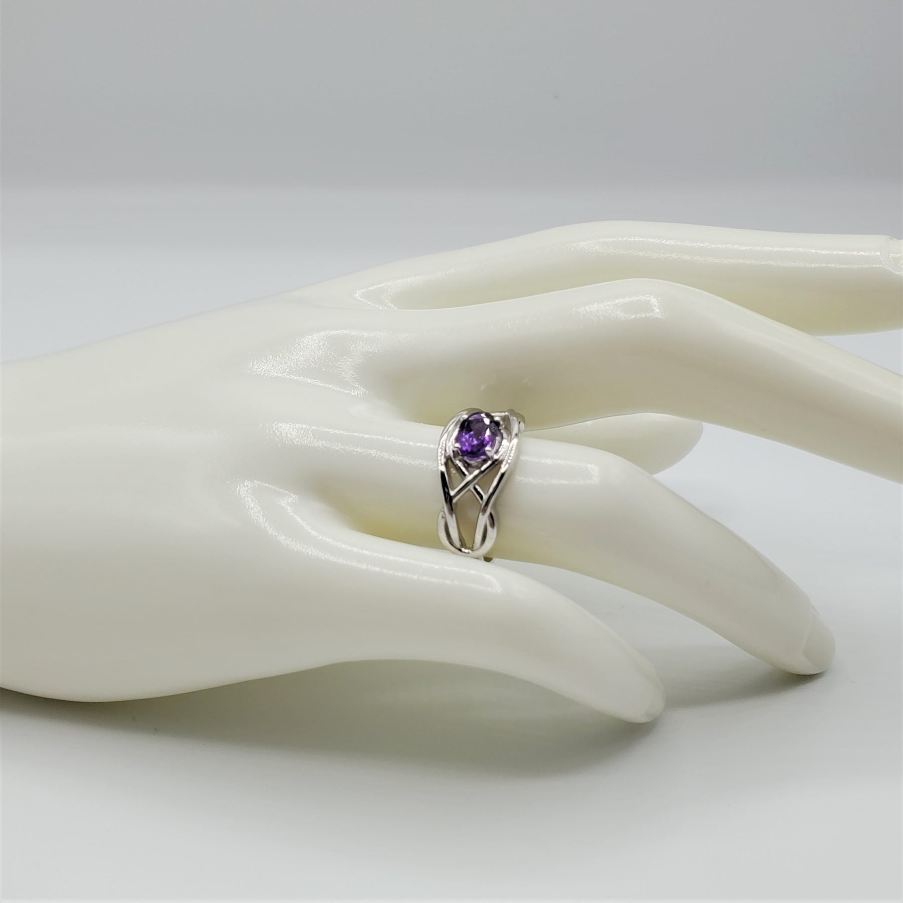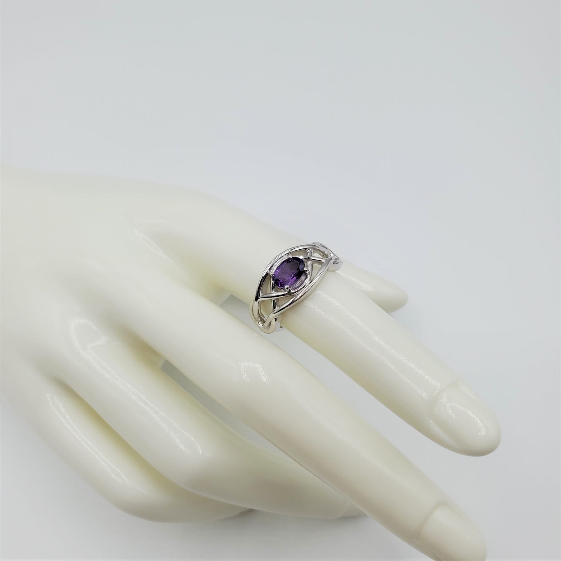 Amethyst Sterling Silver Ring with a 7x5mm oval cut set in a swirl of .925 sterling silver.
