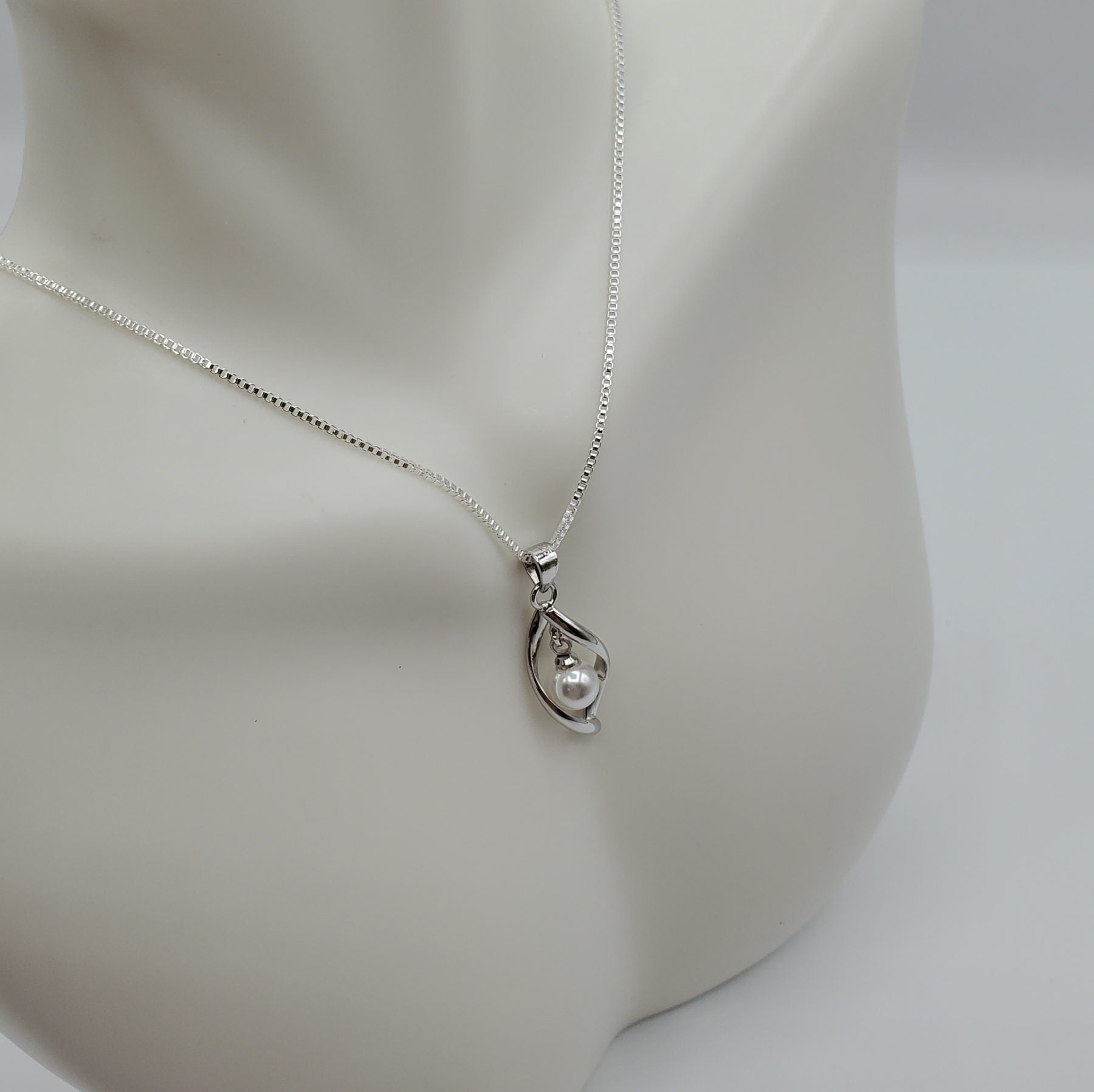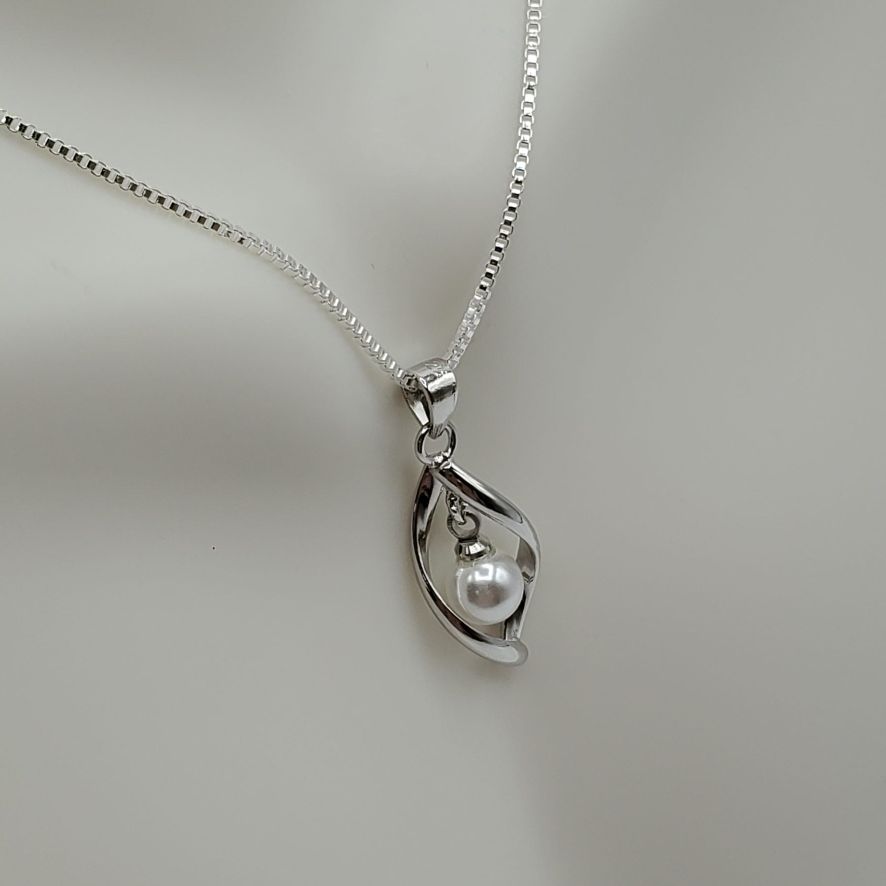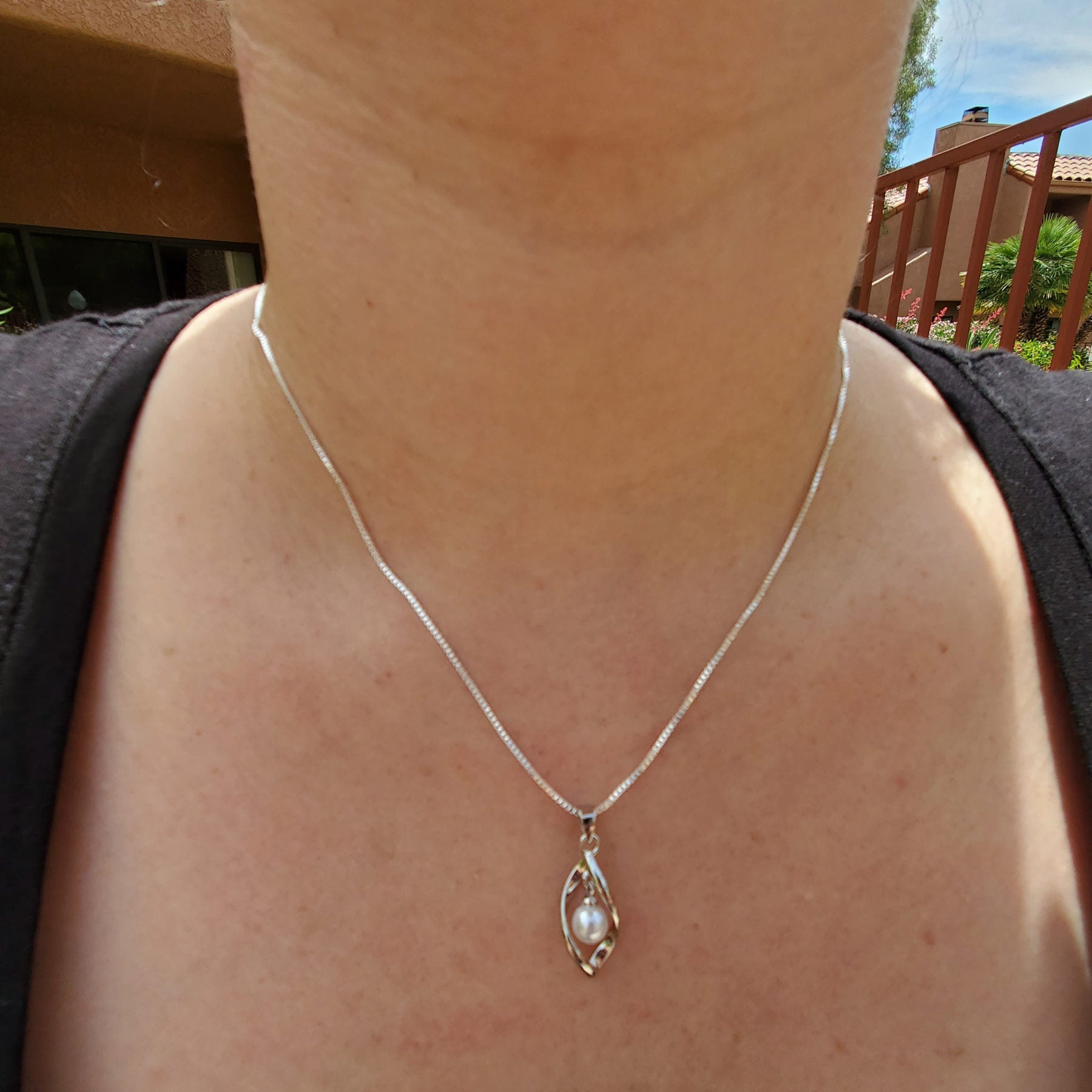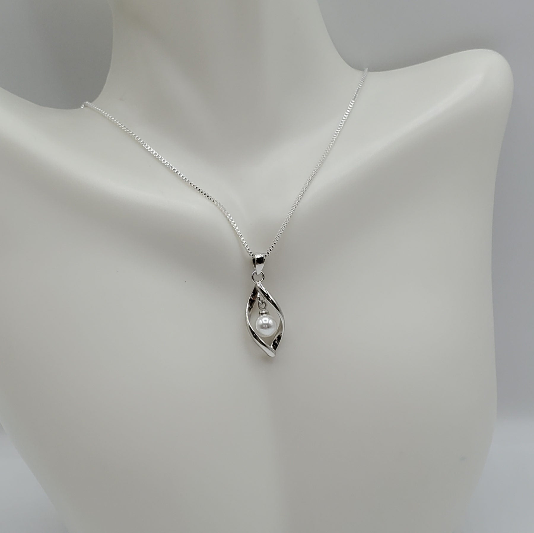 Boho Style 18" Pearl Necklace set in a twisted cage of .925 Sterling Silver sold with chain.