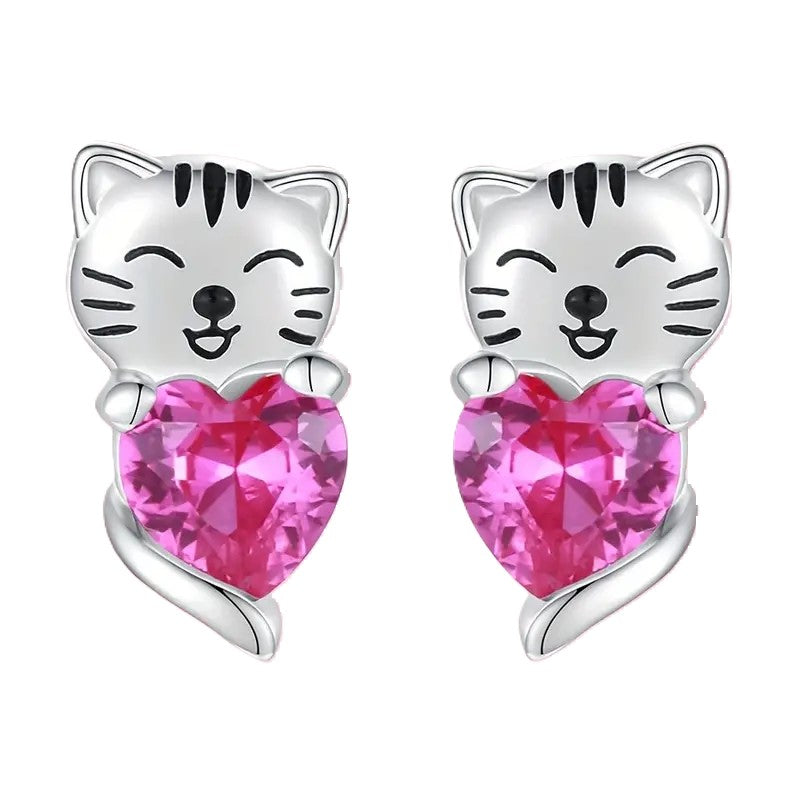 Cute Trendy Kitten With Pink Heart Stud Earrings