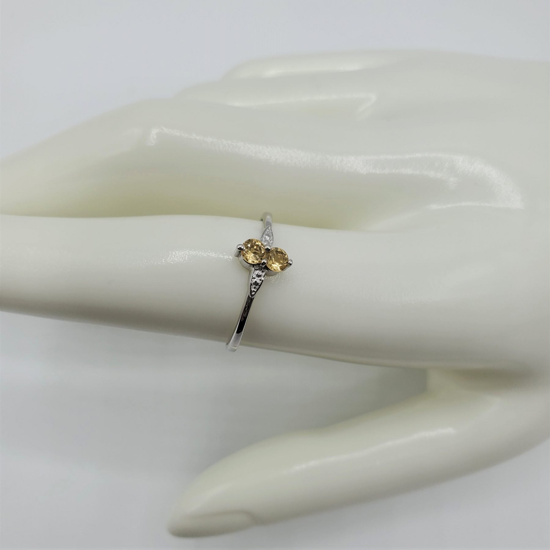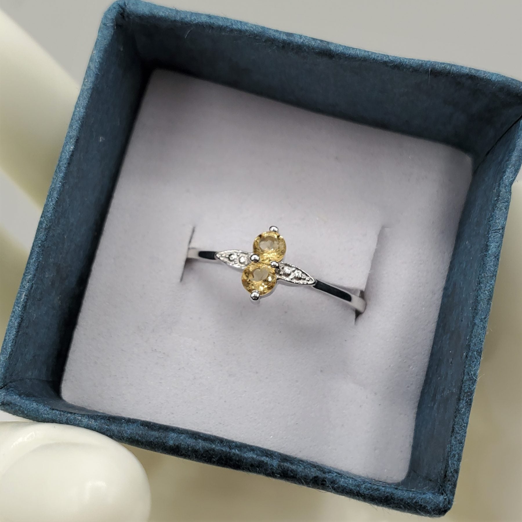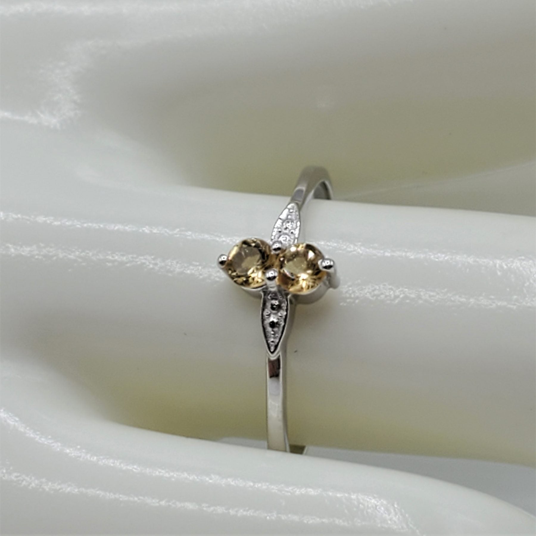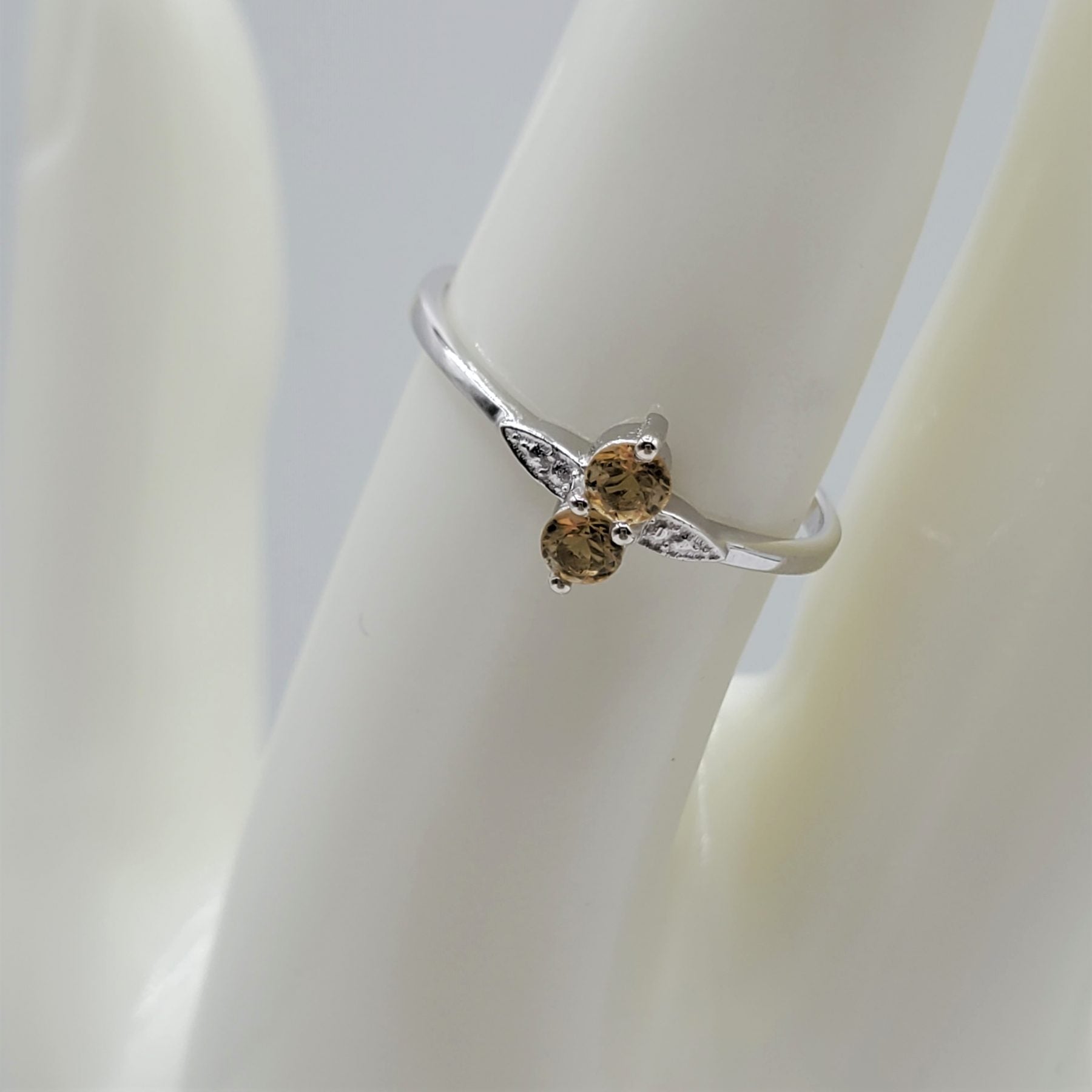 Delicate Citrine ring with two 3mm round cut stones accented by .925 sterling silver leaves set in a sterling silver band.