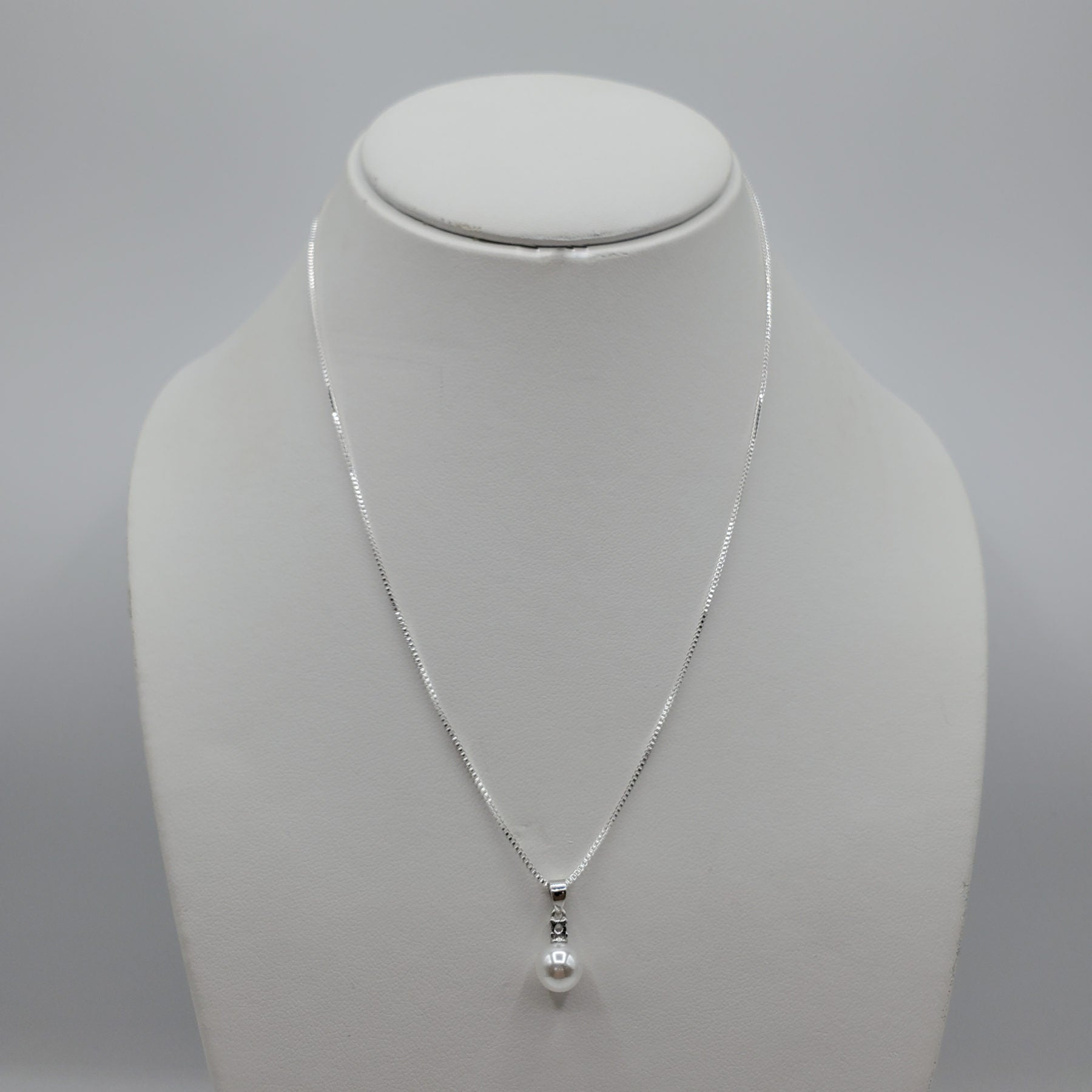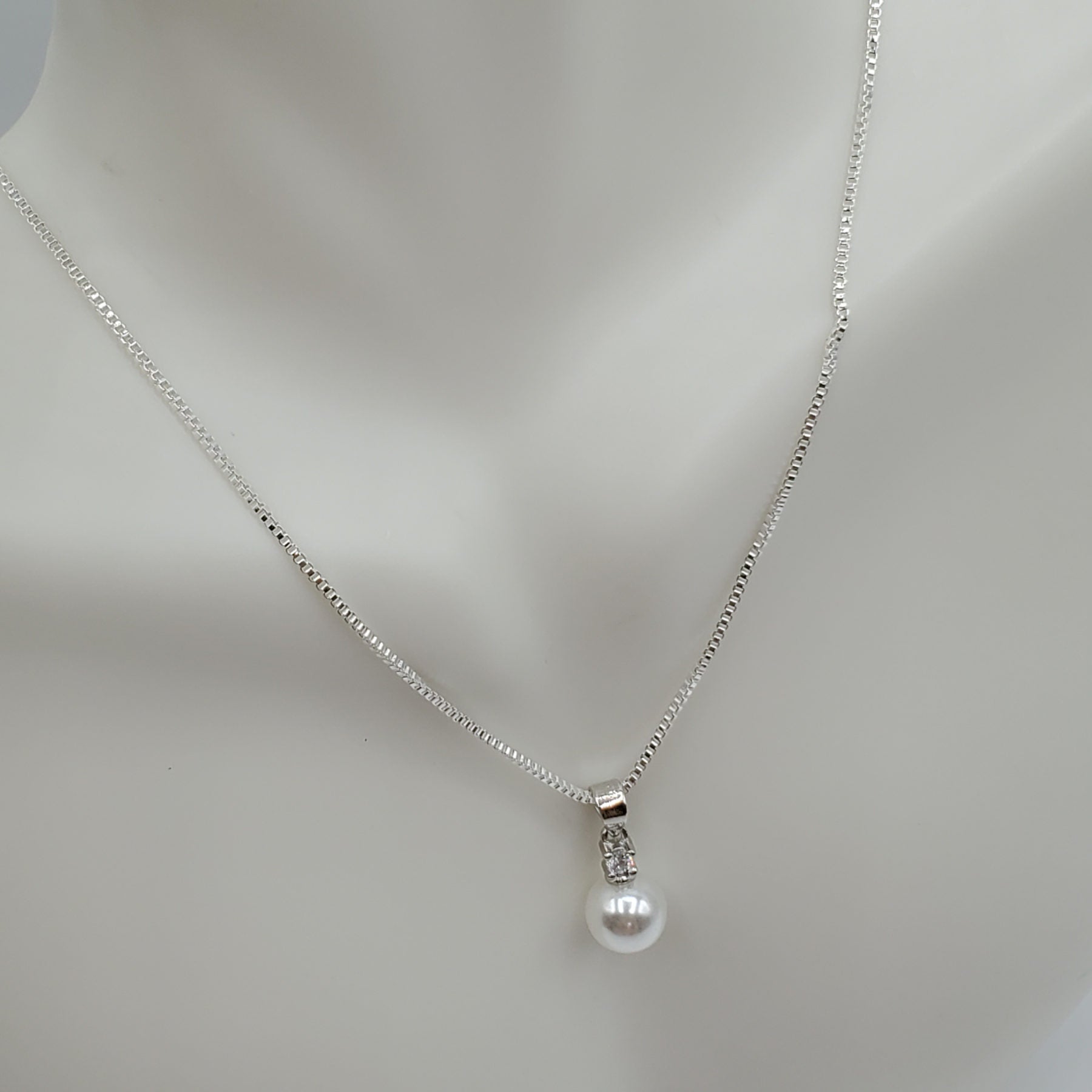 Delicate genuine 3mm cultured pearl necklace accented by a clear crystal with an 18" chain included with the item. All are set in .925 Sterling silver