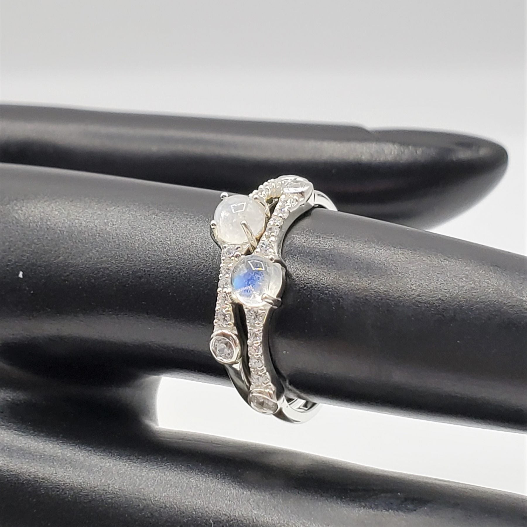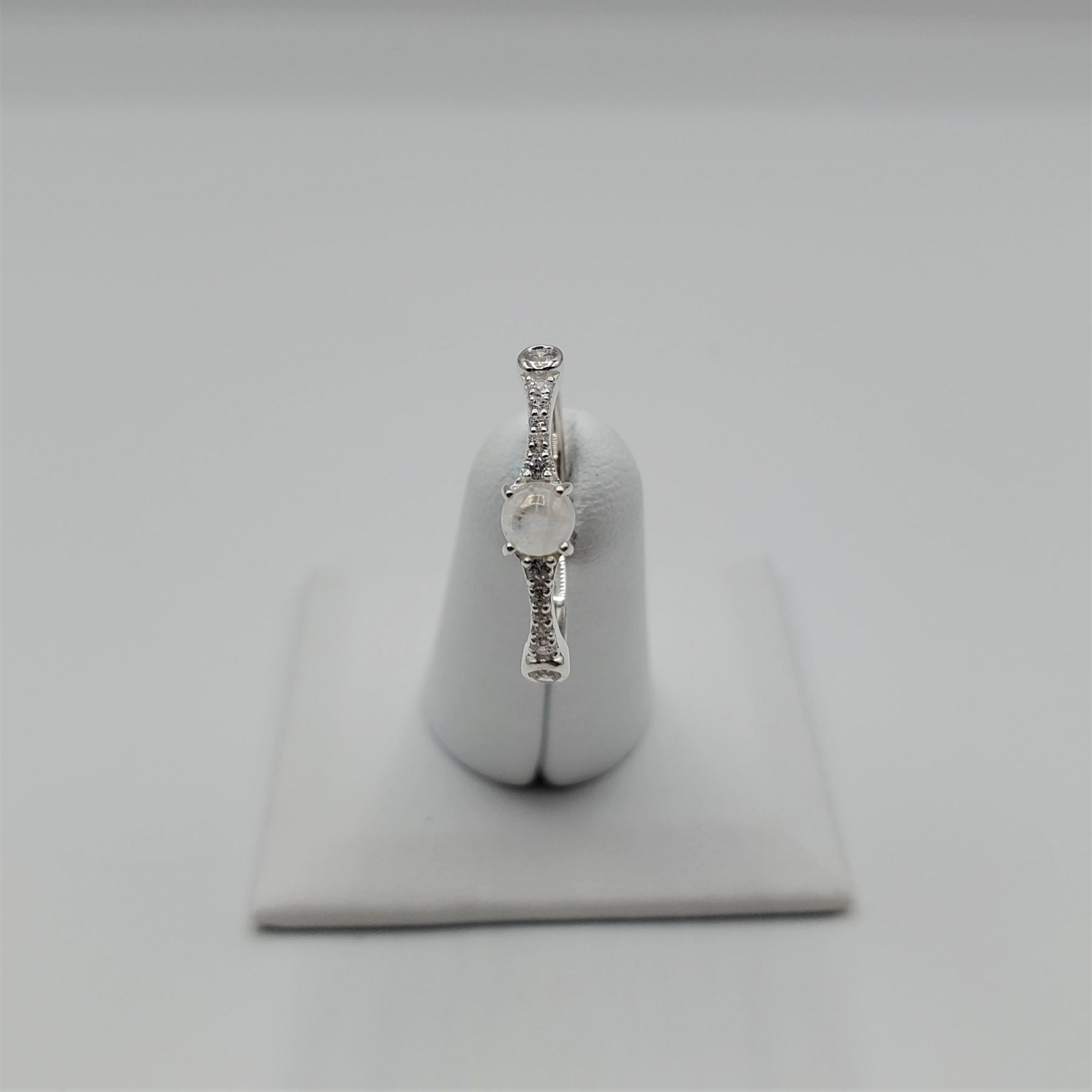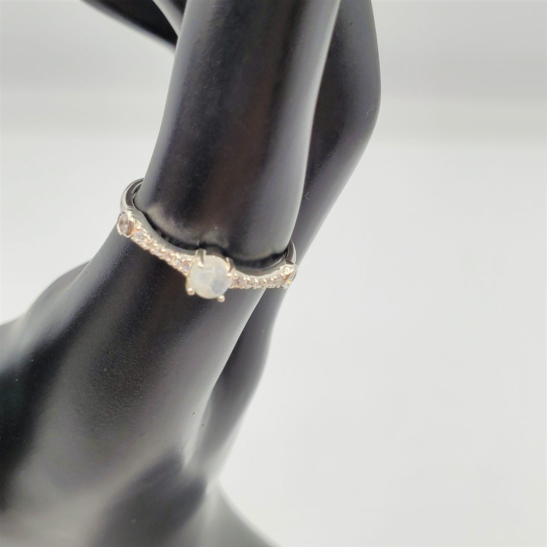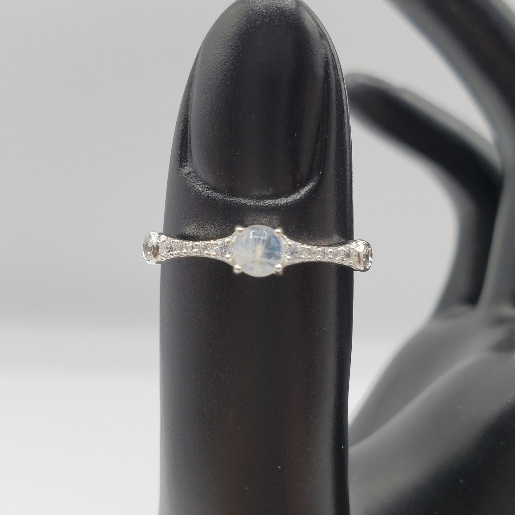 Delicate Moonstone ring with crystal accent stones.