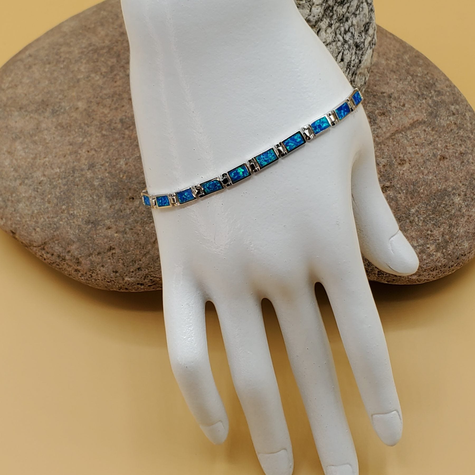 This is a Lab Created Blue Fire Opal Bracelet . High Quality Opals are set in a sterling silver 7 "bracelet . Perfect for any occasion.
