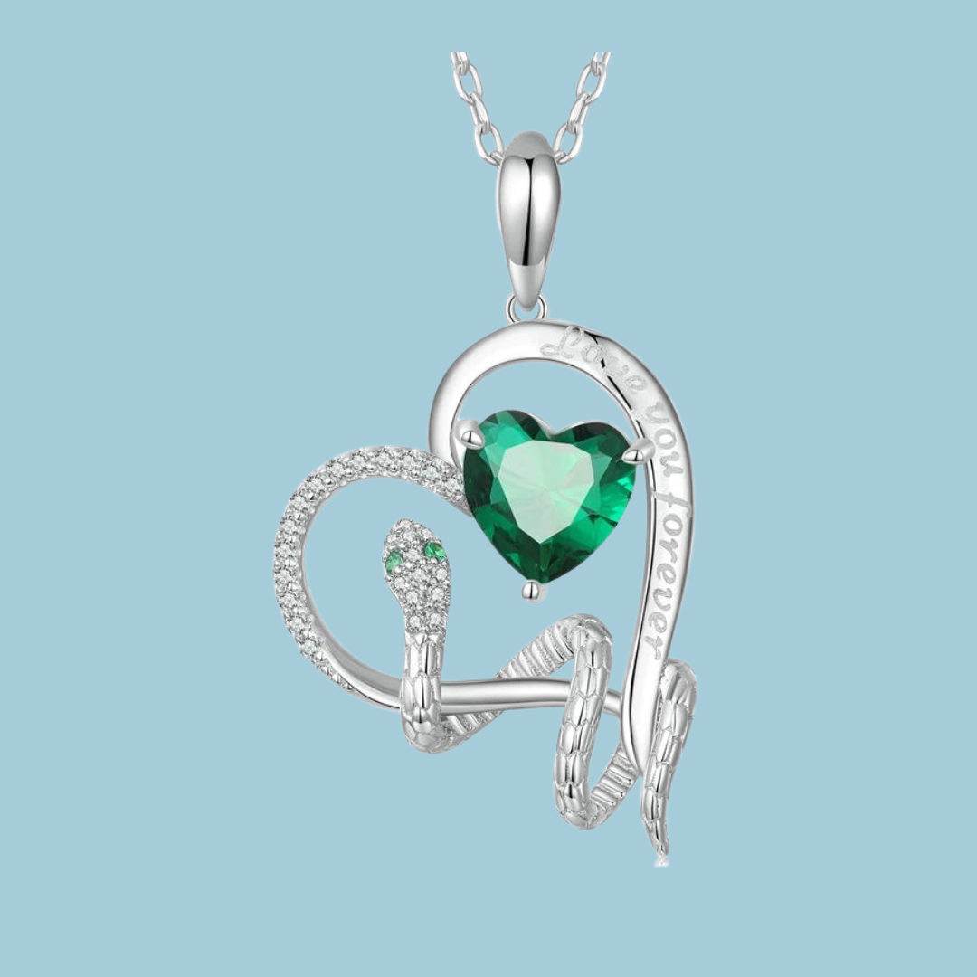 .925 sterling silver floating heart pendant with an emerald heart shaped stone accented by a curling snake. The emerald green heart crystal is 4mm and the entire pendant is 10mm including the curling snake. The pendant comes with its own 17 " chain made from sterling silver. The necklace is engraved with love you forever for that special someone you love.