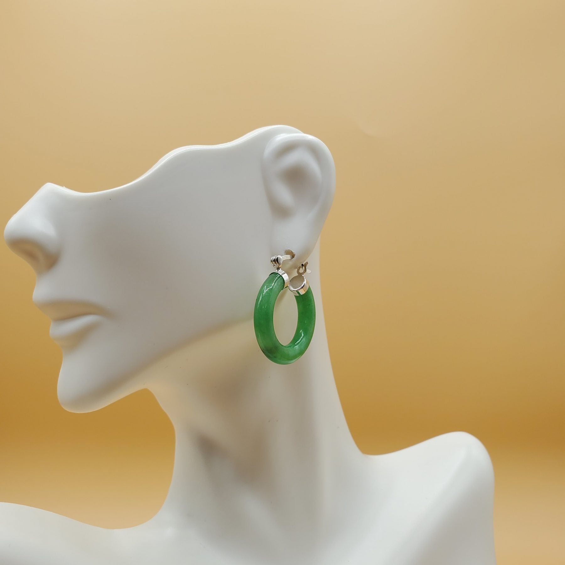 Genuine Green Jade Hoop Earrings set with Sterling Silver accents. Color with each individual pair varies slightly due to its natural nature. Very limited quantity on this one.