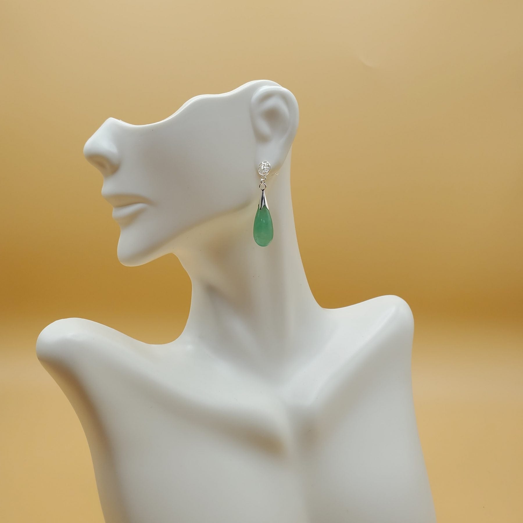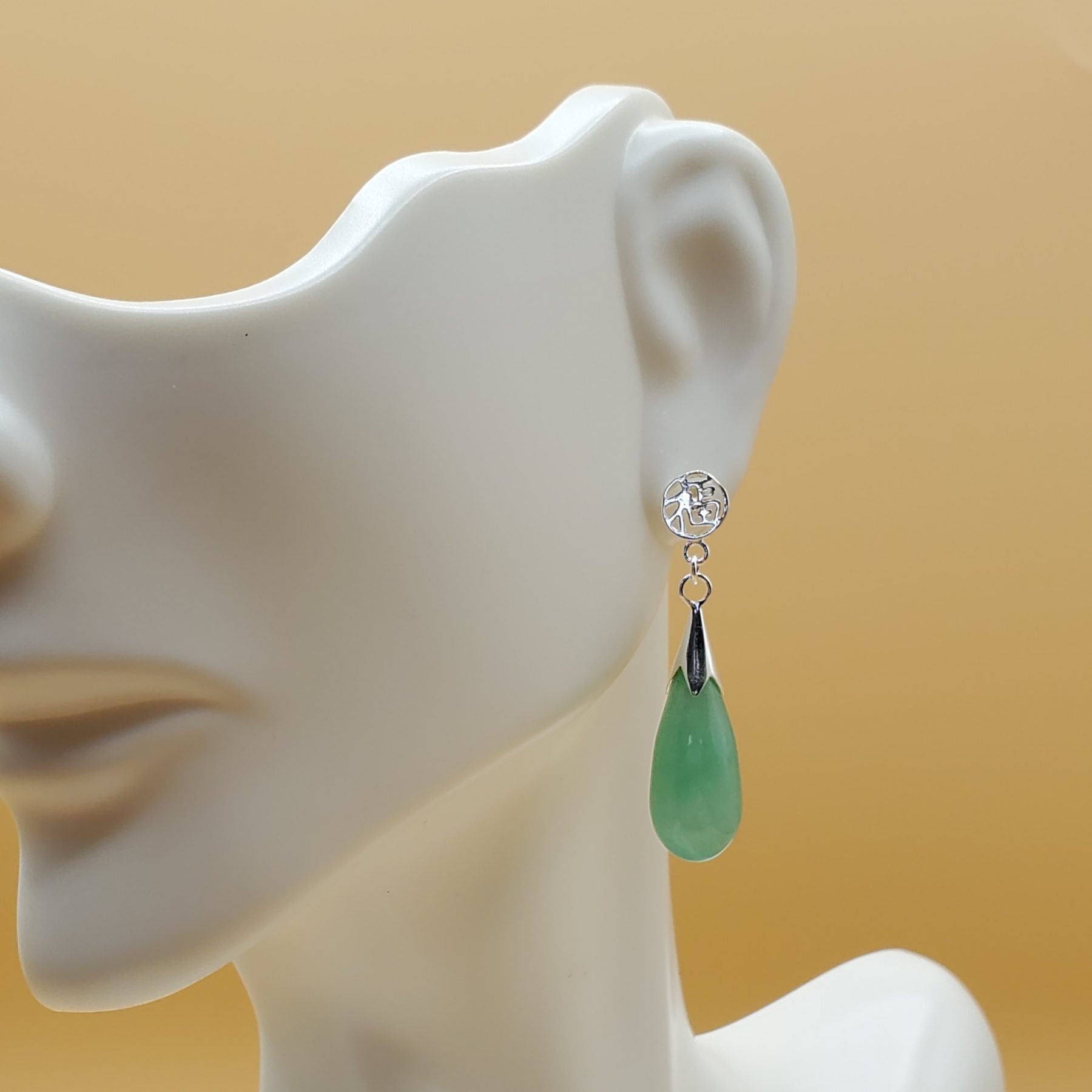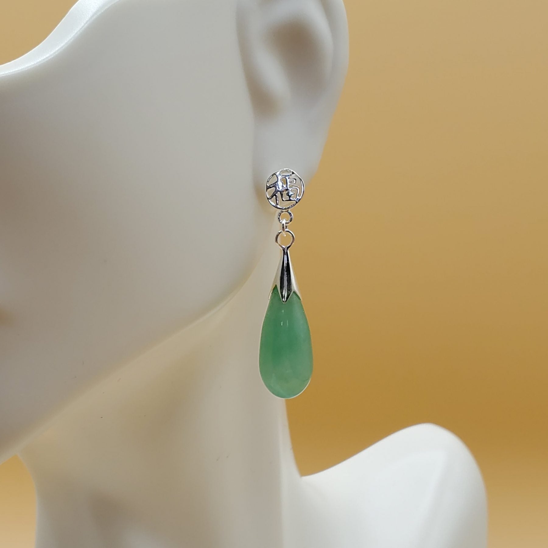 Green Jade Sterling Silver Drop Earrings. Color with each individual pairs varies slightly due to its natural nature.