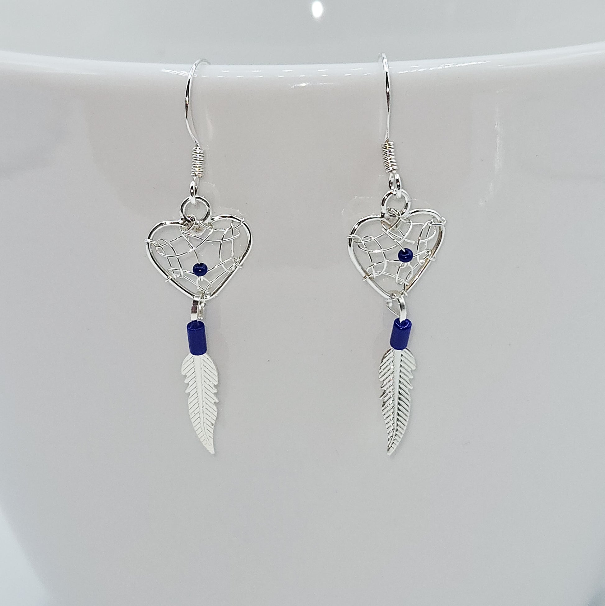 Heart shaped dream catcher dangle earring accented by lapis lazuli beads