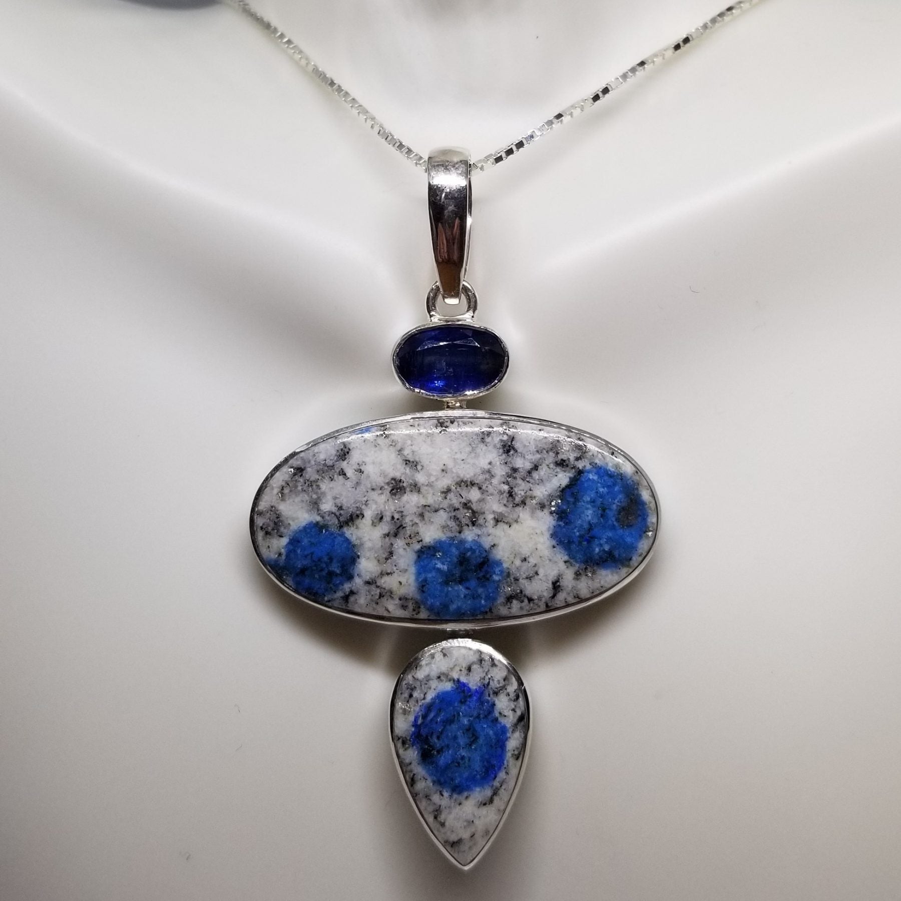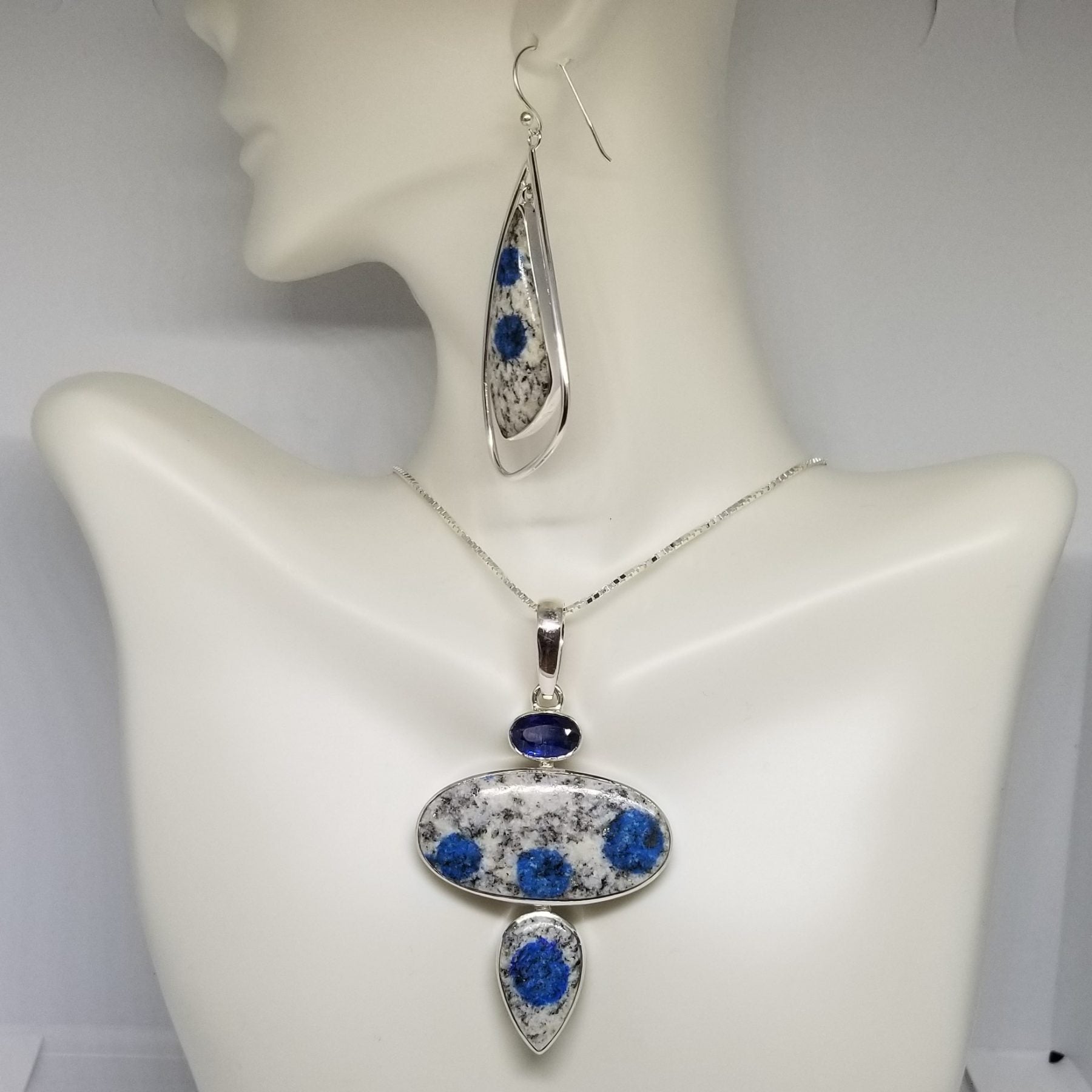 K2 Jasper Pendant is 7cm by 3cm set in a .925 silver teardrop frame with a raw tanzanite oval cabochon sitting at the very top. Chain Shown is not sold with Pendant but can be purchased separately as item #334 of this collection.