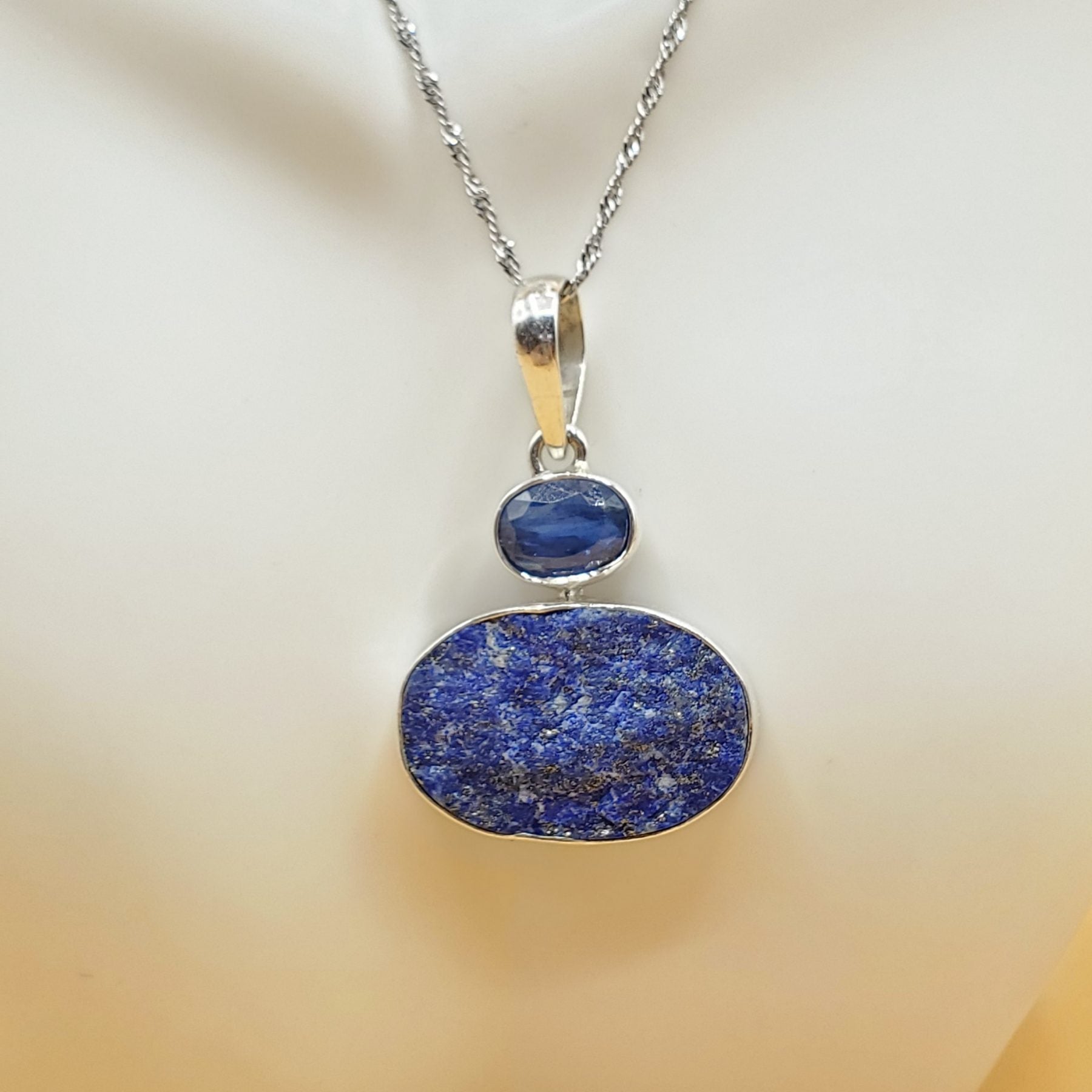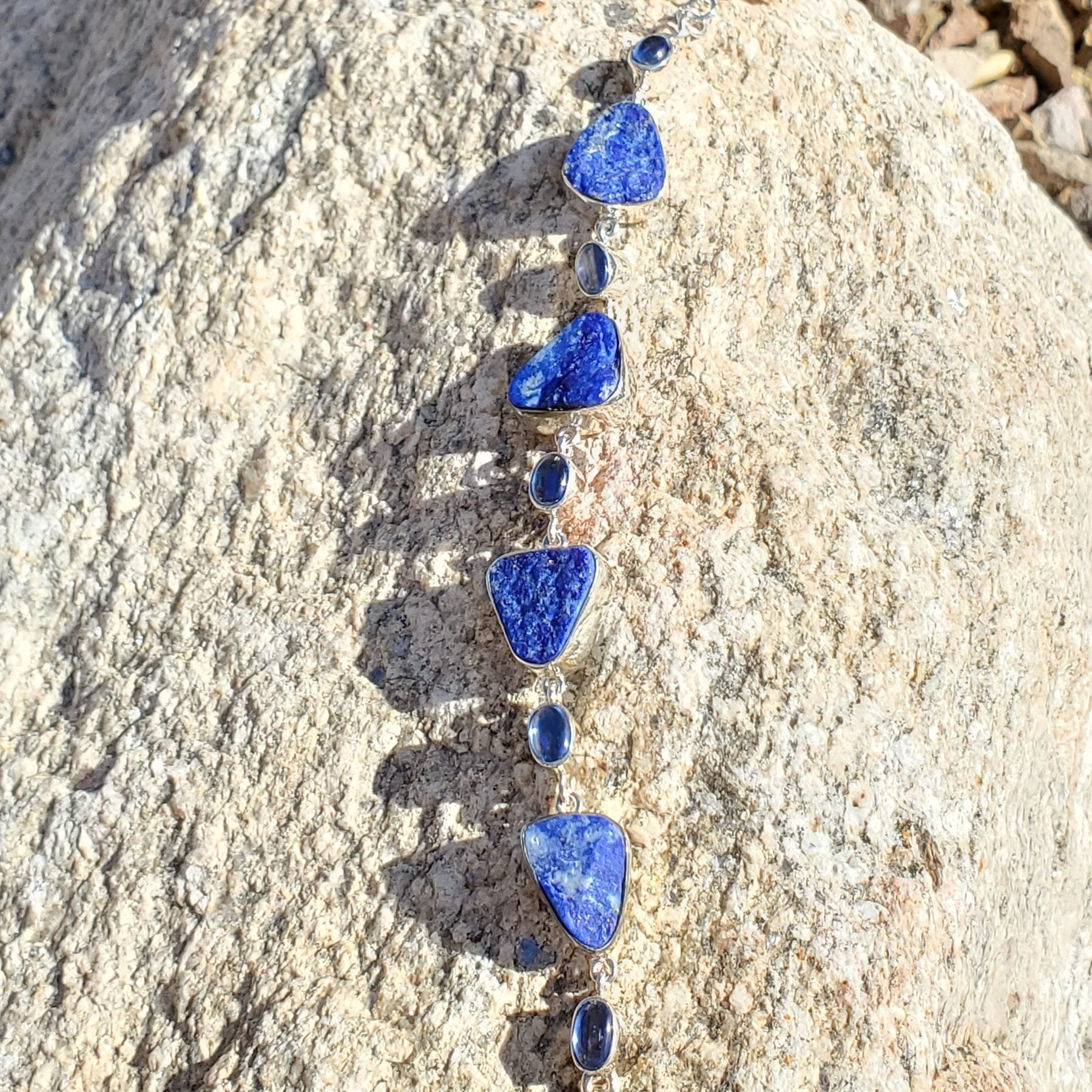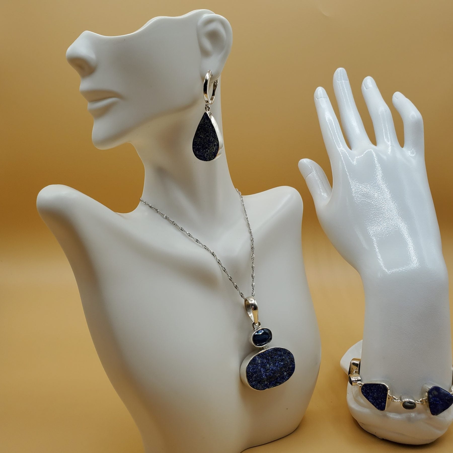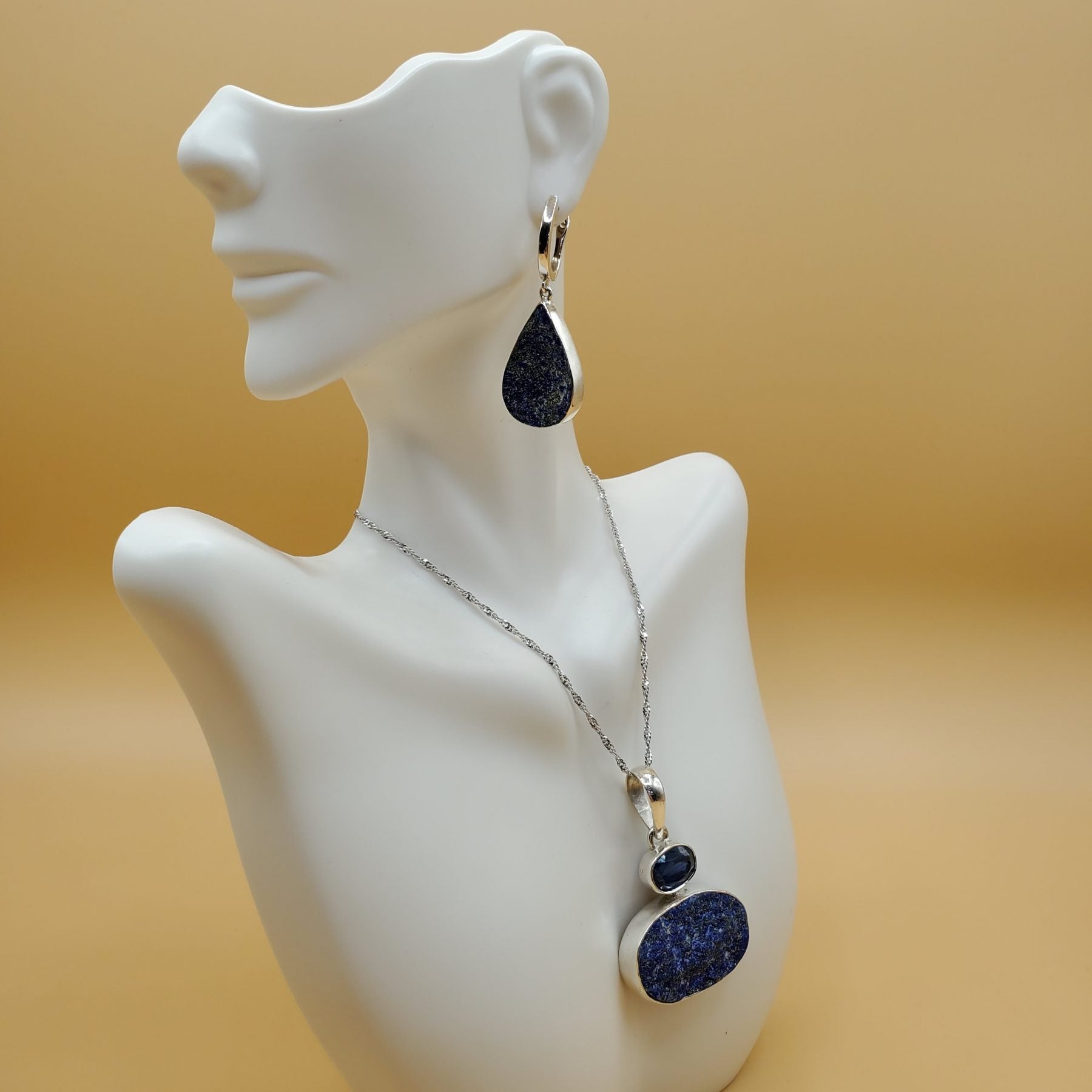 Lapis Lazuli Druzy Gift Set includes Pendant 45mm in length (chain shown not sold with set but can be purchased separately as item #334 in this inventory) , bracelet is 21mm in length with an adjustable toggle clasp, and teardrop shape dangle earrings accented with Light blue topaz gemstones are 45mm in length. This item is one off
