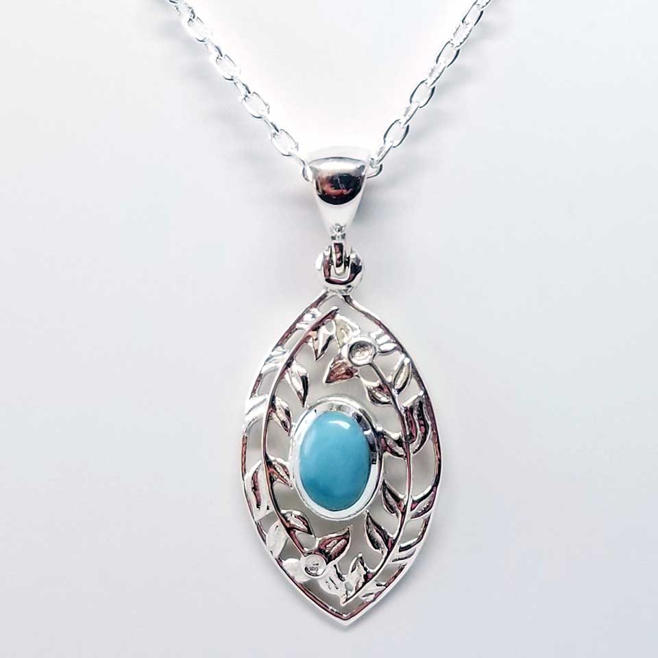 Larimar set in a silver filigree diamond shape with a .925 silver chain of 20"