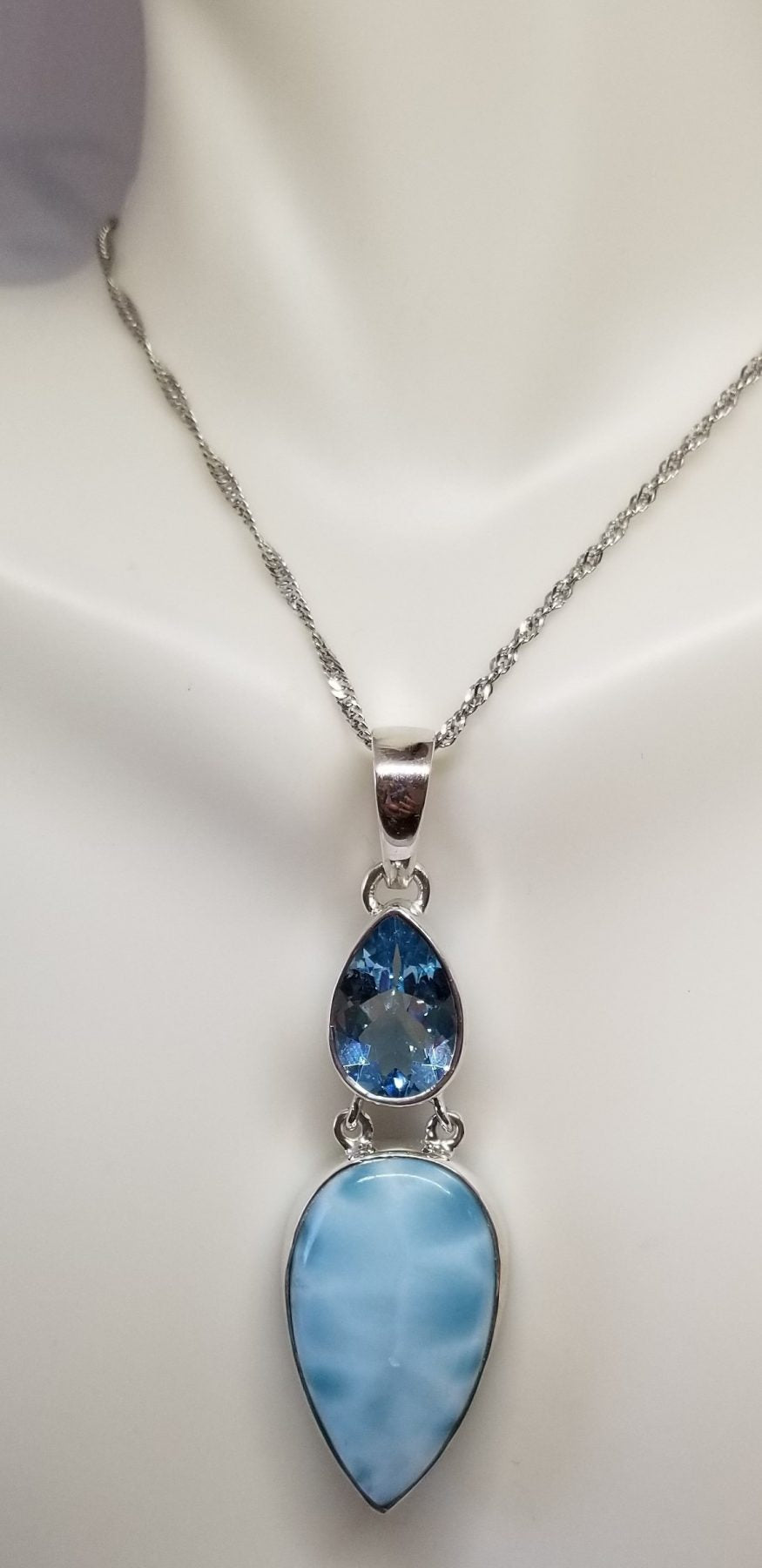 Larimar pendant is 5cm in length set in .925 silver frame with a 13.3 mm blue teardrop topaz accent stone. (Chain shown is not included with pendant.}
