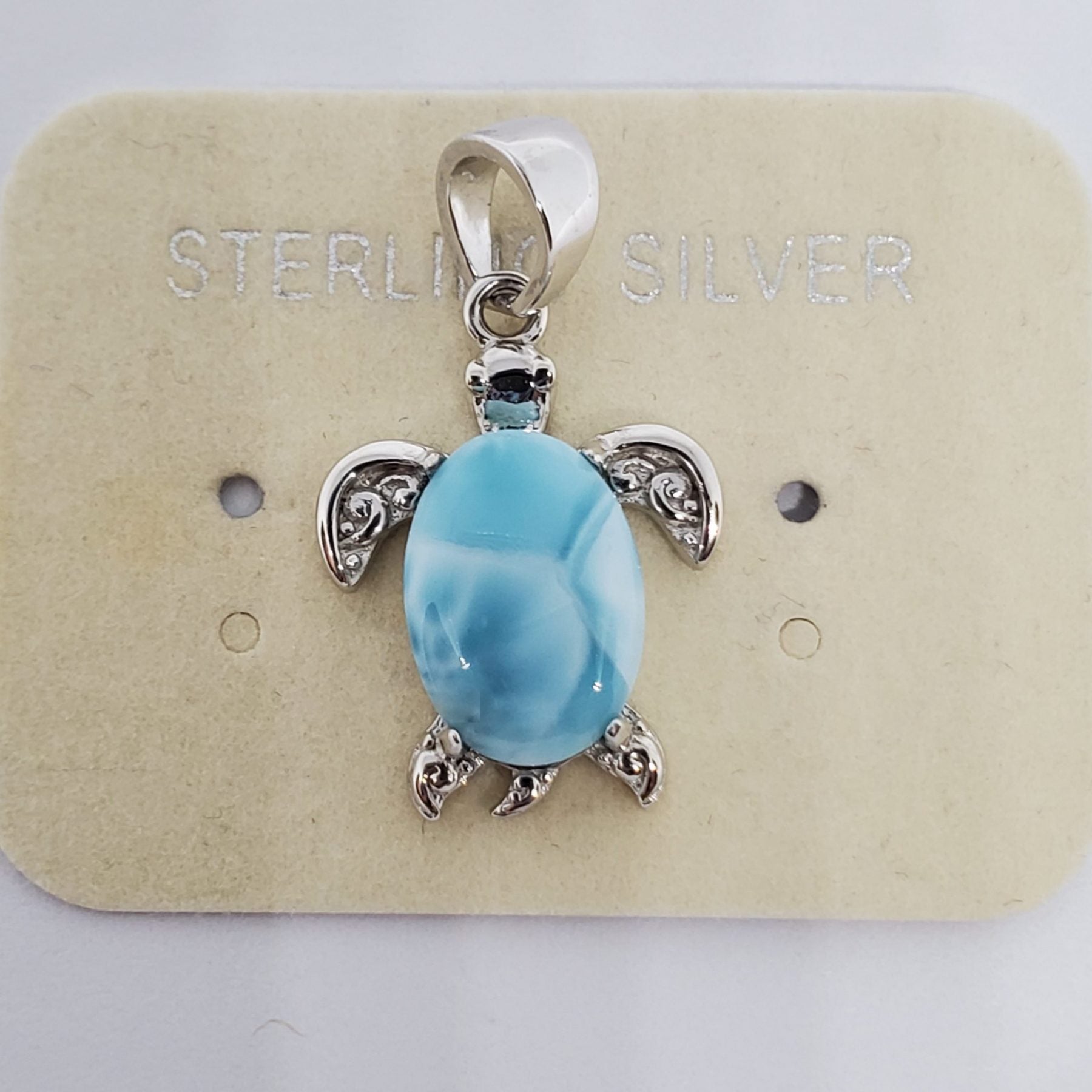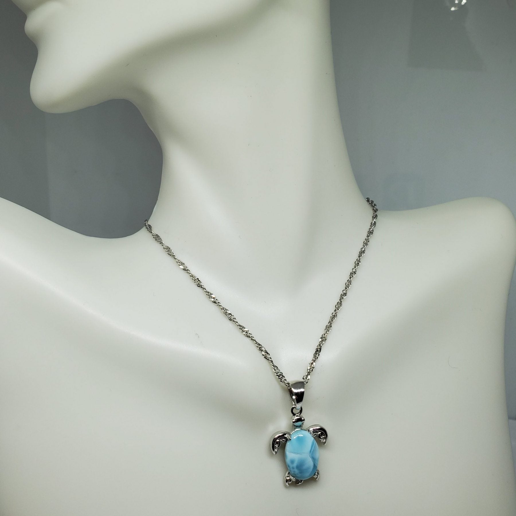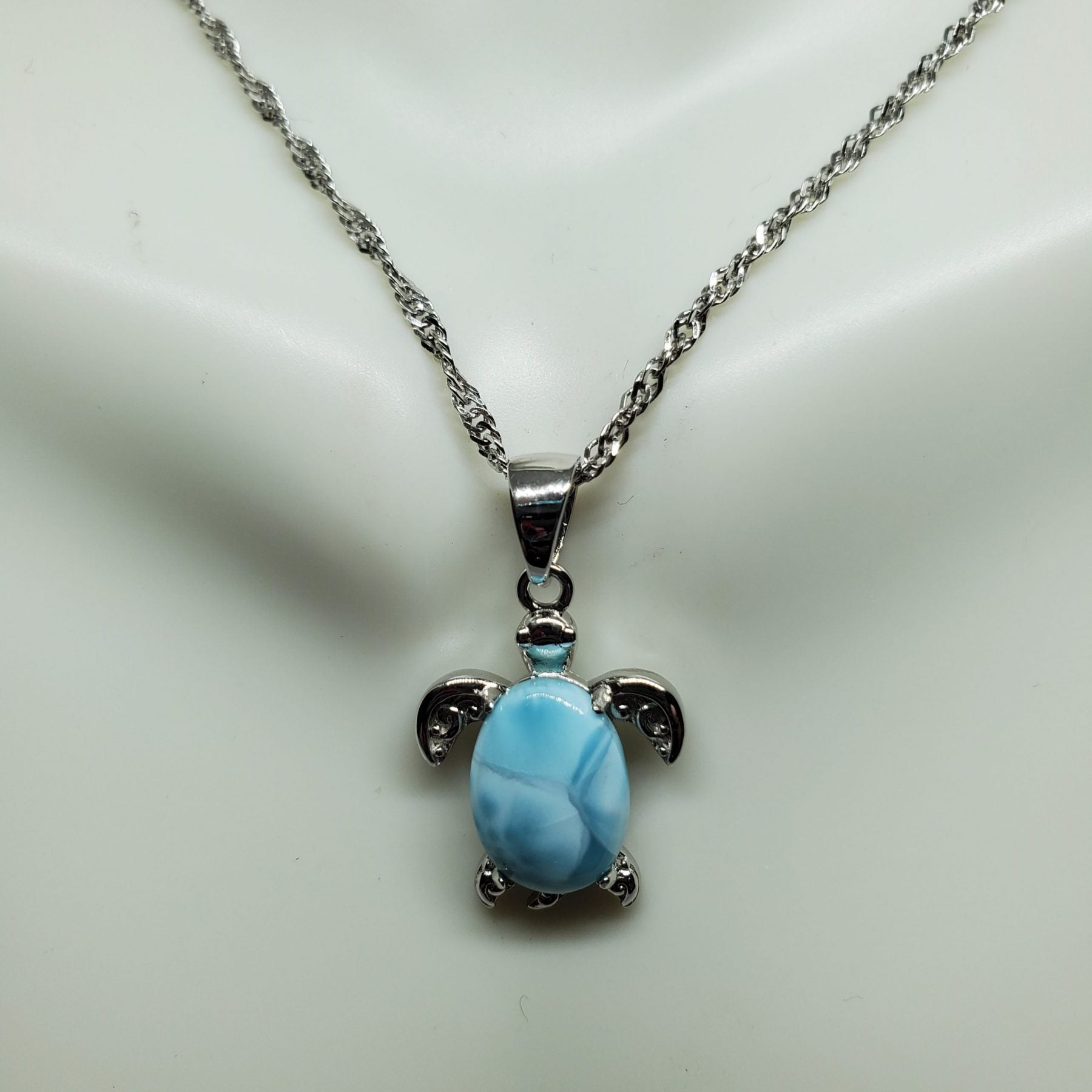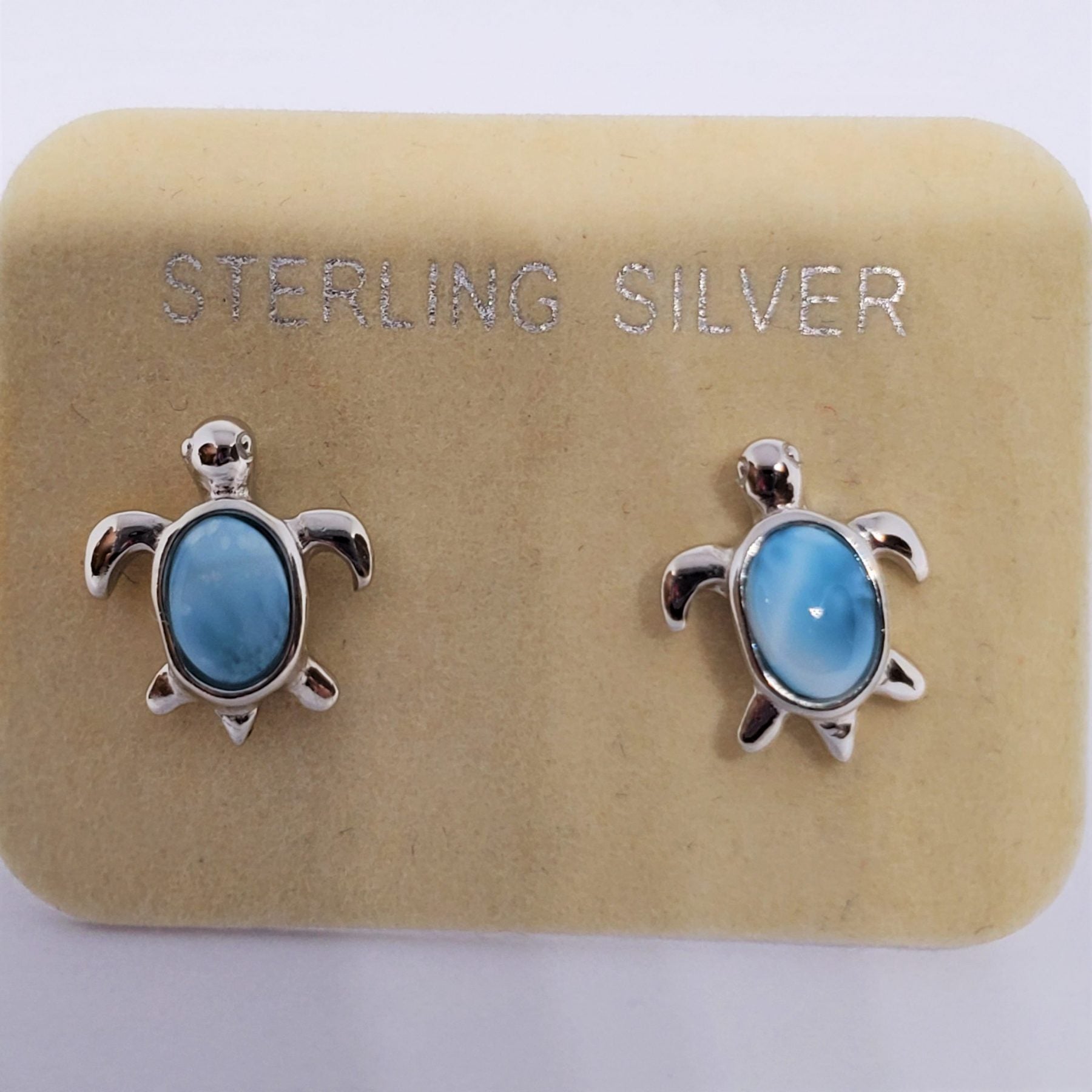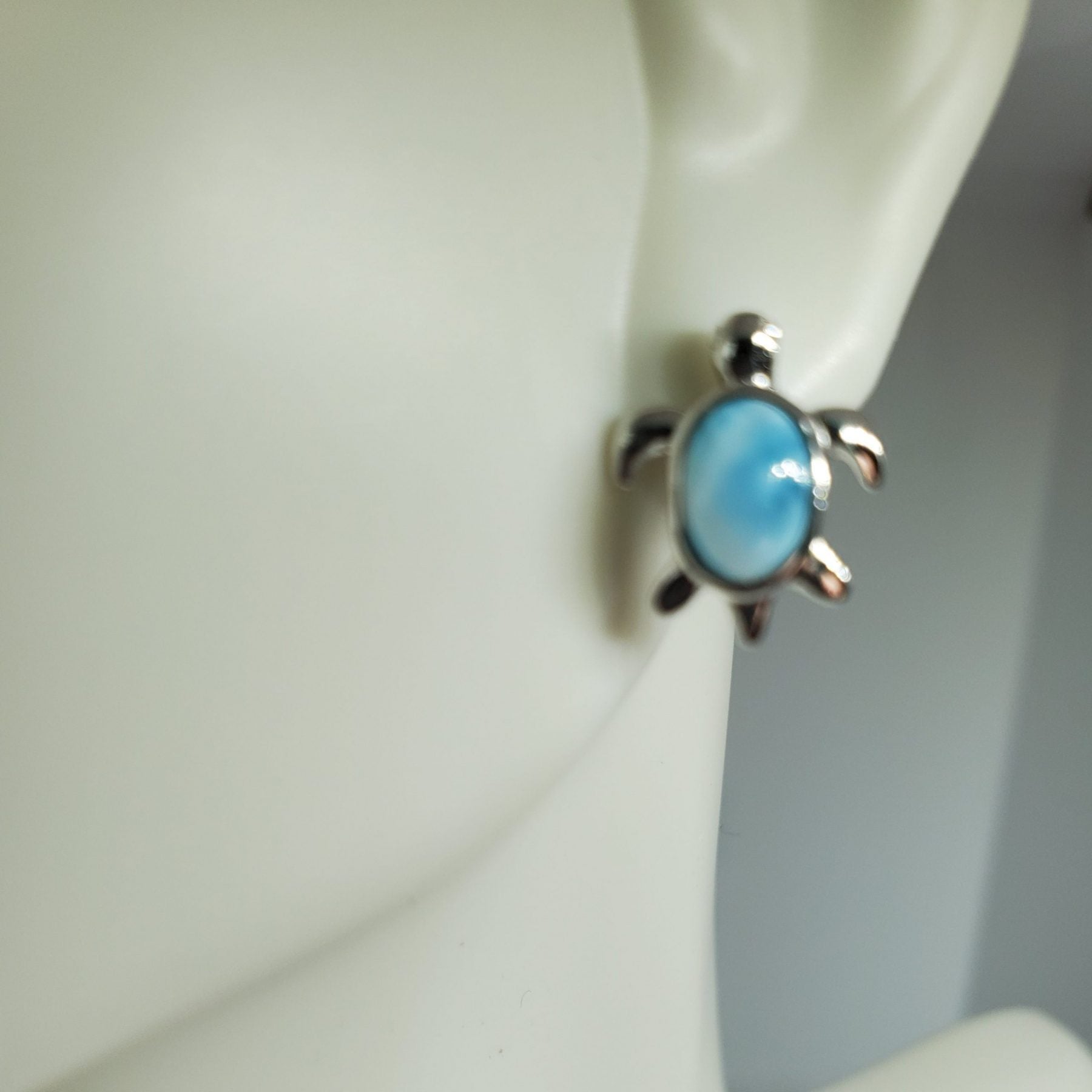 Natural Larimar turtle pendant (14mm L) and stud earring (9mm L) set. Chain shown not sold with set in photo but can be purchased separately it is item #334