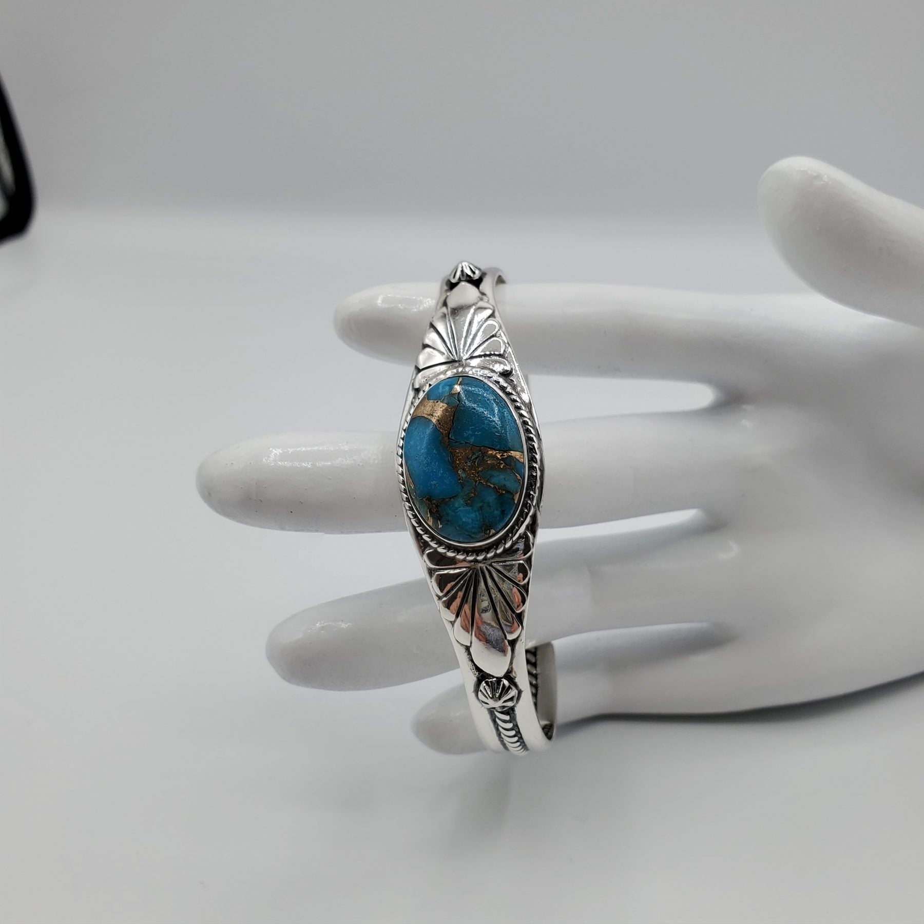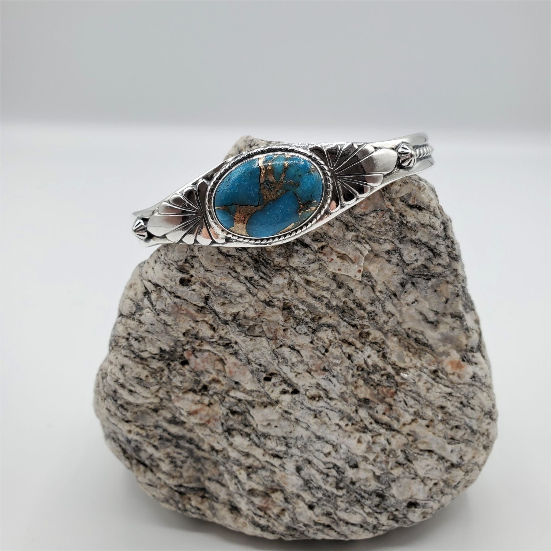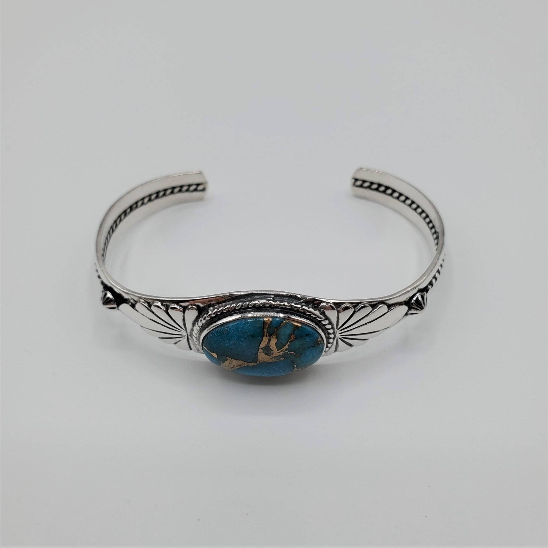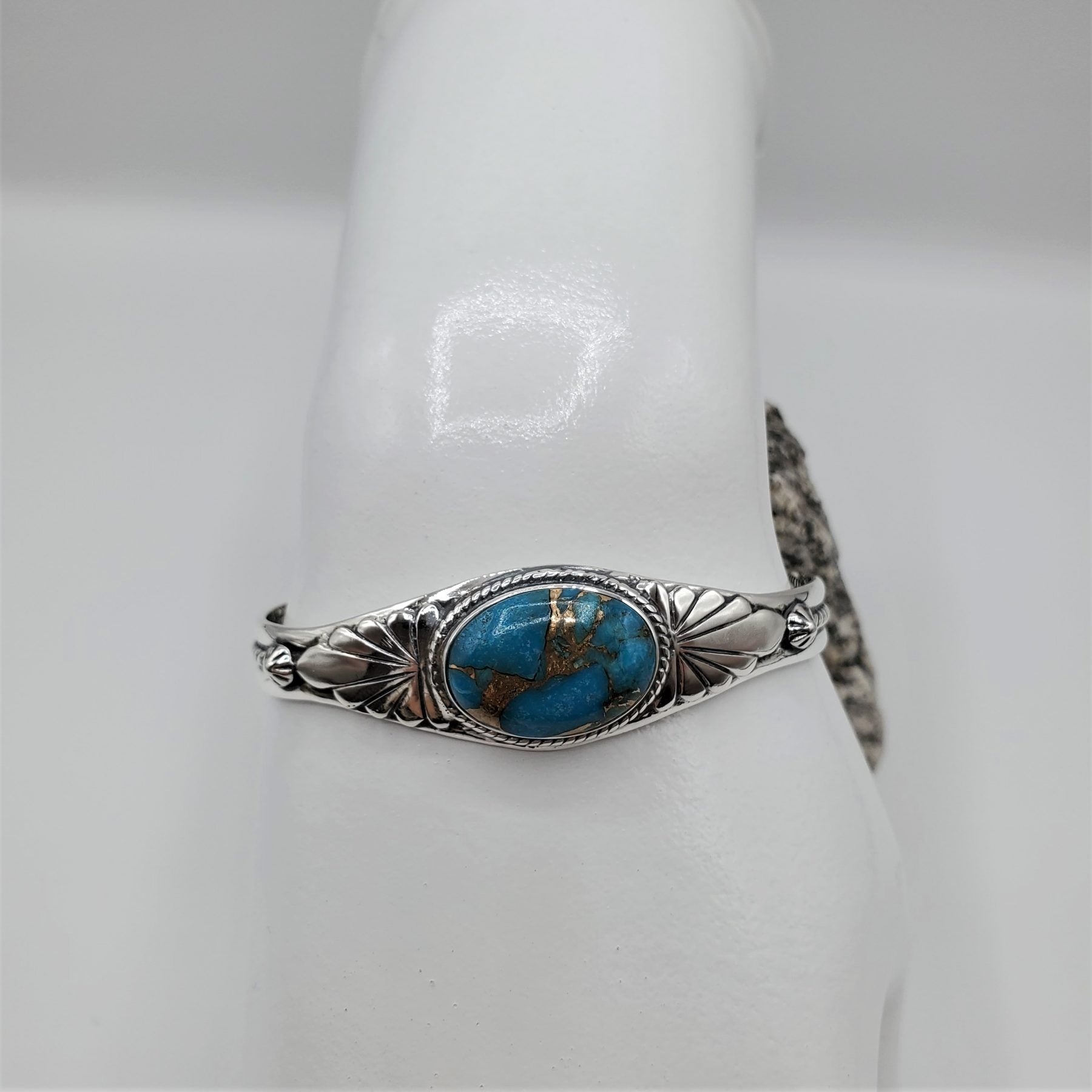 Matrix Turquoise Cuff Bracelet set in .925 Sterling Silver. Oval center stone is 4.5mm in length x 1mm in width set in a southwest design bracelet. Fits wrists sizes 6-8