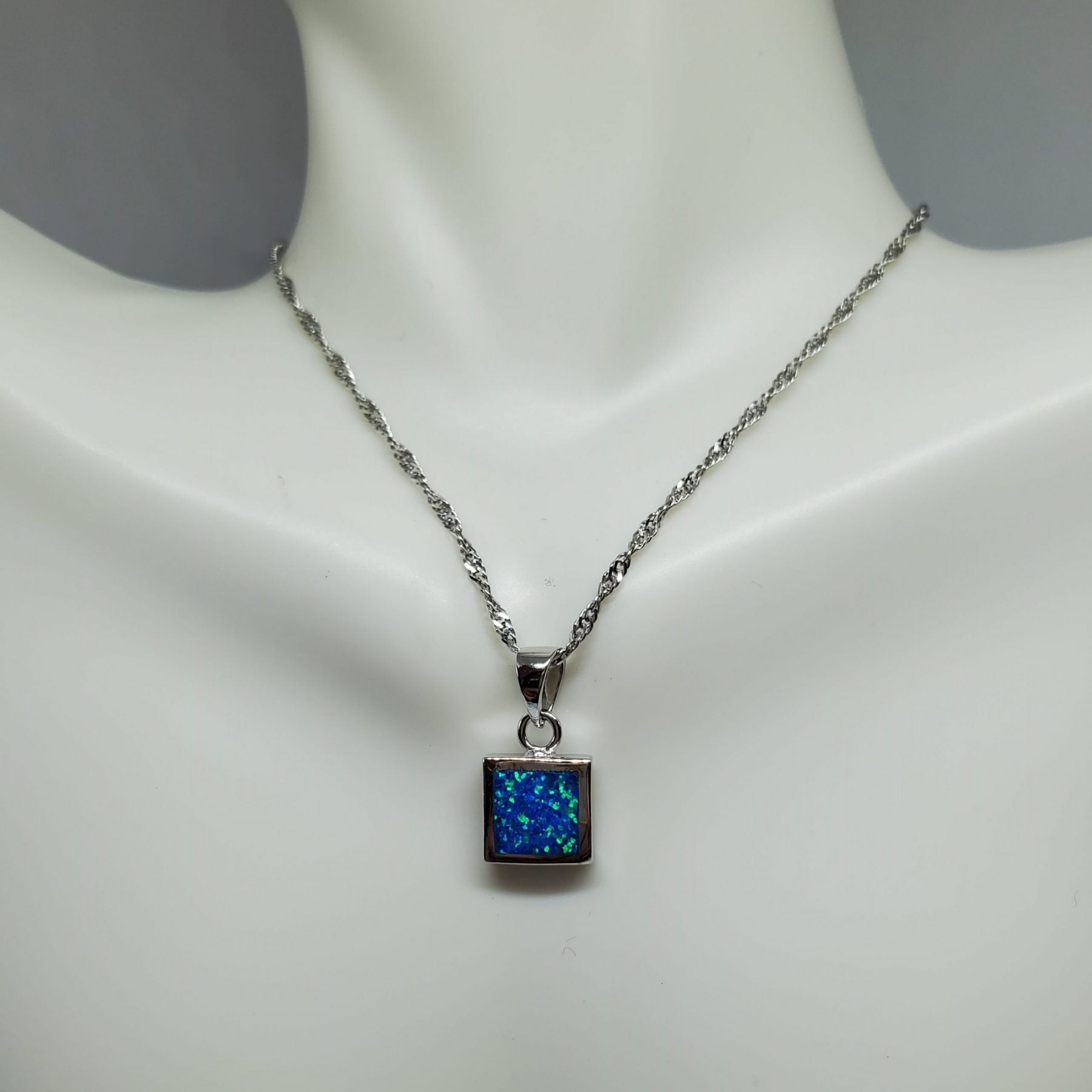Blue Opal Princess cut .41" square in .925 Sterling Silver with 20" silver chain. (chain in photo not included in sale)