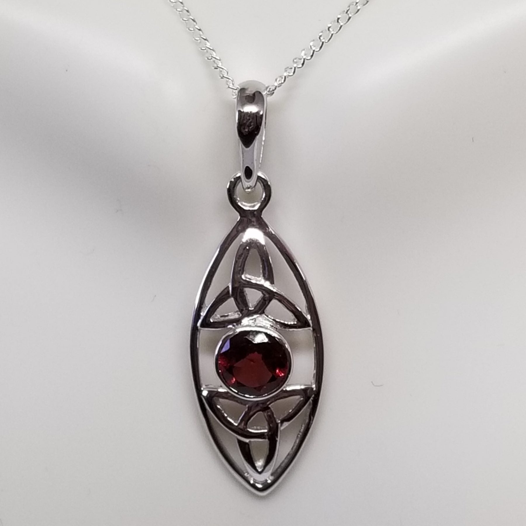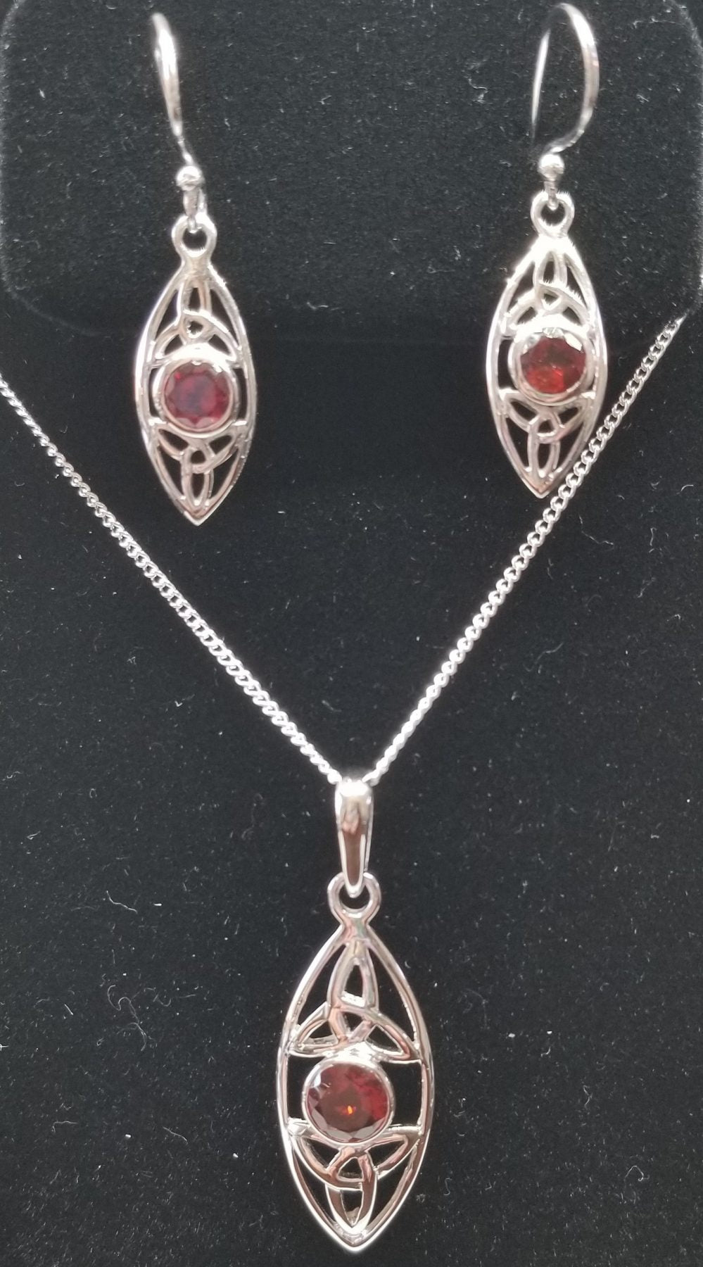 Garnet pendant with matching earrings on a 20" .925 silver chain.