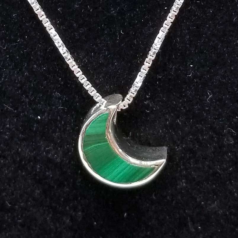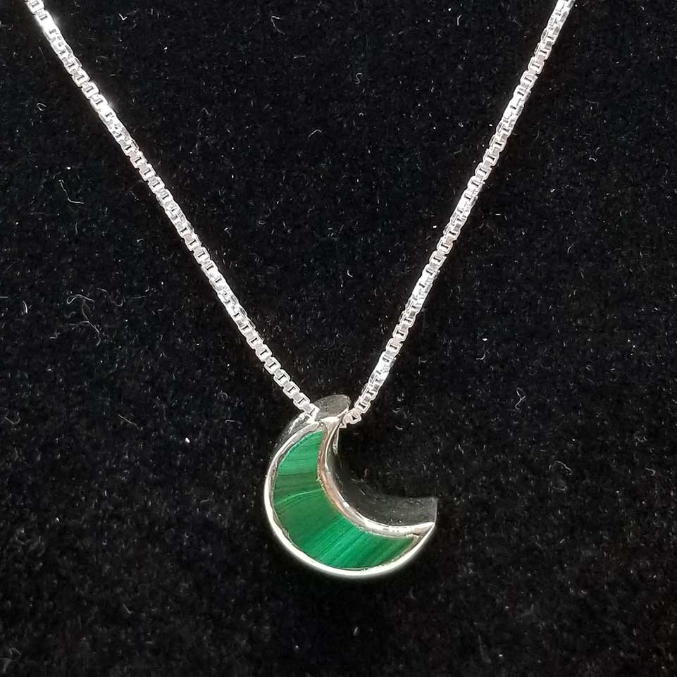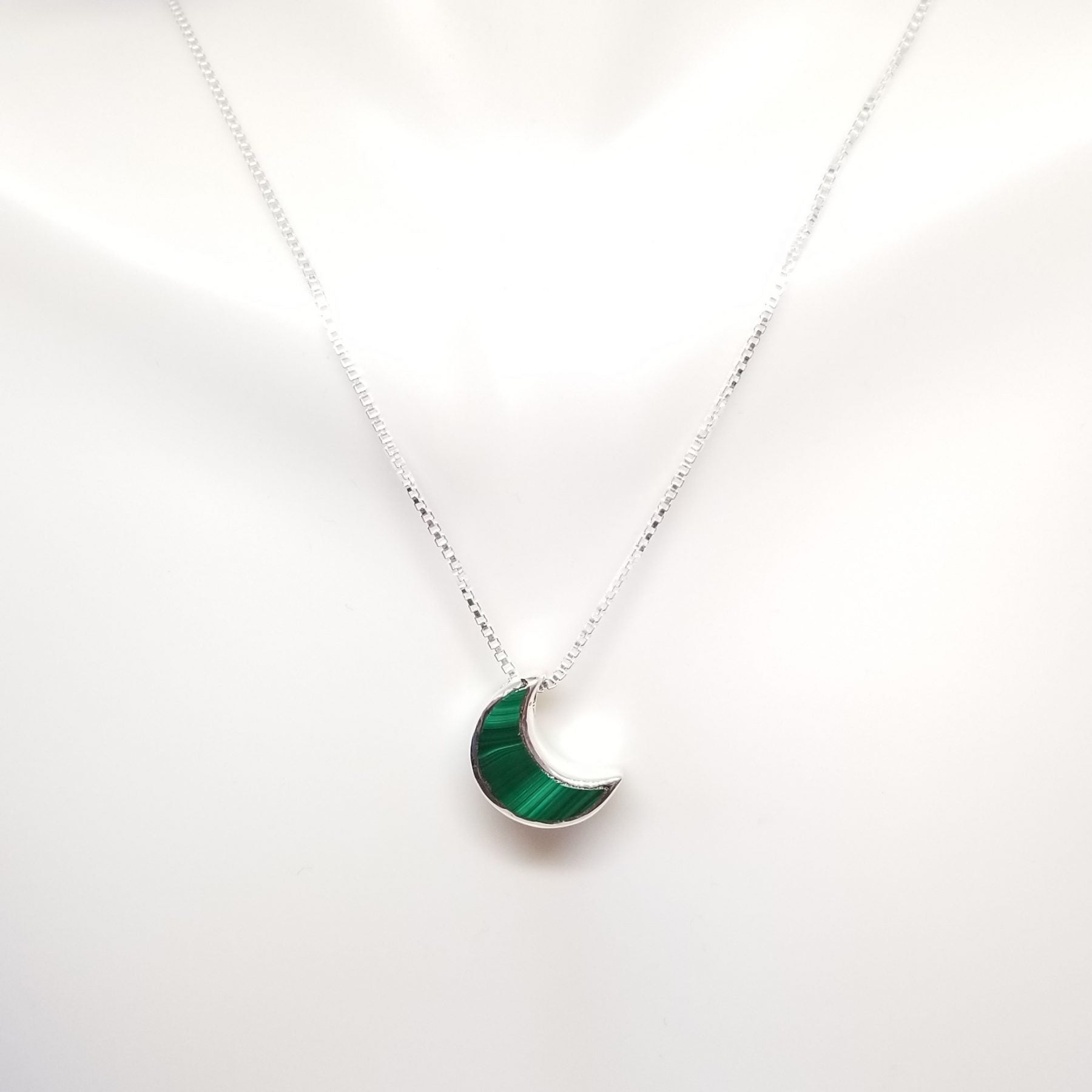 Natural Malachite set a moon shape with .925 silver 20" chain.