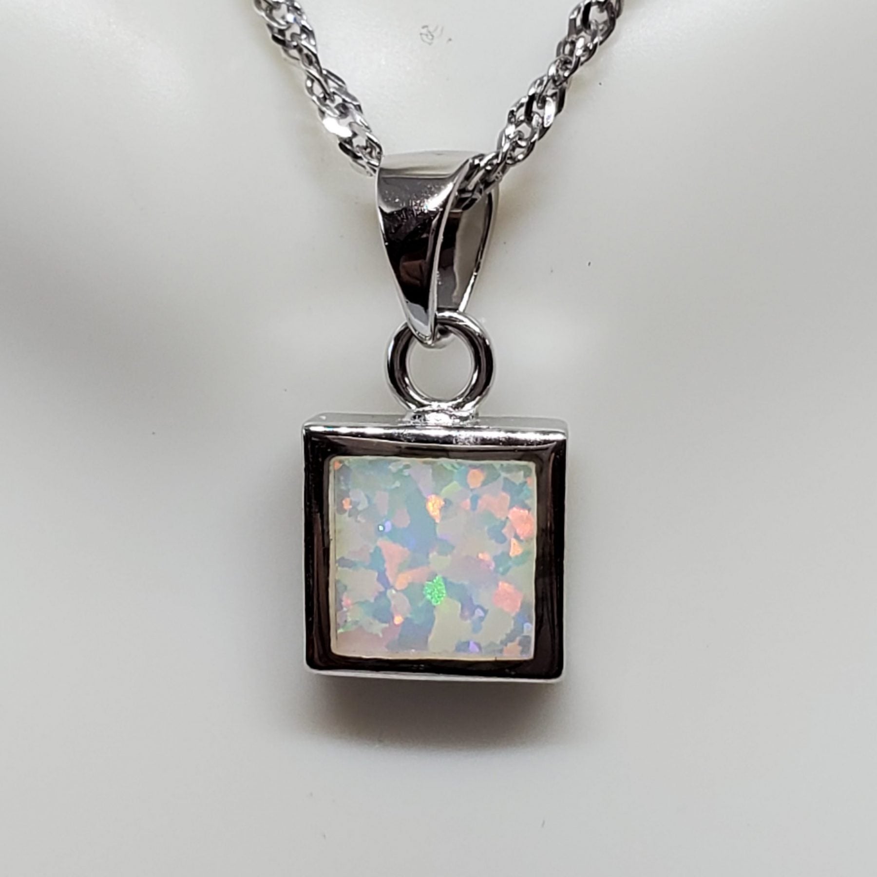 White Opal Princess cut .41" square in .925 Sterling Silver with 20" silver chain. (chain in photo not included in sale)