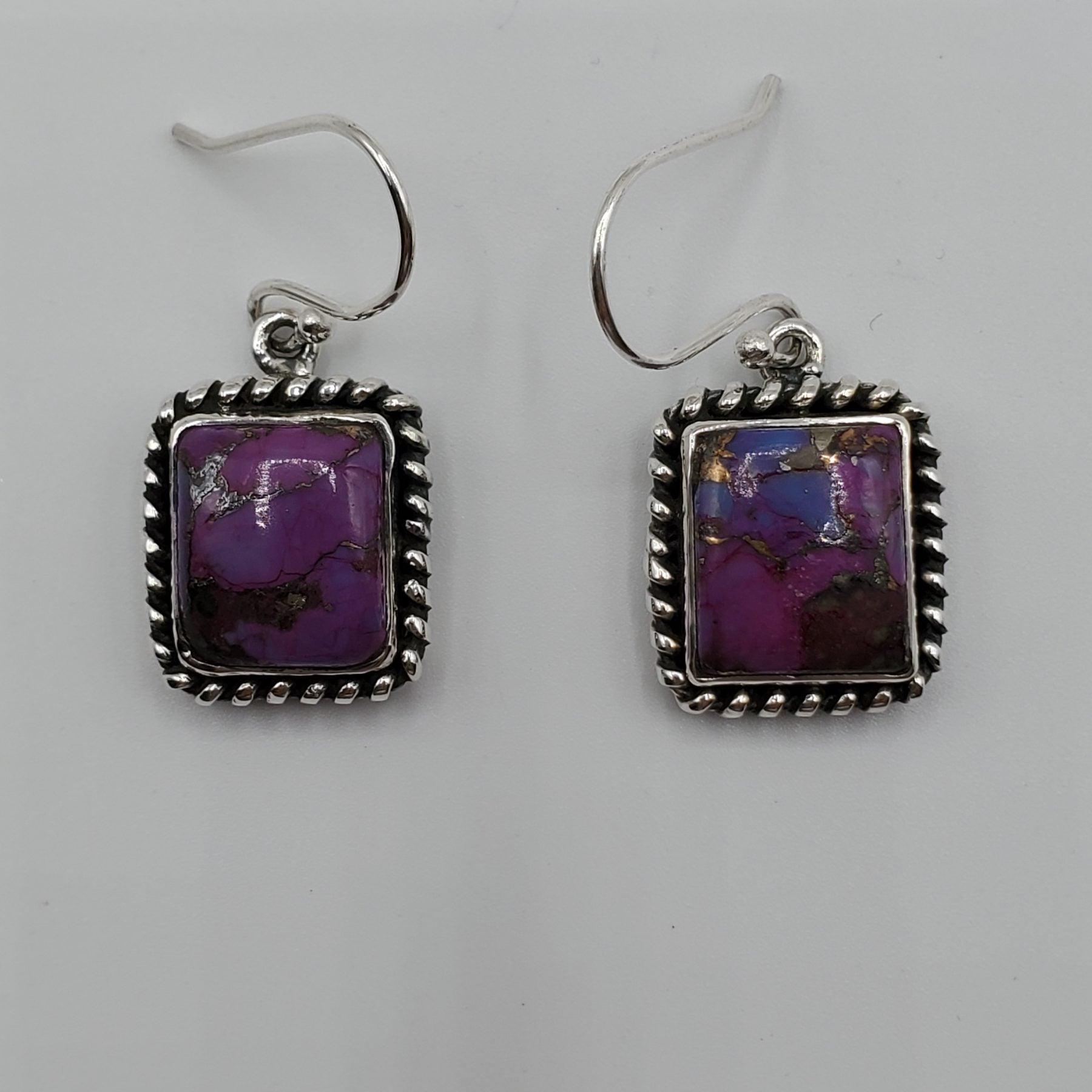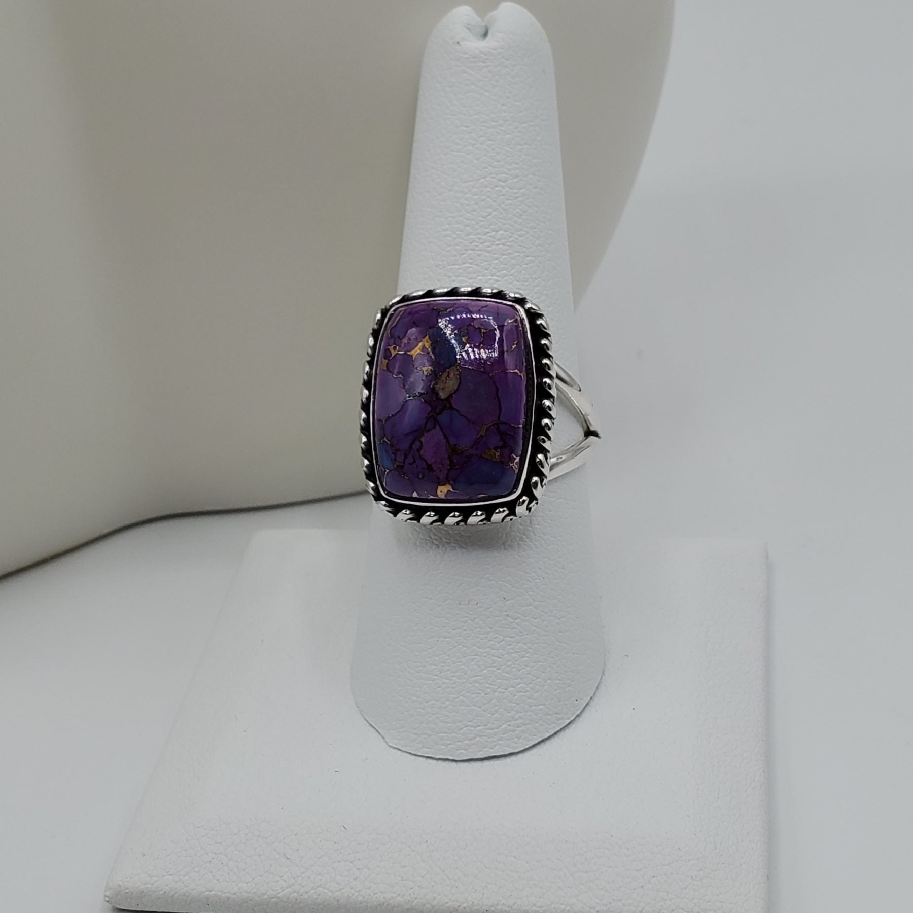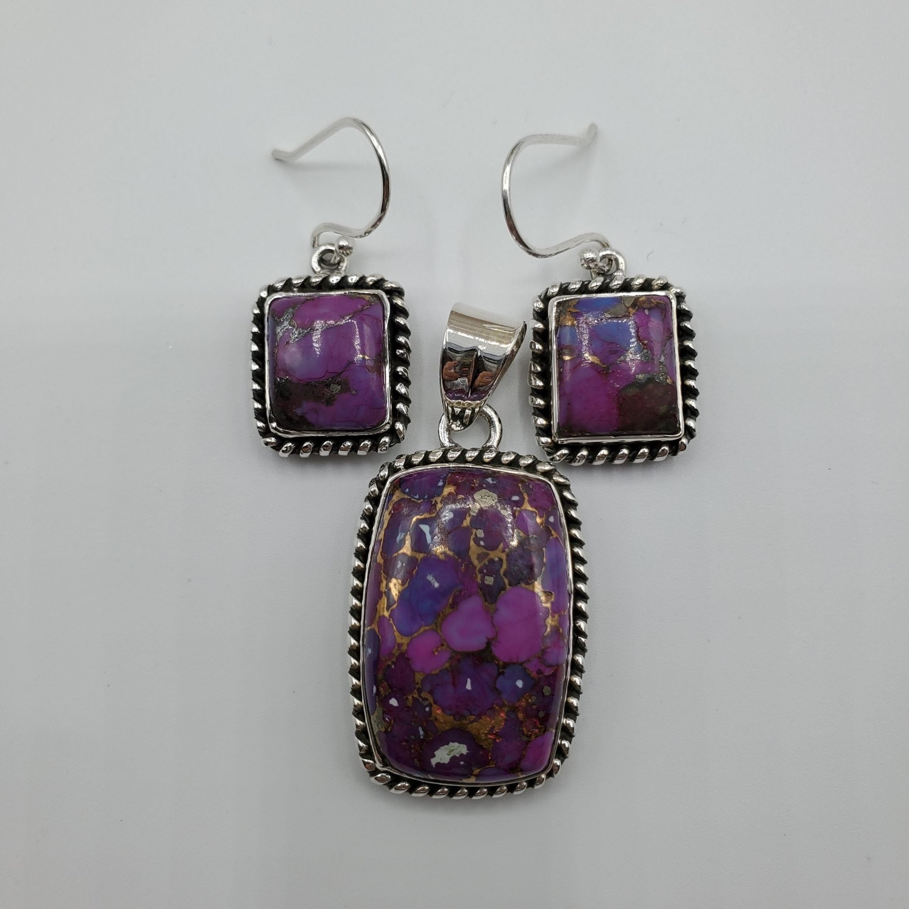 .925 Silver Mohave Purple Copper Turquoise pendant, earring and ring set. This striking set has beautiful copper veins running through the purple turquoise pictures do not do this set justice.