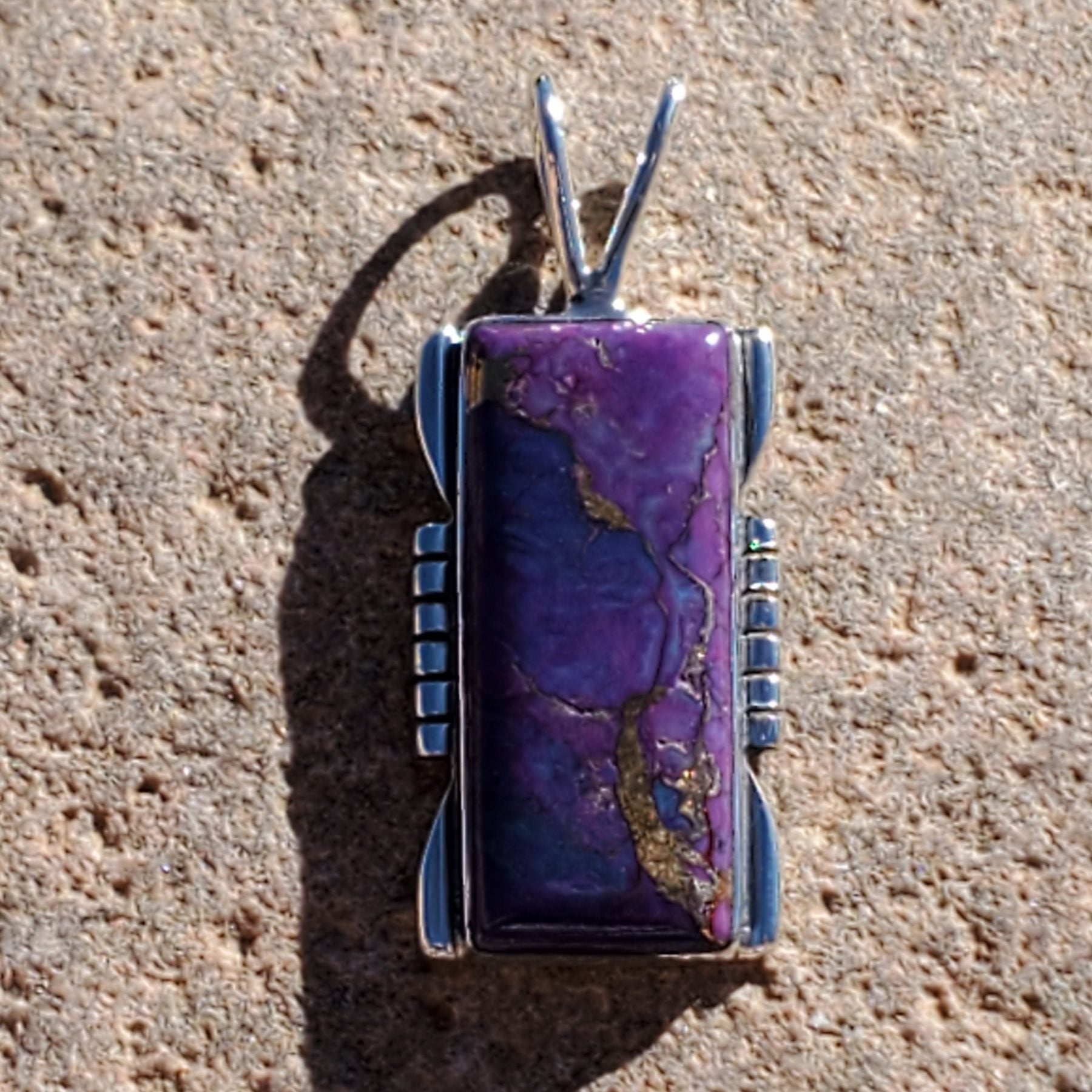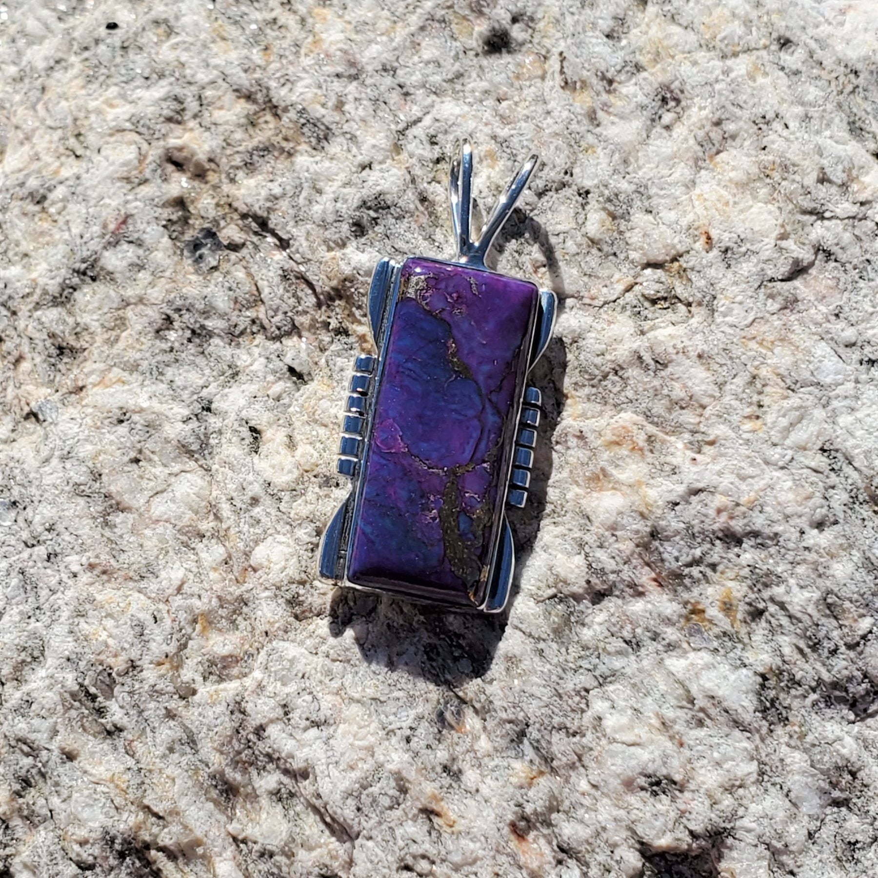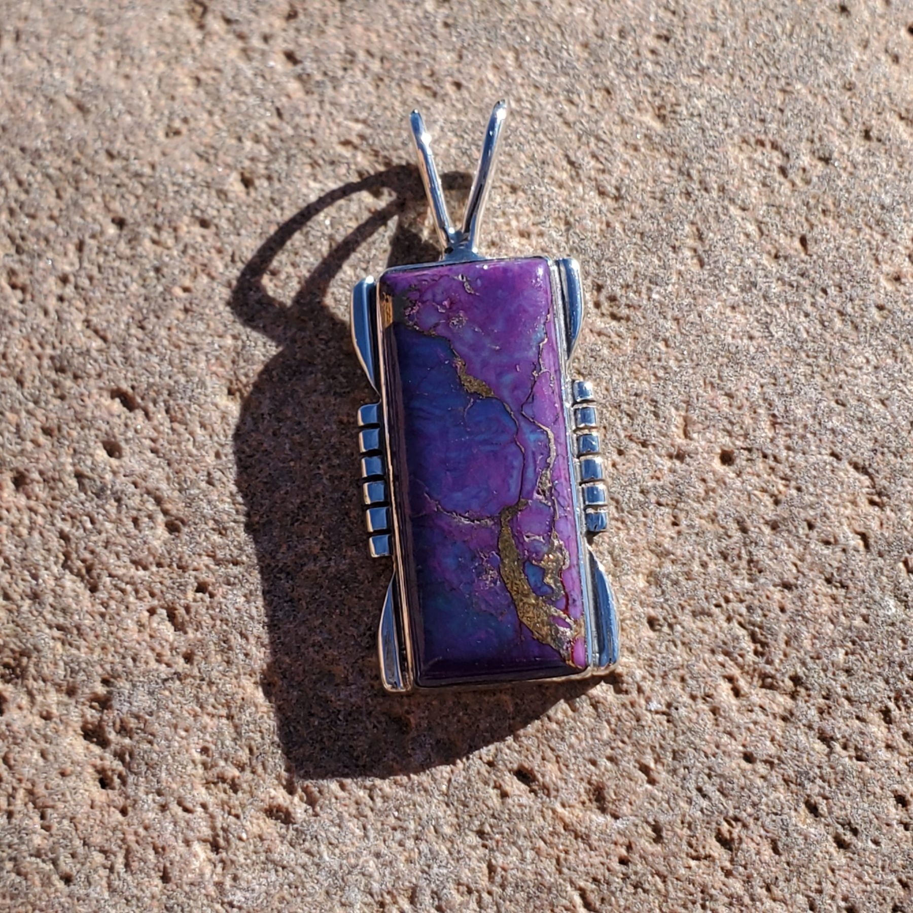 Mohave Purple Turquoise Pendant 30mm in length x 7mm in width. This item can be worn on a silk cord or any .925 Sterling Silver chain like item# 334 in this inventory.