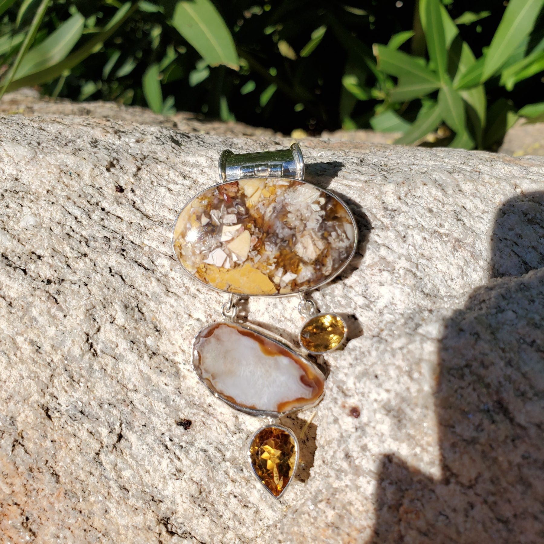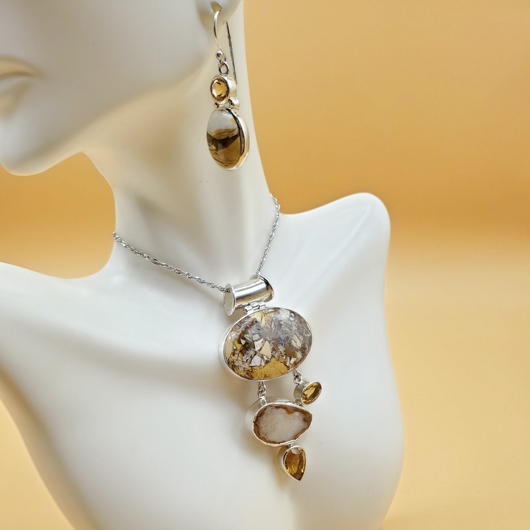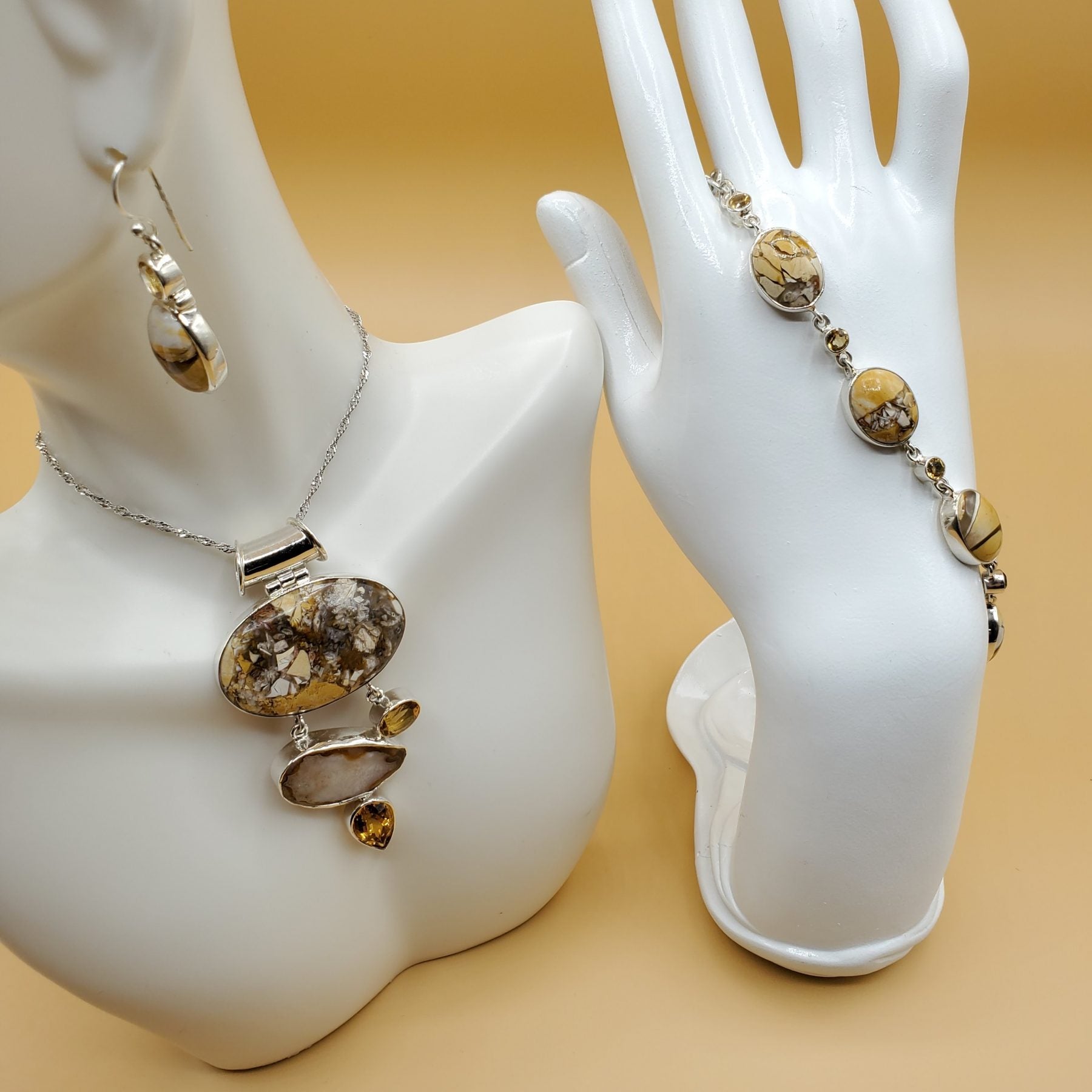 Multi colored Mookaite with Citrine accents gift set with Pendant 70mm in length (chain shown not sold with set but may be purchased separately item # 334) , Earrings 23mm in length, and Bracelet 21 mm in length with an adjustable toggle clasp set.