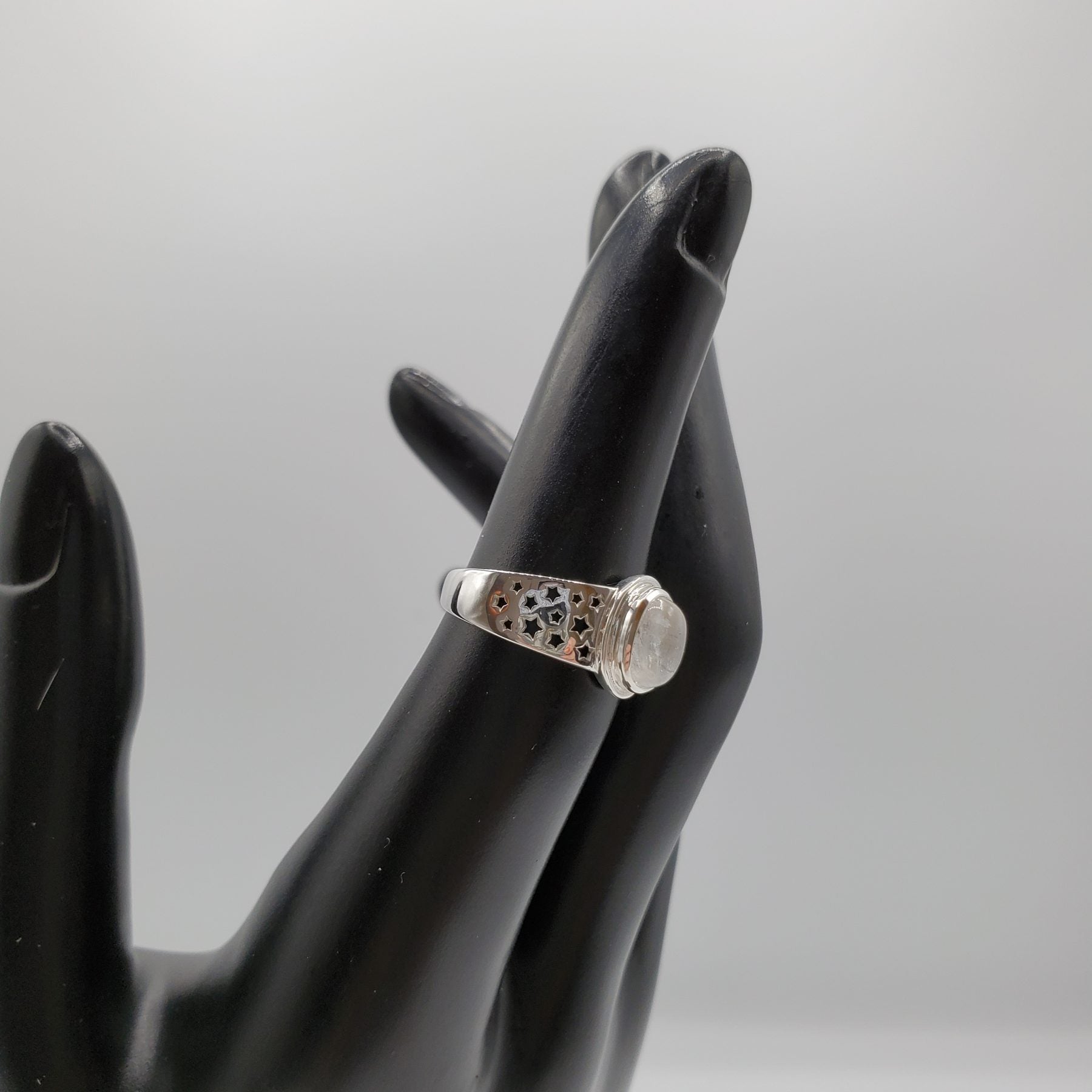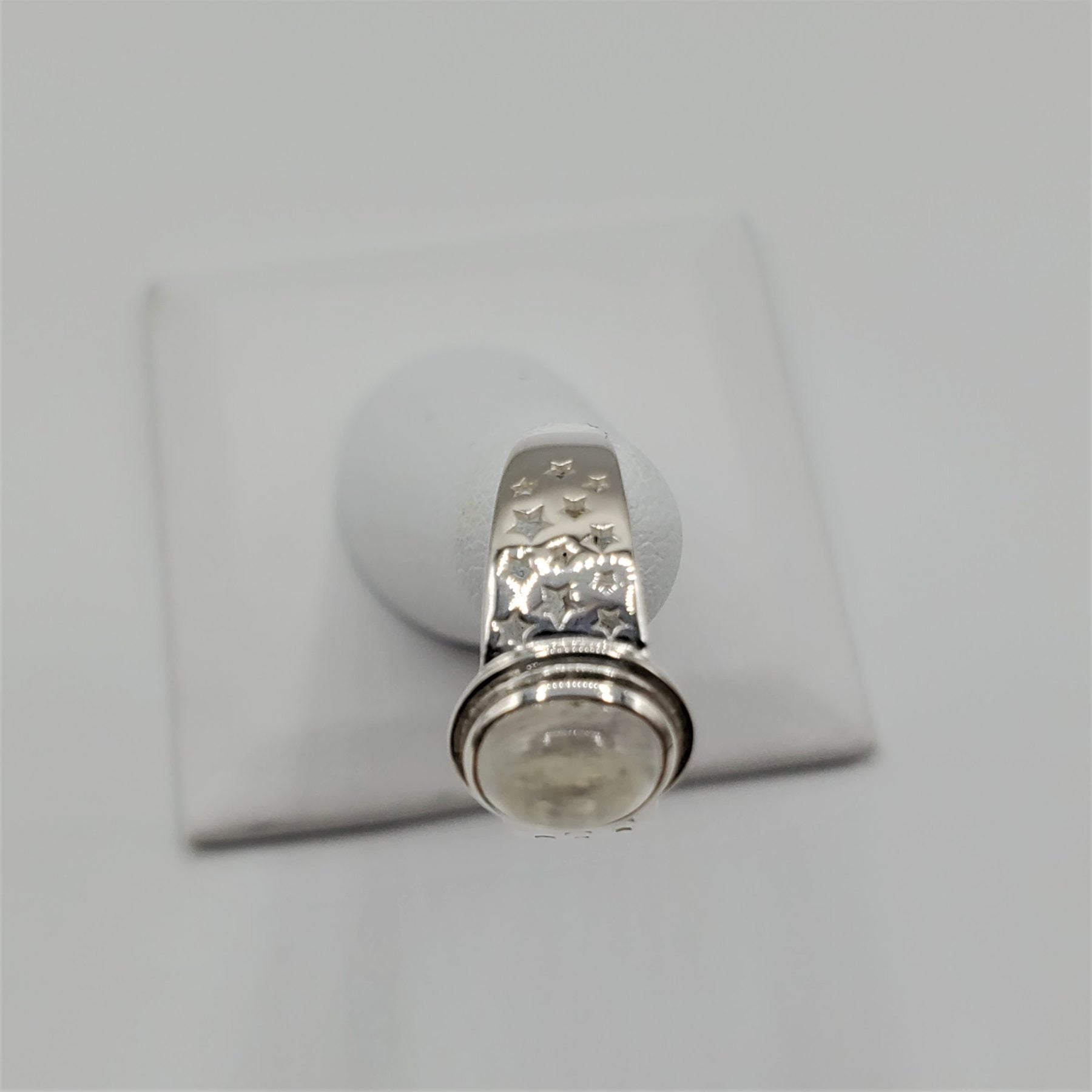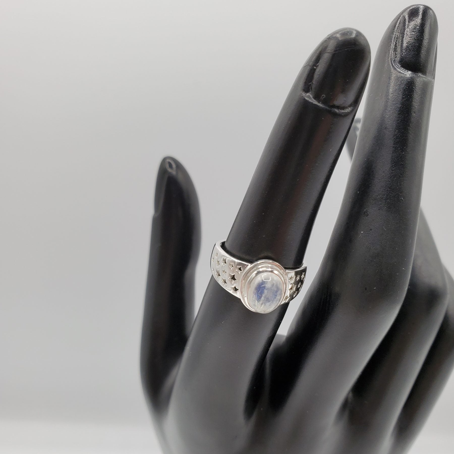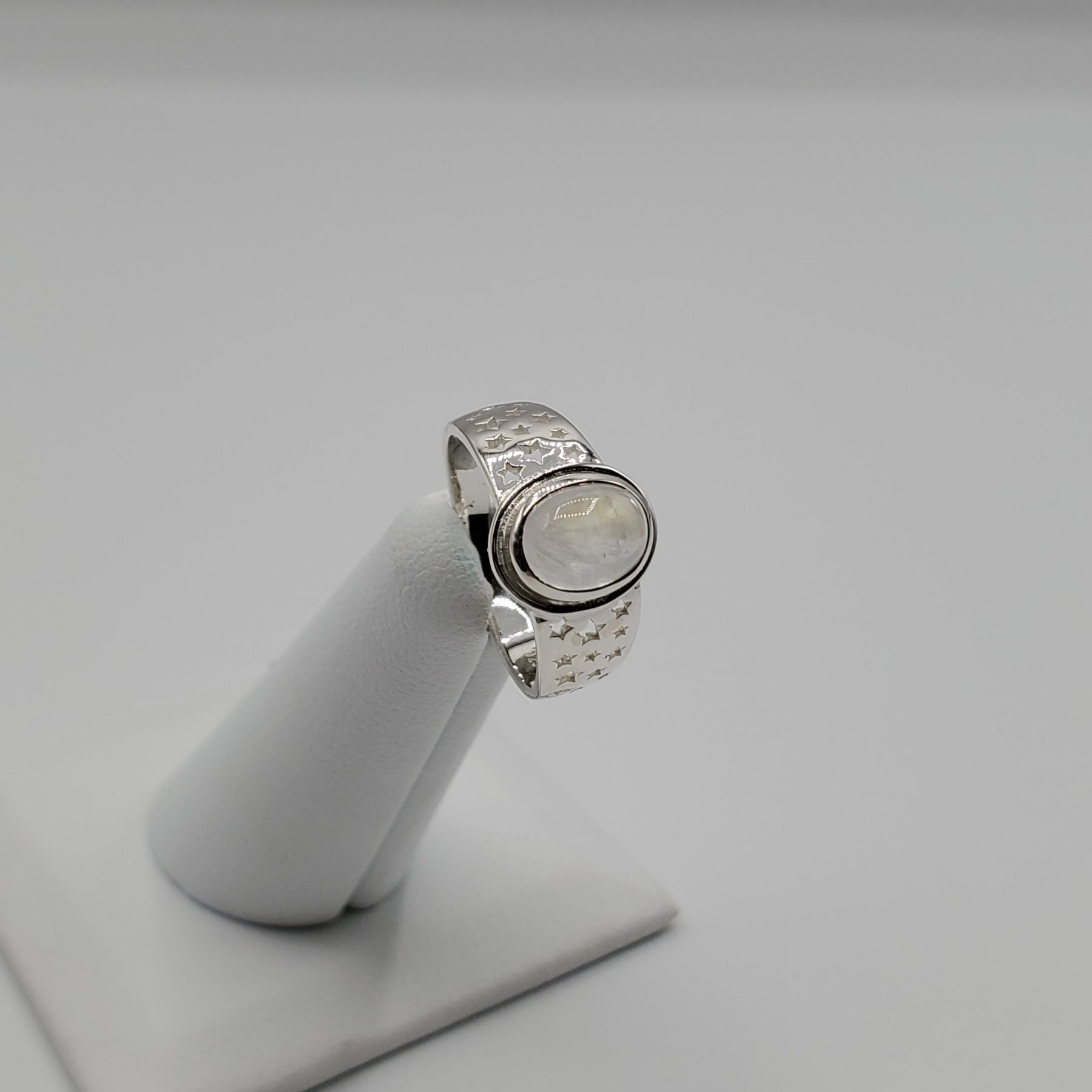 Moonstone Ring with an oval cut 8x6mm cabochon set in a band of .925 sterling silver stars.