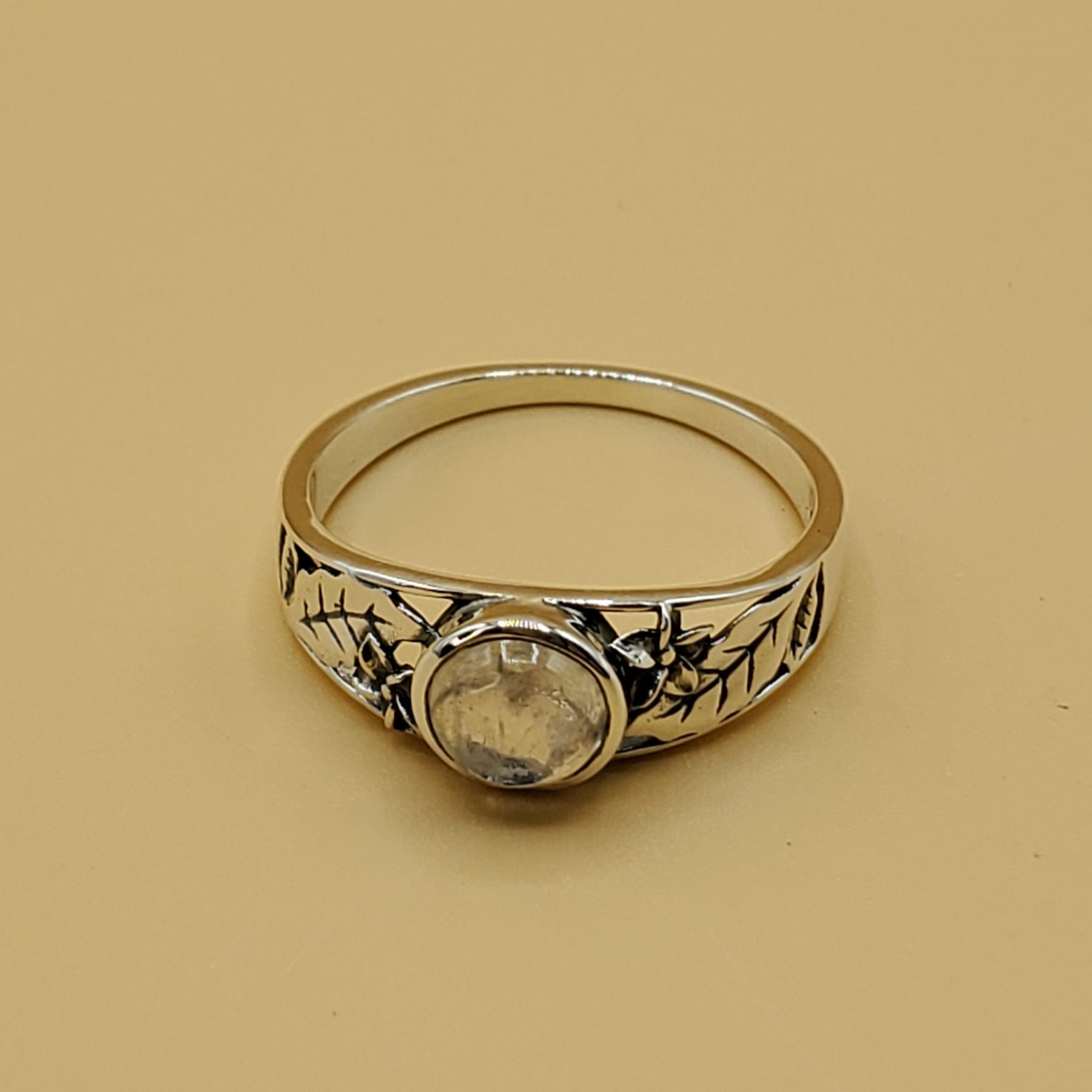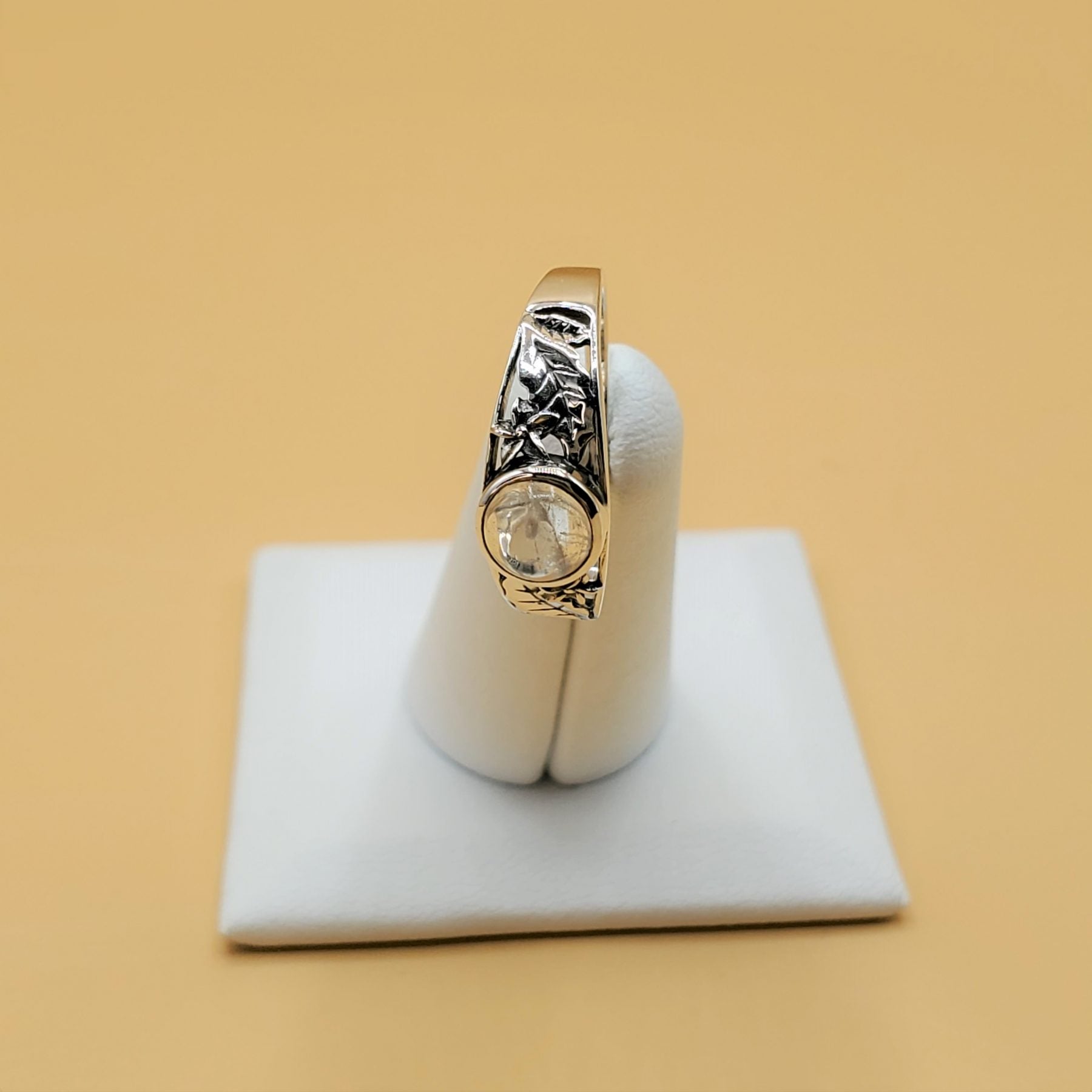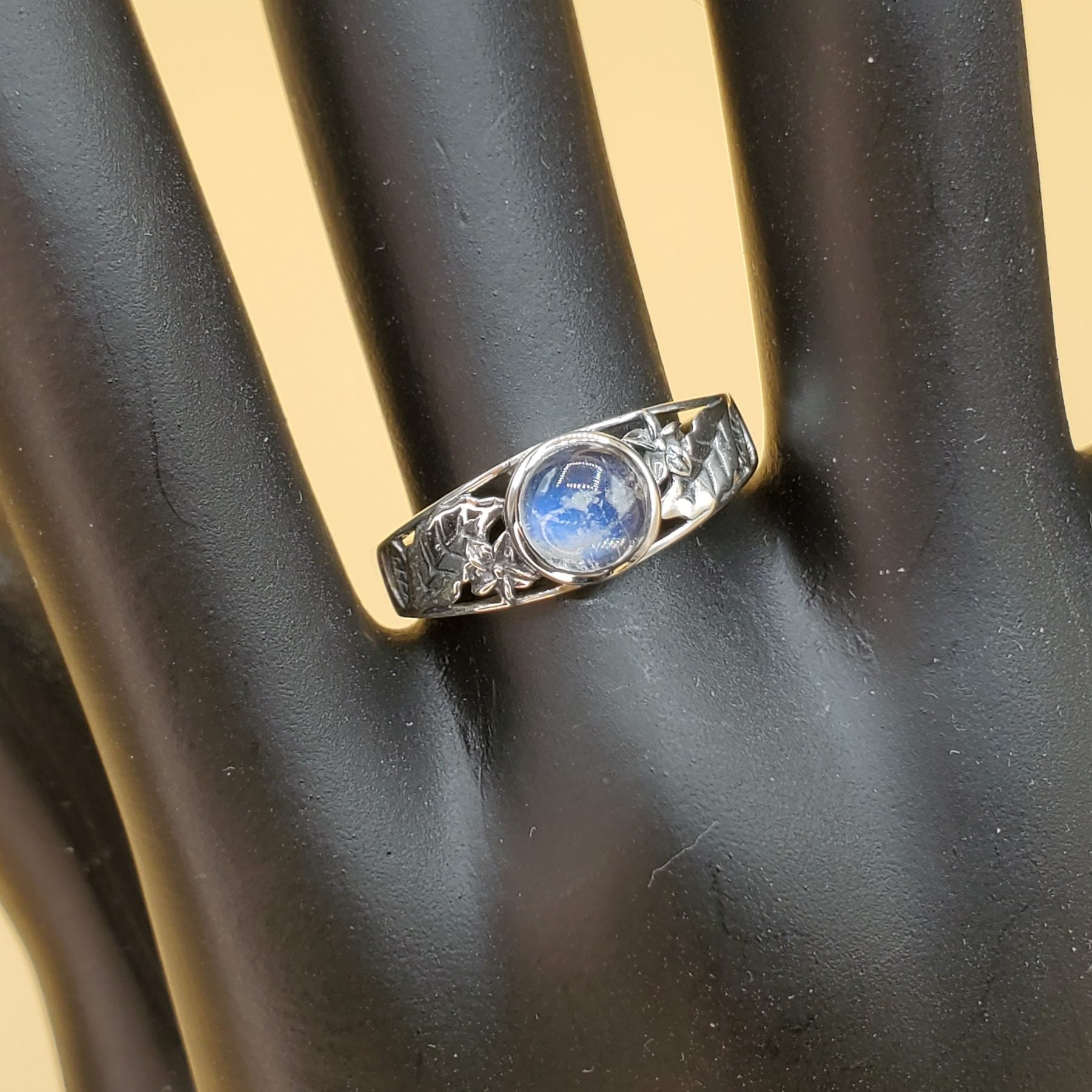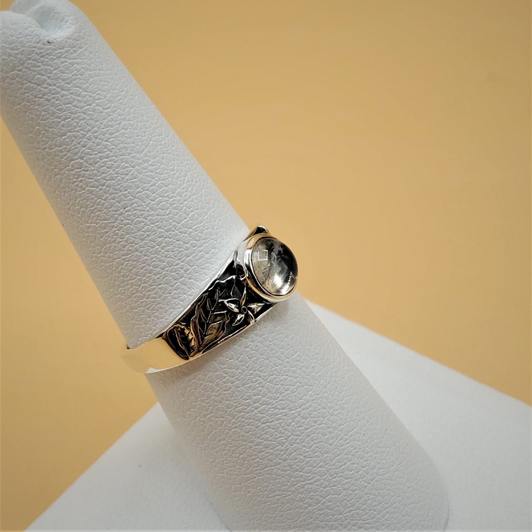 Moonstone Ring with center 6mm cabochon stone set in a Sterling Silver frame with carved sunflowers.