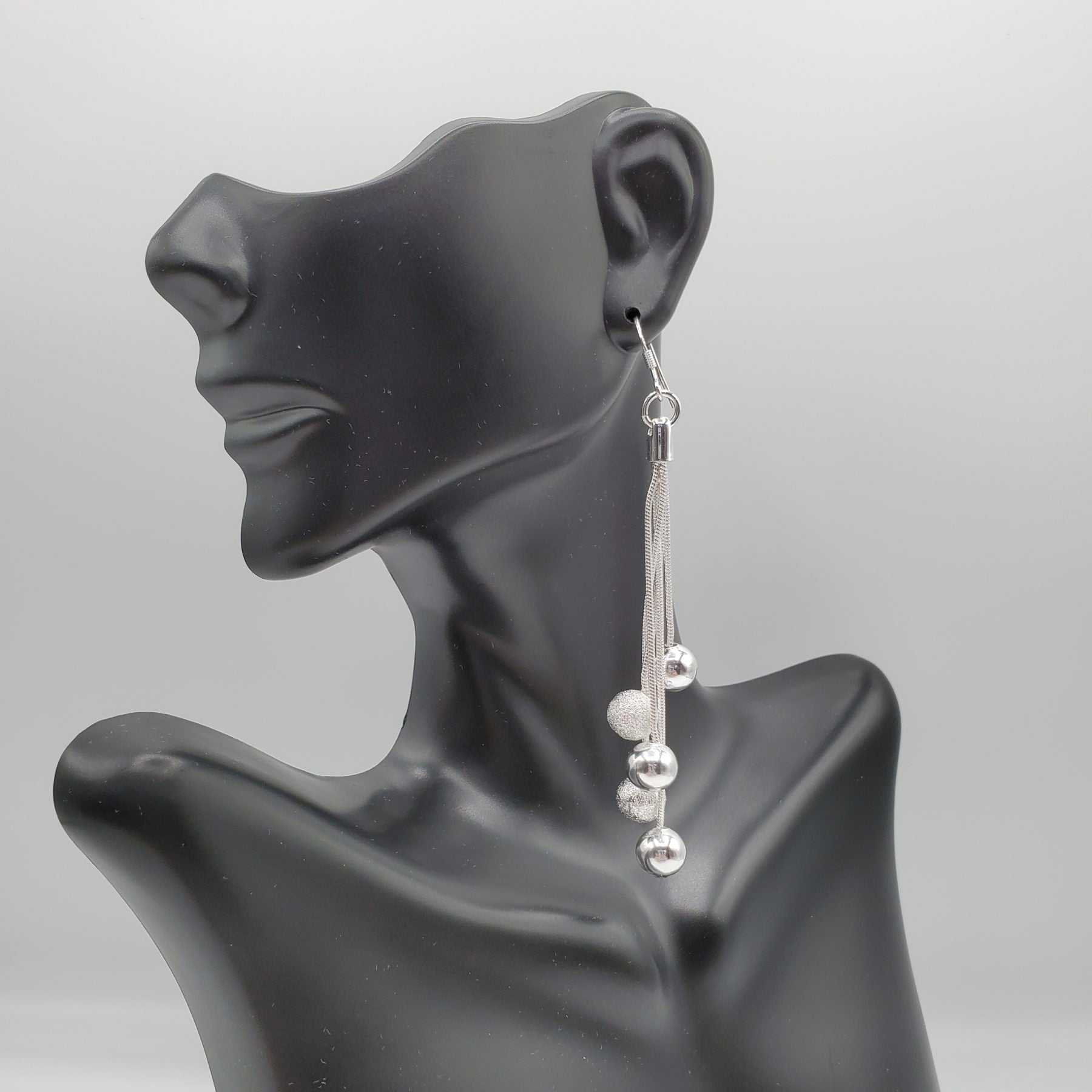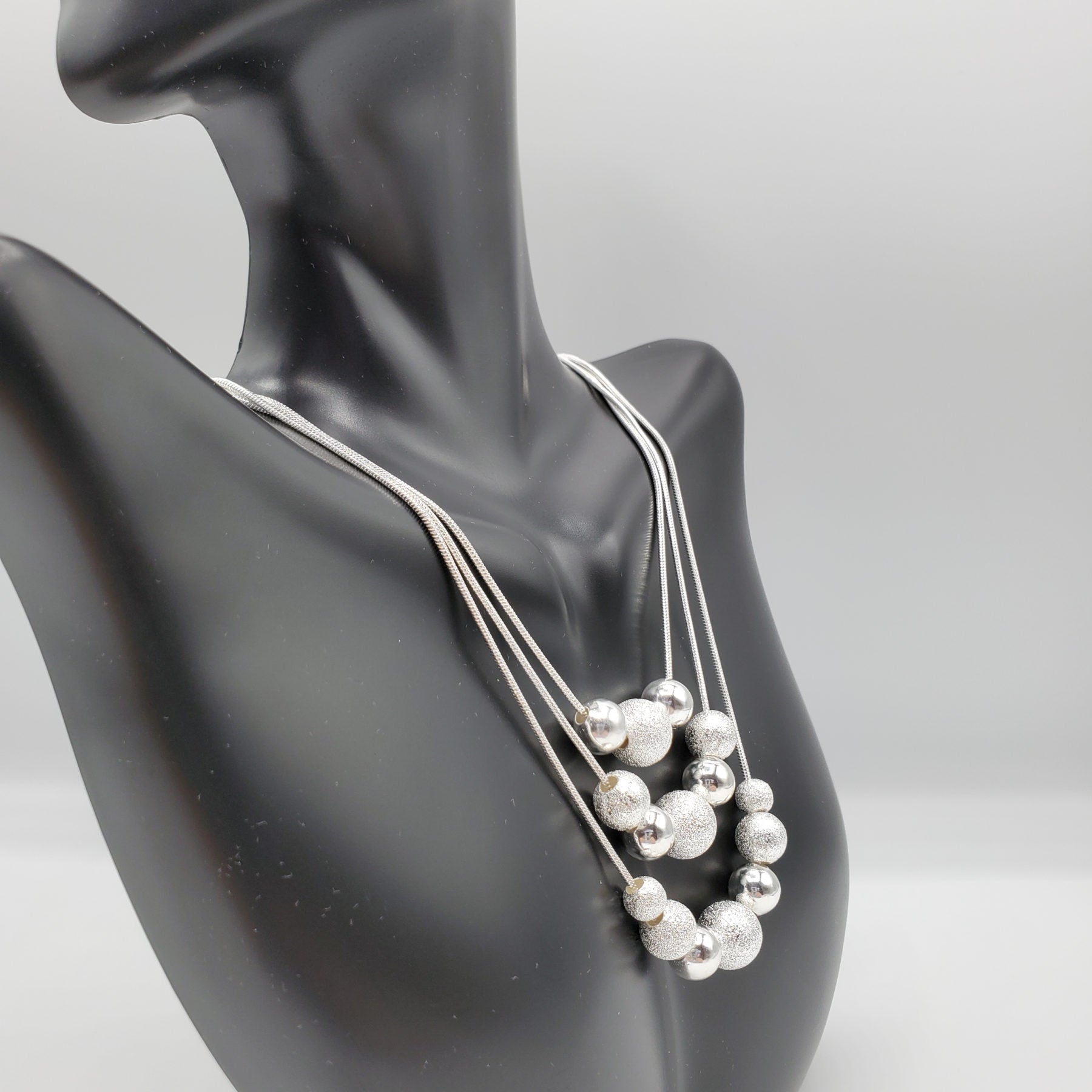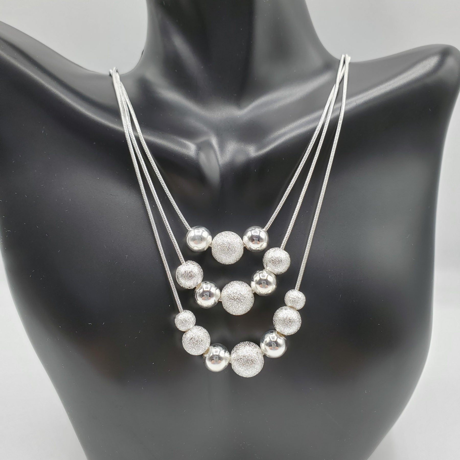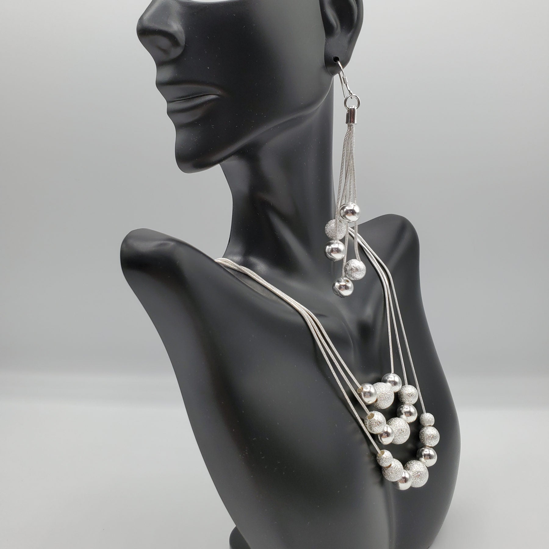 Multi layer necklace and earring set in .925 Sterling Silver with the center accent bead of 10mm on each layer. Earrings are 48mm in length and necklace is layered from 16" -20"