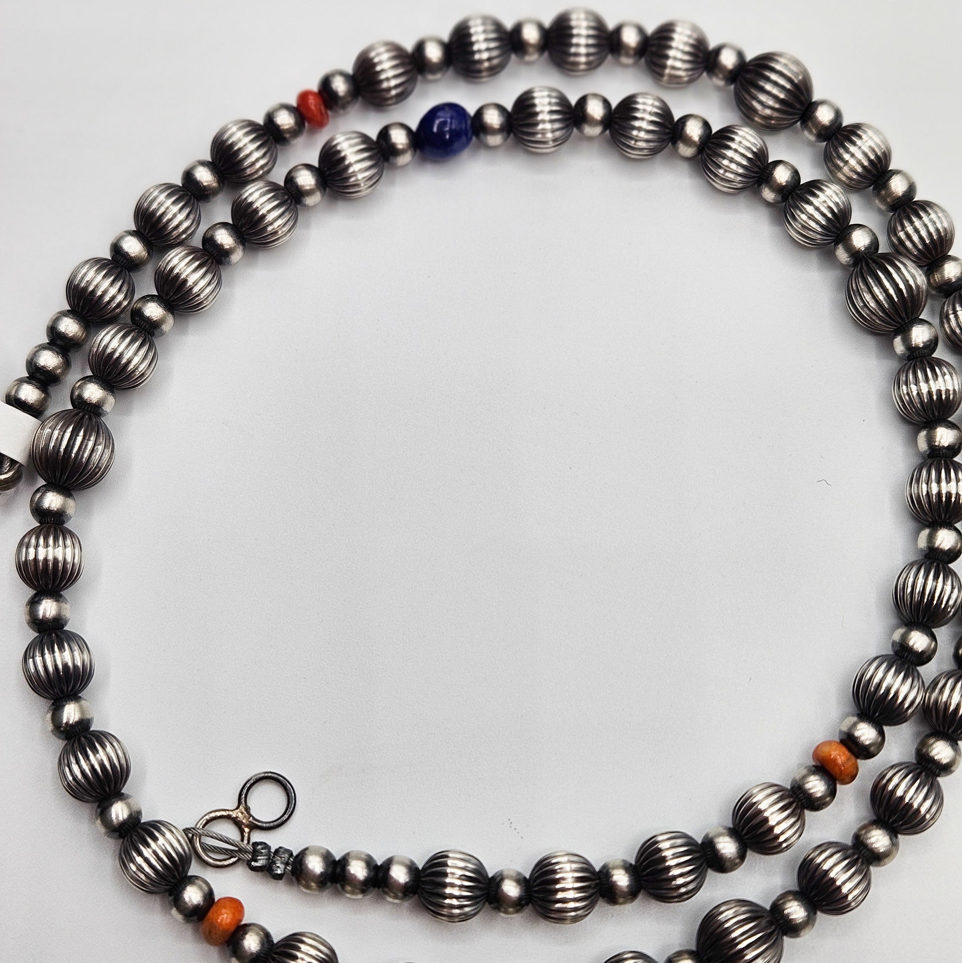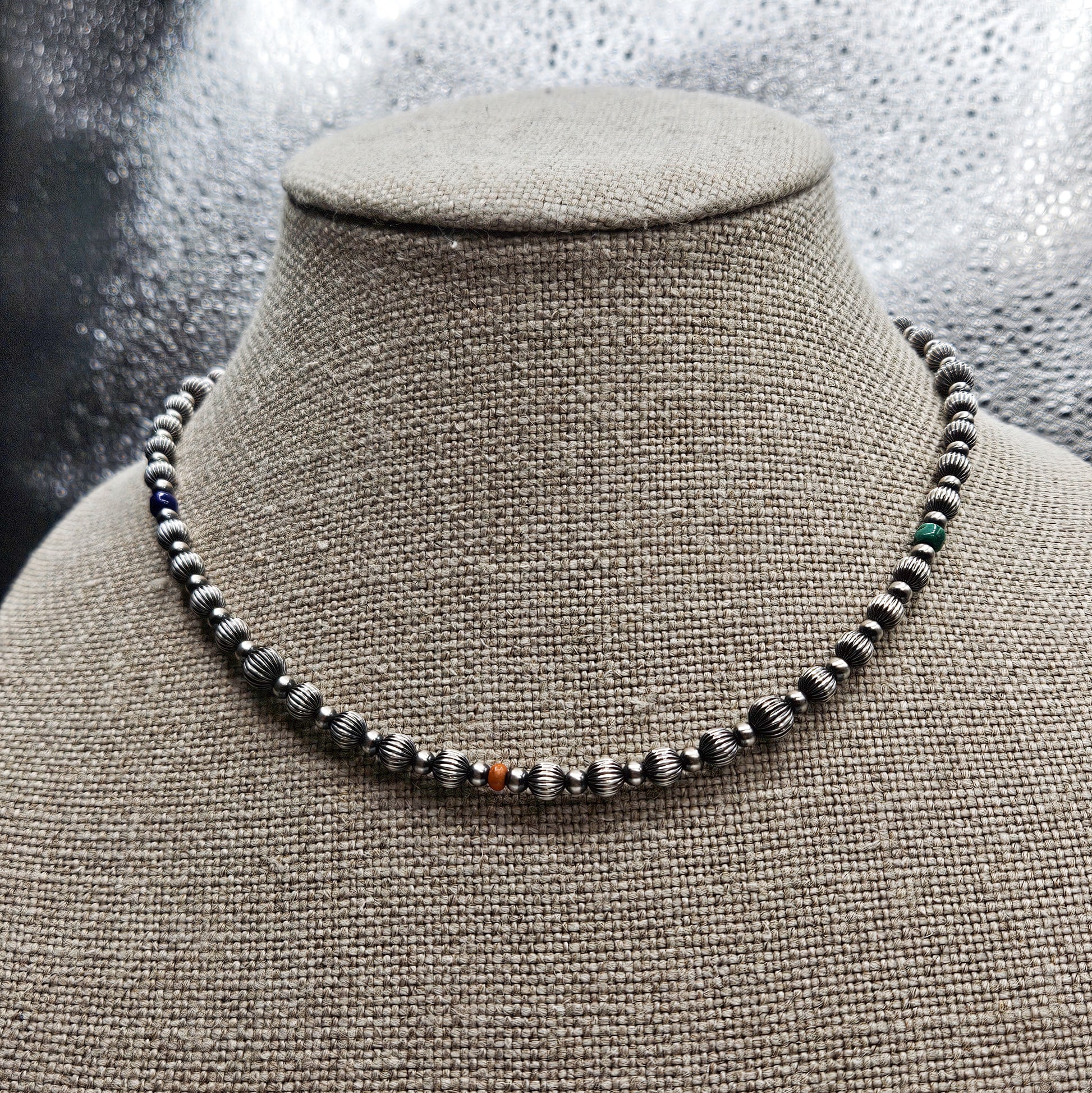 20" Navajo silver bead and natural gemstone necklace containing 5mm stamped bead accented by natural gemstone beads. These necklaces are one of a kind with no two exactly the same and created by indigenous artists.
