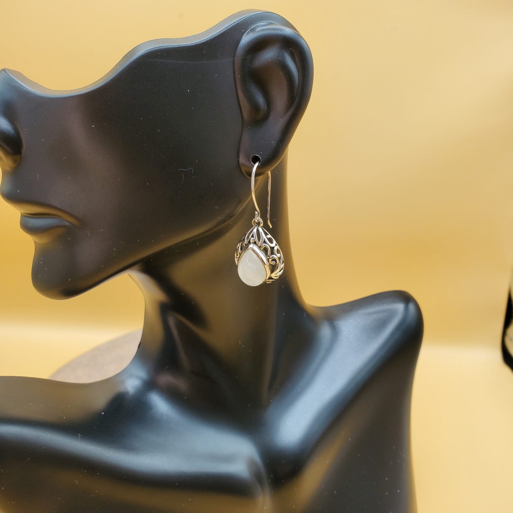 Pear shaped Moonstone Cabochon Earrings(8x12mm) set in a Balinese style setting of Sterling Silver