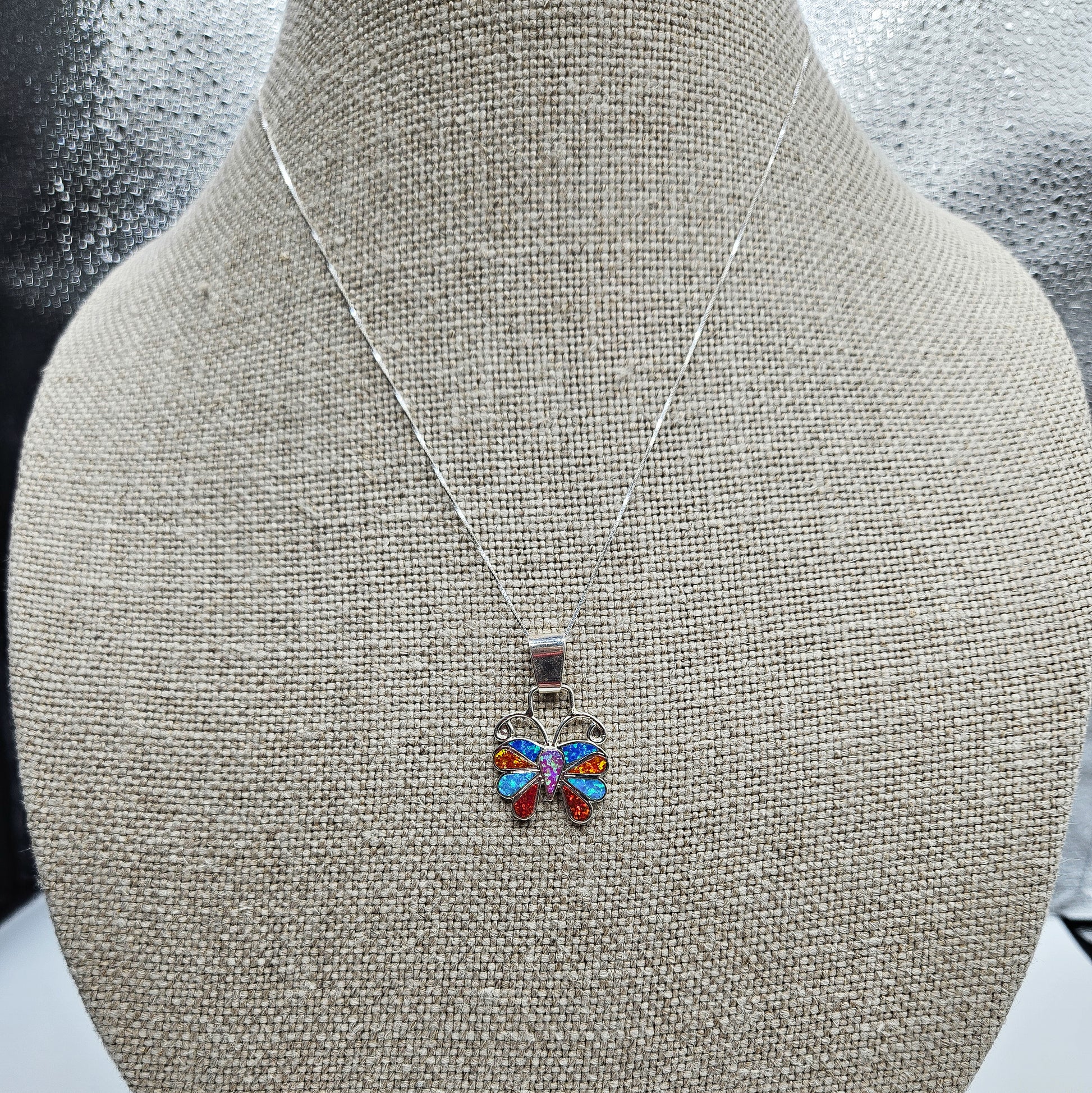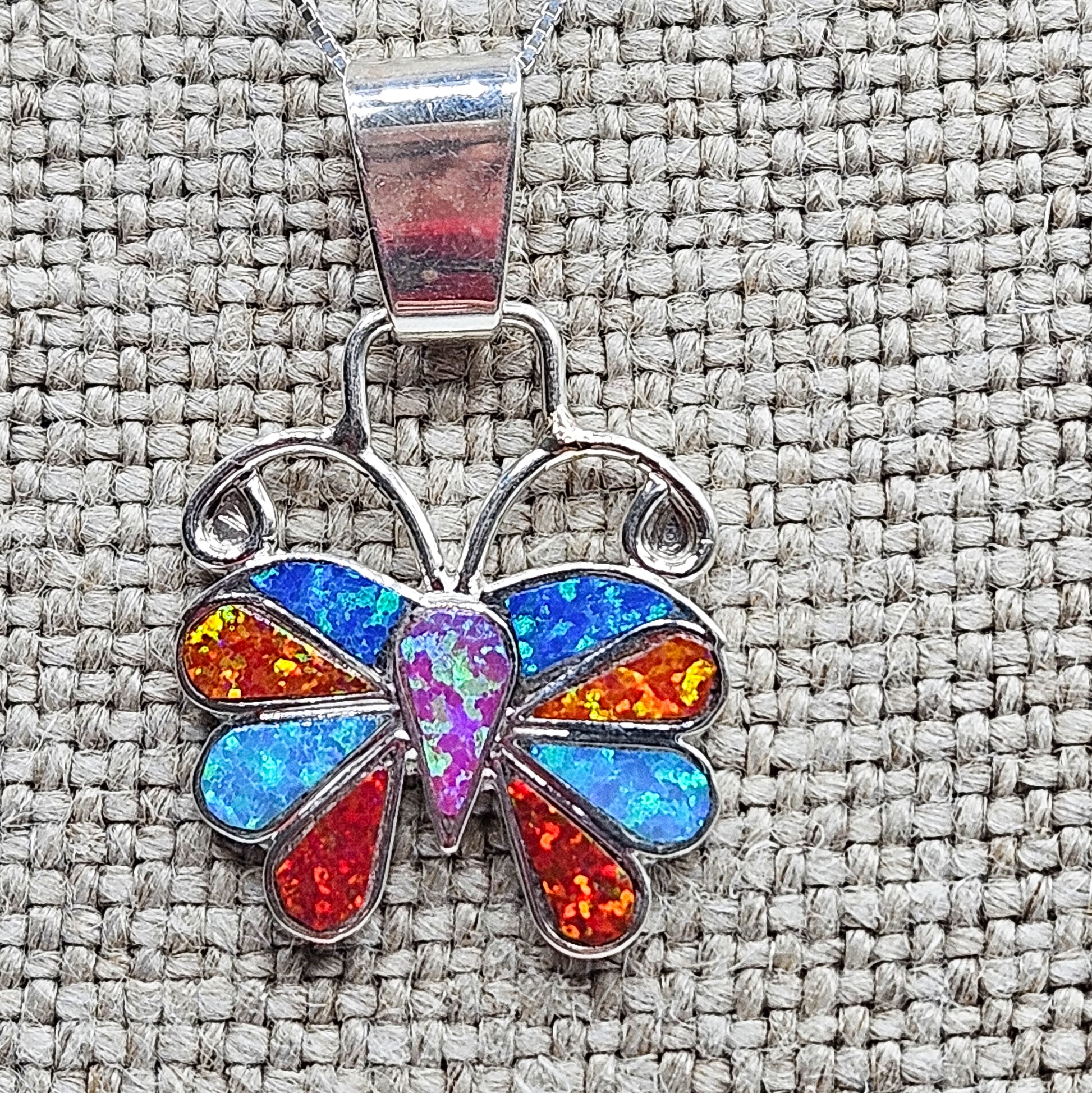 Pueblo peoples opal inlay 20mm butterfly with an 18" sterling silver box chain. This pendant is one of a kind with no two exactly the same and created by indigenous artists.