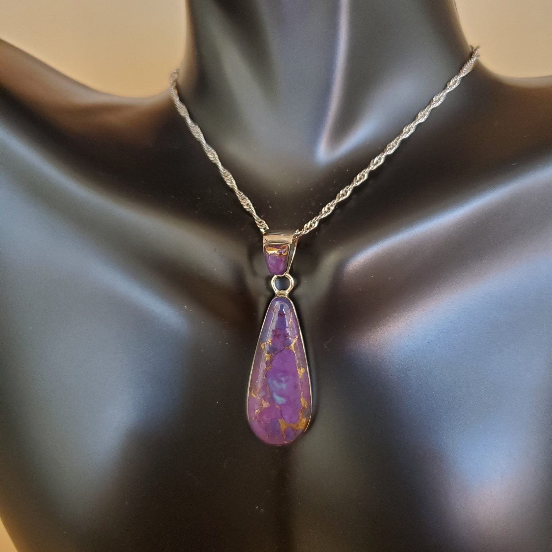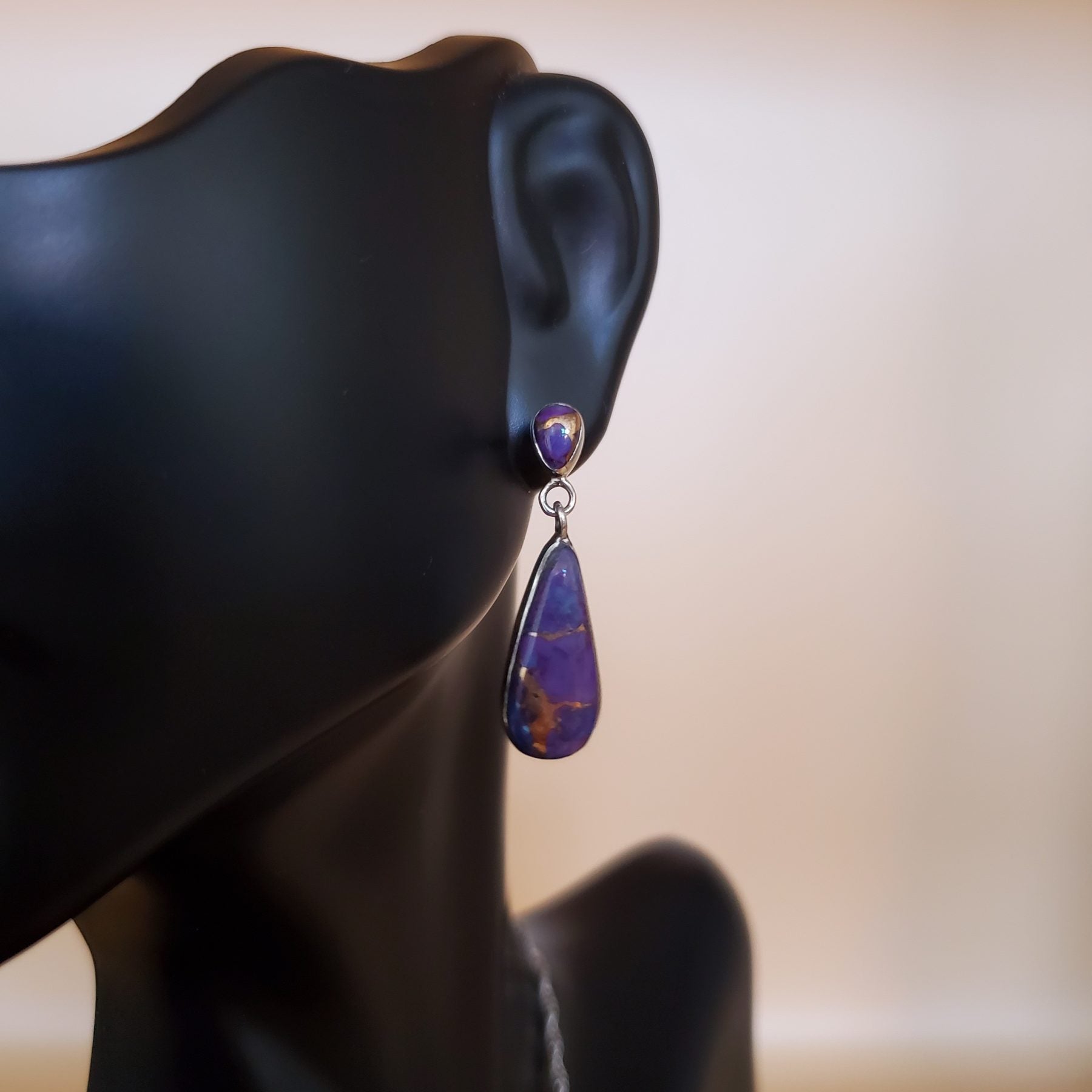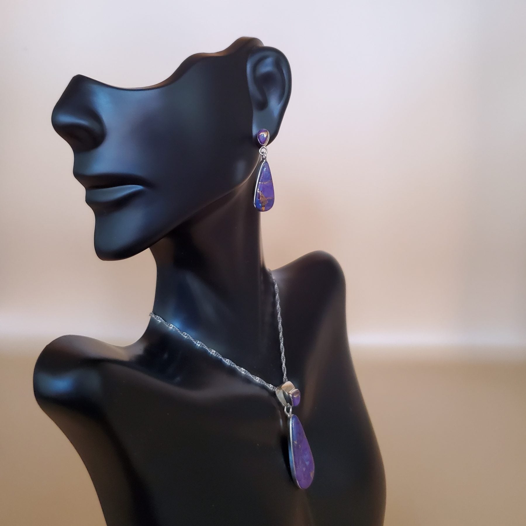 Purple Mohave Turquoise Teardrop Shaped Pendant and Earring Set. Pendant is 37mm in length and post style dangle earrings are 26.5mm in length. Chain shown in photo not sold with set but can be purchased separately (item#334).