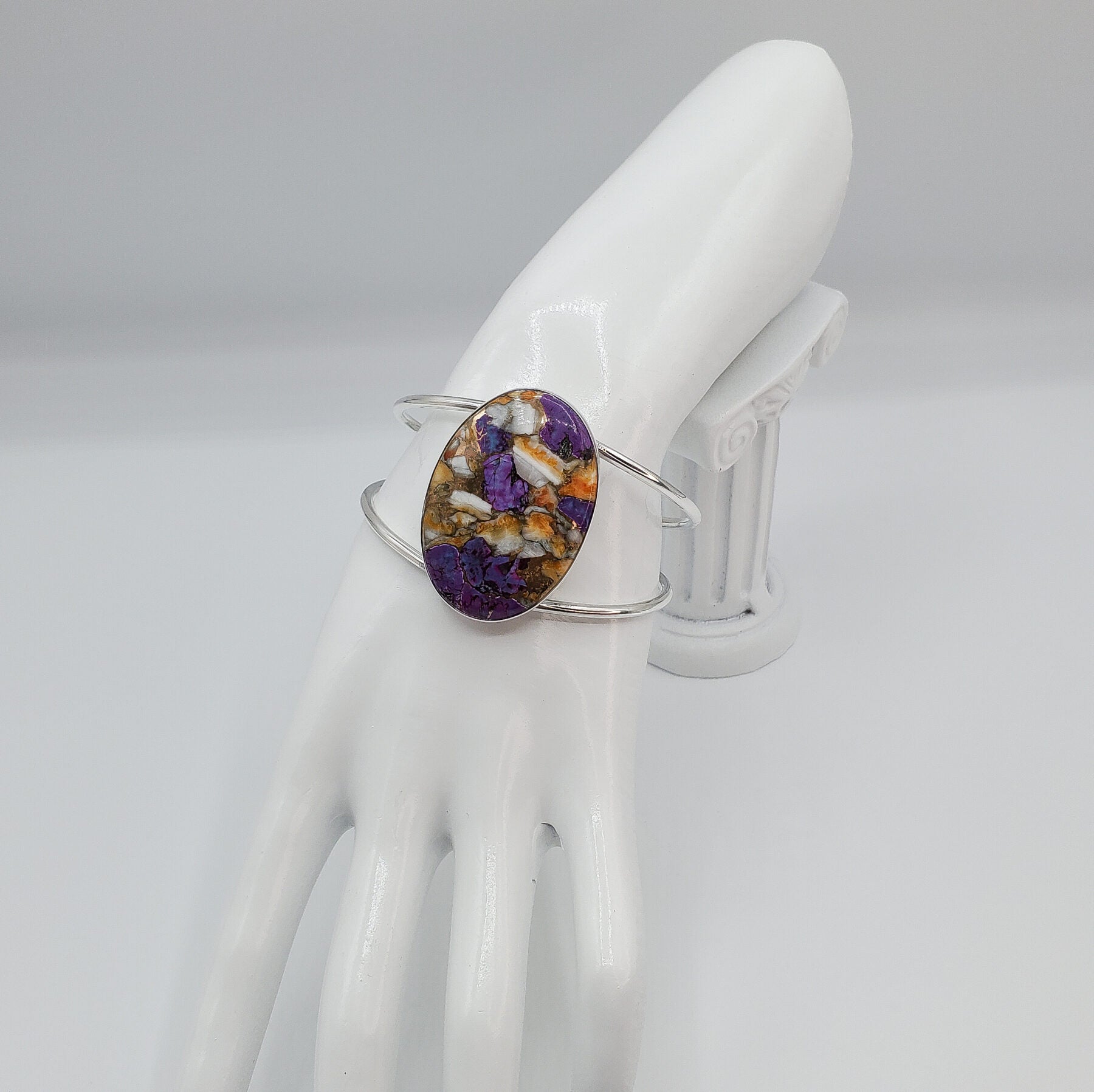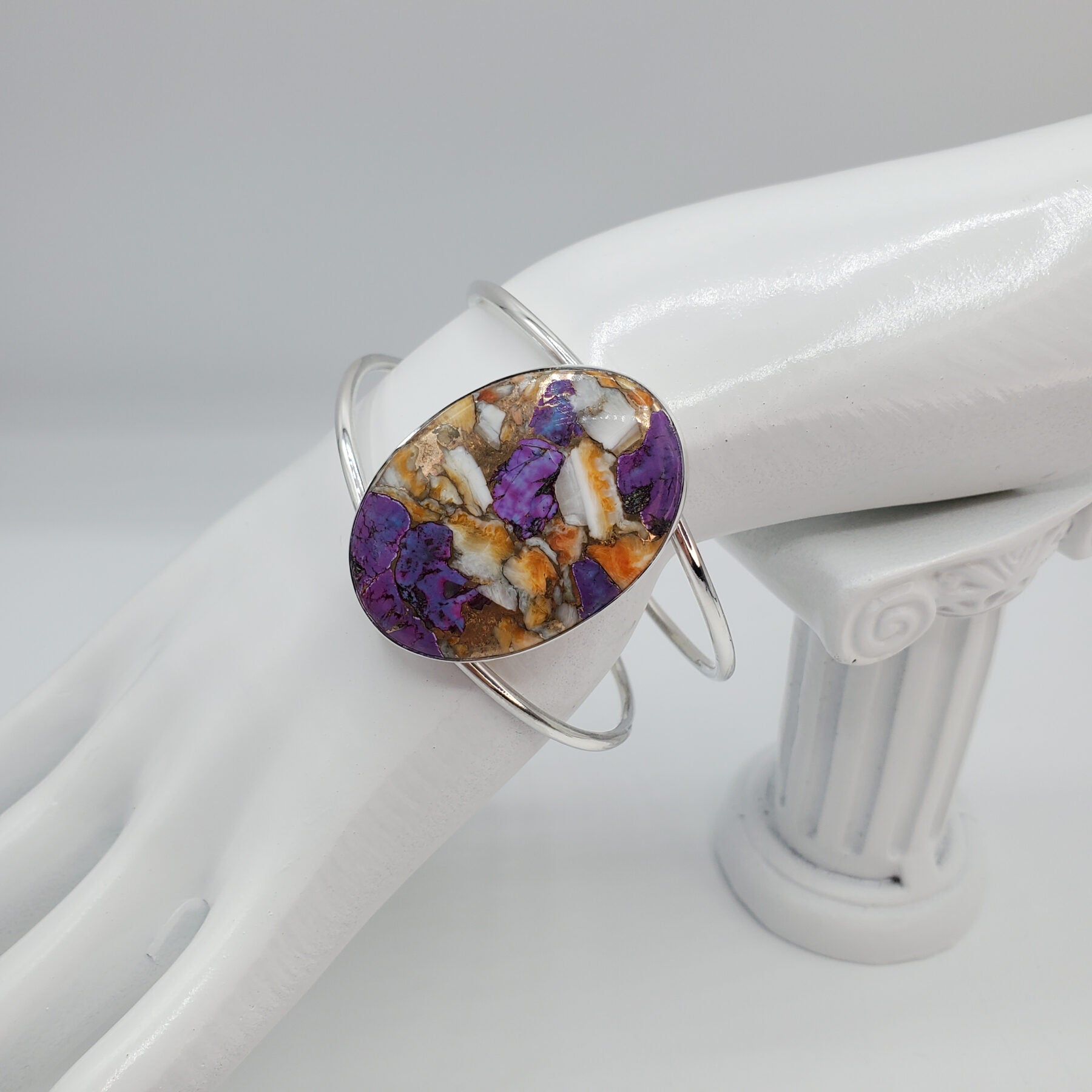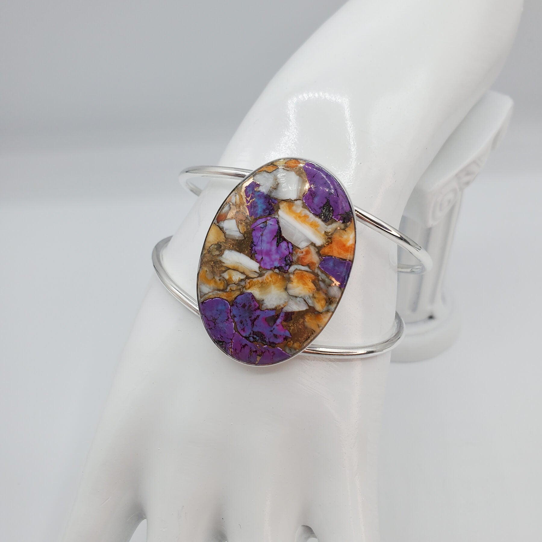 .925 Sterling Silver Purple Oyster Turquoise cuff bracelet with a cabochon 43mm x 30mm. This bracelet is so unusual in its beauty with a mix of copper, purple, and orange bouncing off each other to create the design. Truly one of a kind!